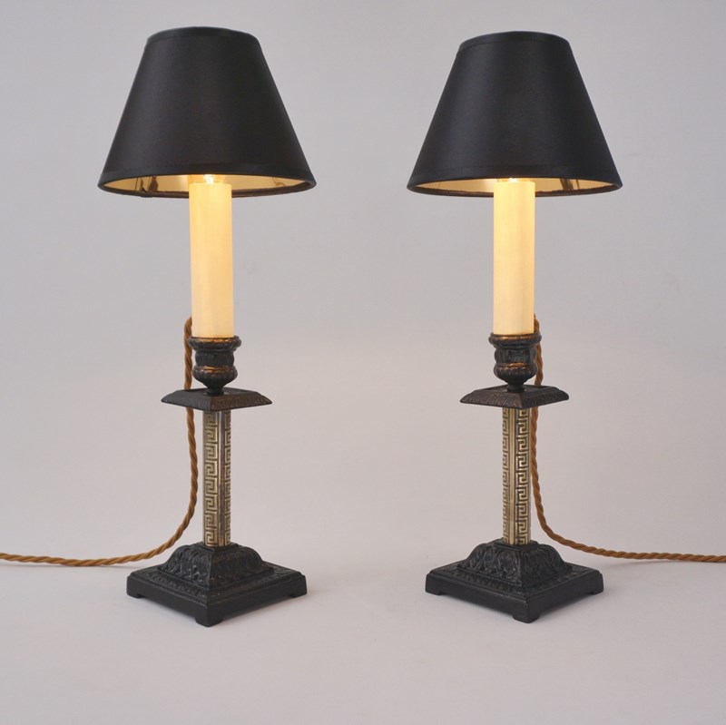 Pair Antique Candlestick Table Lamps, Aesthetic Movement, Iron & Brass
