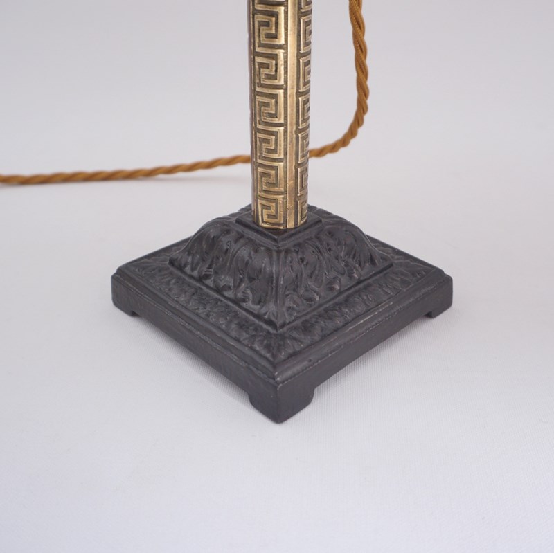 The eclectic design consists of a tubular column of polished brass with a geometric Greek key decoration. The column leads to the ornate square drip pan & sconce in patinated iron. This is followed by a new lamp holder covered by a new cream card candle tube.