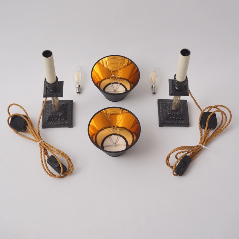 Each lamp is finished with a new clip-on black silk lampshade lined metallic gold. This complements the tones of the base.