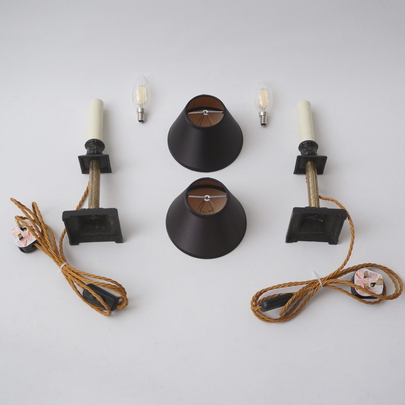 This pair of antique lamps have been gently cleaned while respecting the aged patina. They are newly rewired, earthed, PAT tested by an electrician and ready to use. Each has the following new components: lamp holder with a cream card cover, gold silk cable, black cord switch, black plug (UK Plug up to 250V) & clip on silk lampshade. Lightbulbs included. These lamps can be used with a dimmer. It is possible to use these lights in other countries with a light bulb suitable to local electricity.