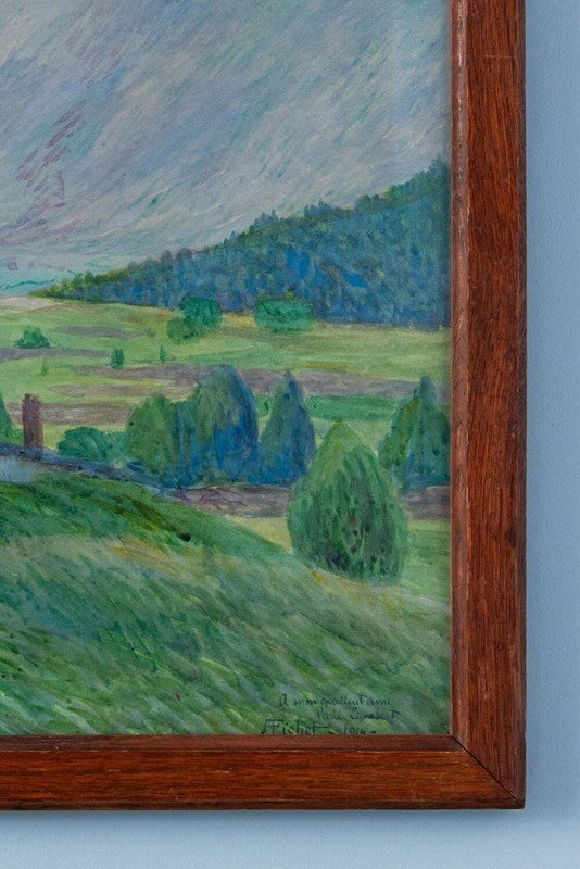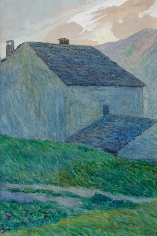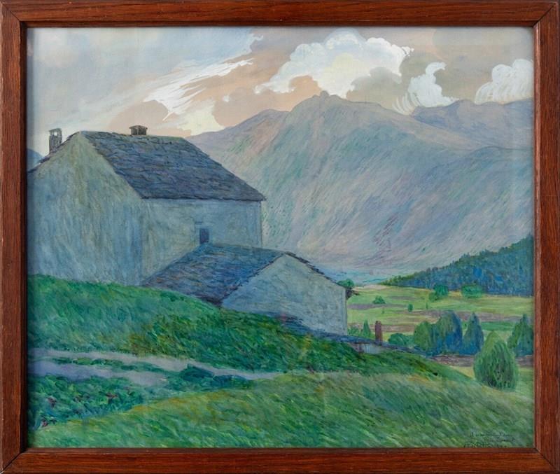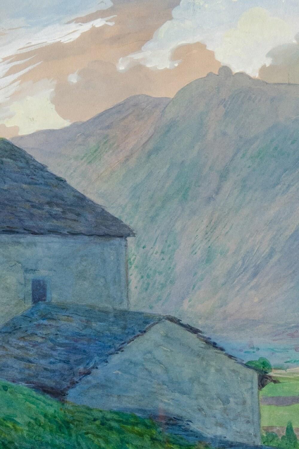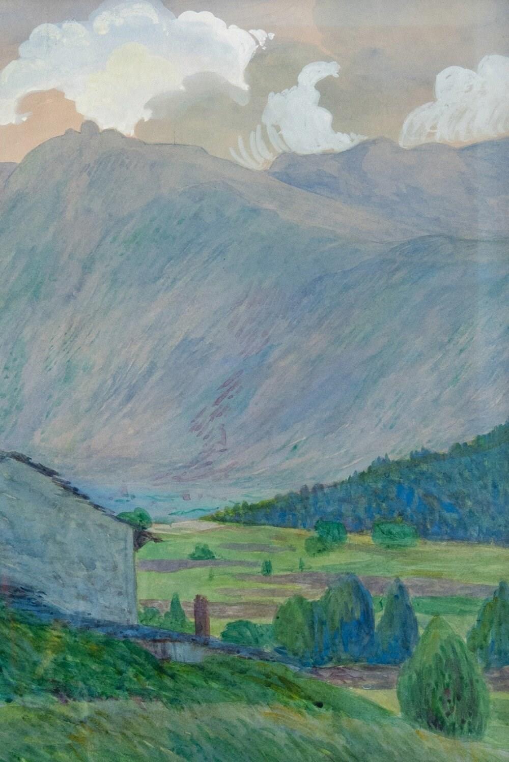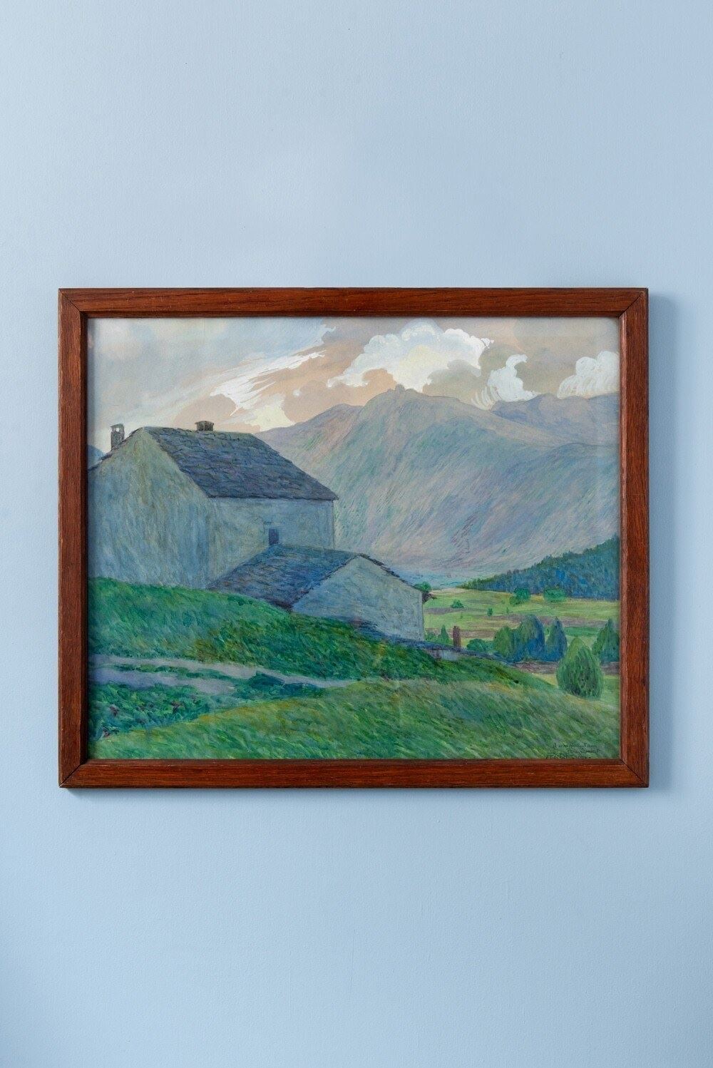Executed in a cool palette of blues, greens, and greys, the work evokes the crisp light and shade of the mountains. Small, expressive brushstrokes add texture to the grass, buildings, and rocky slopes, while vivid touches of gouache bring the white clouds to life. Signed and dated lower right, presented glazed and mounted in its original dark wood frame. A serene yet striking landscape, marked by a captivating composition and evocative colour.