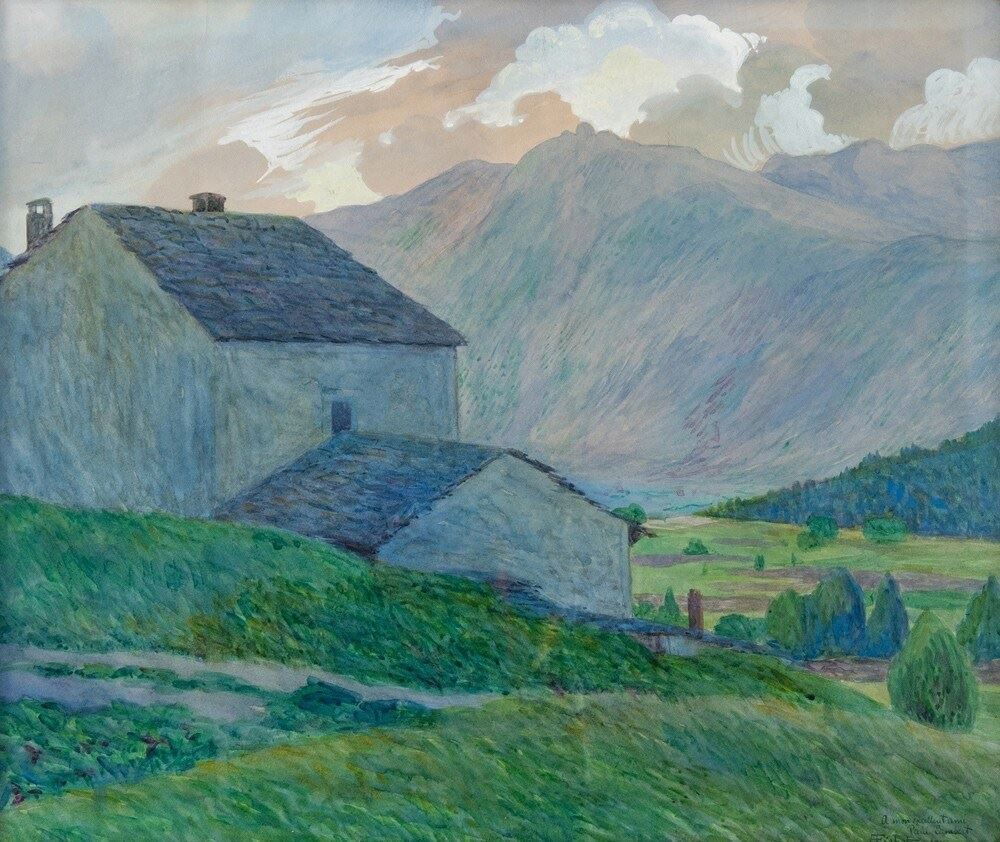 This 1914 watercolour and gouache on paper by French artist Alexandre Fichet (1881–1968) depicts a tranquil mountain landscape, with a house in the foreground leading down to a valley, lake, and towering peaks beyond. The distinctive composition juxtaposes the sculptural shapes of the rooftops with the dramatic mountain range, while a winding path in the foreground lends a sense of seclusion to the scene.