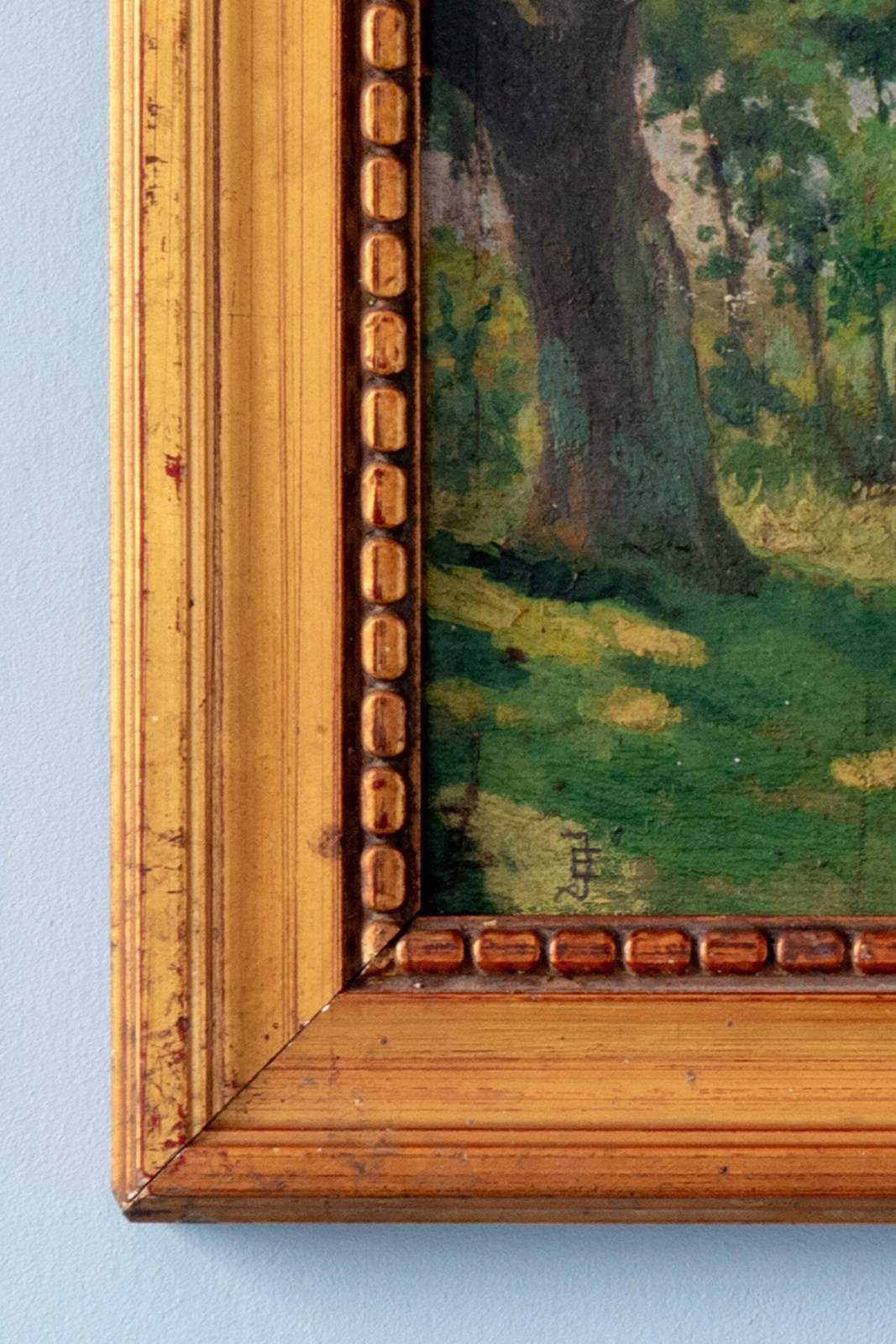 Signed lower left with the artist's monogram and presented in a period gilded frame. A captivating depiction of light and movement in nature, within a striking compact format.