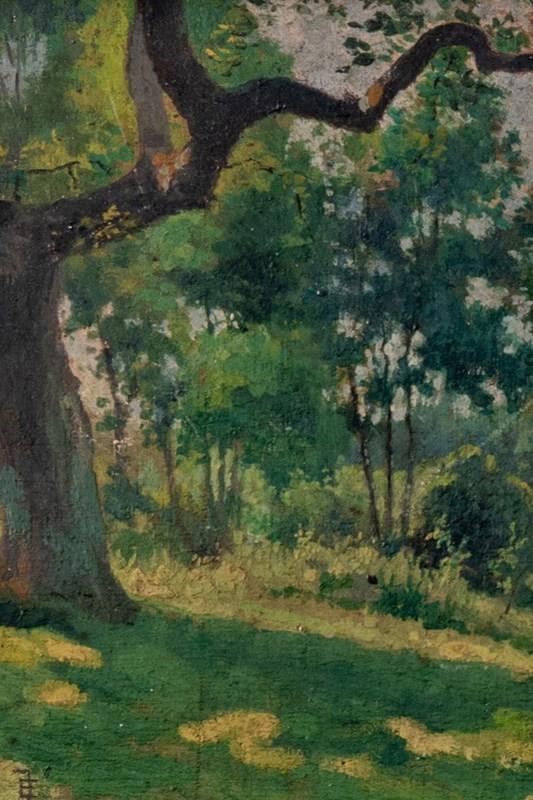 An early 20th-century oil painting on board by French artist Alfred Garcement (1842-1927), depicting a landscape at the edge of a wood. A large tree dominates the foreground, alongside smaller trees and bushes leading to houses in the distance, each rendered with precision suggesting fine observation.