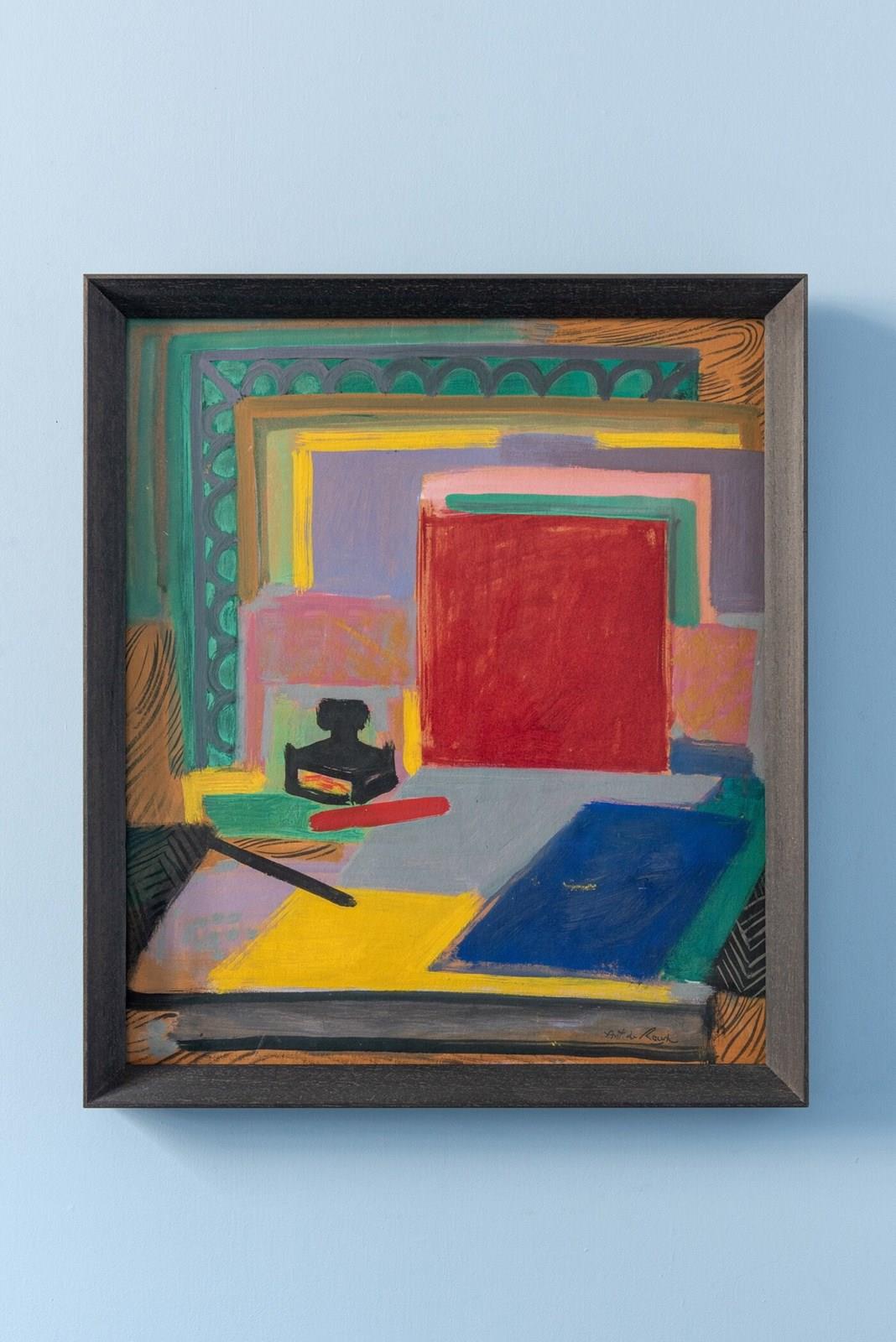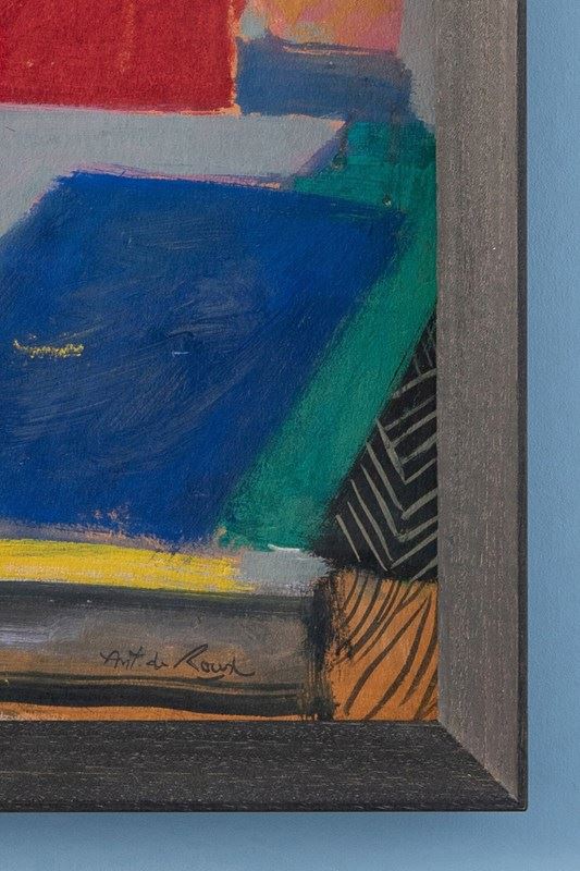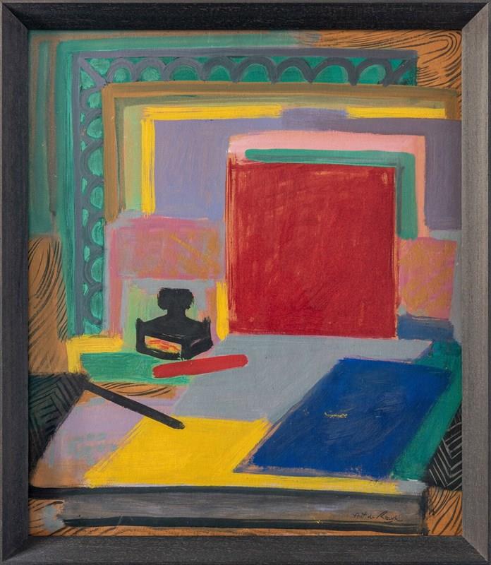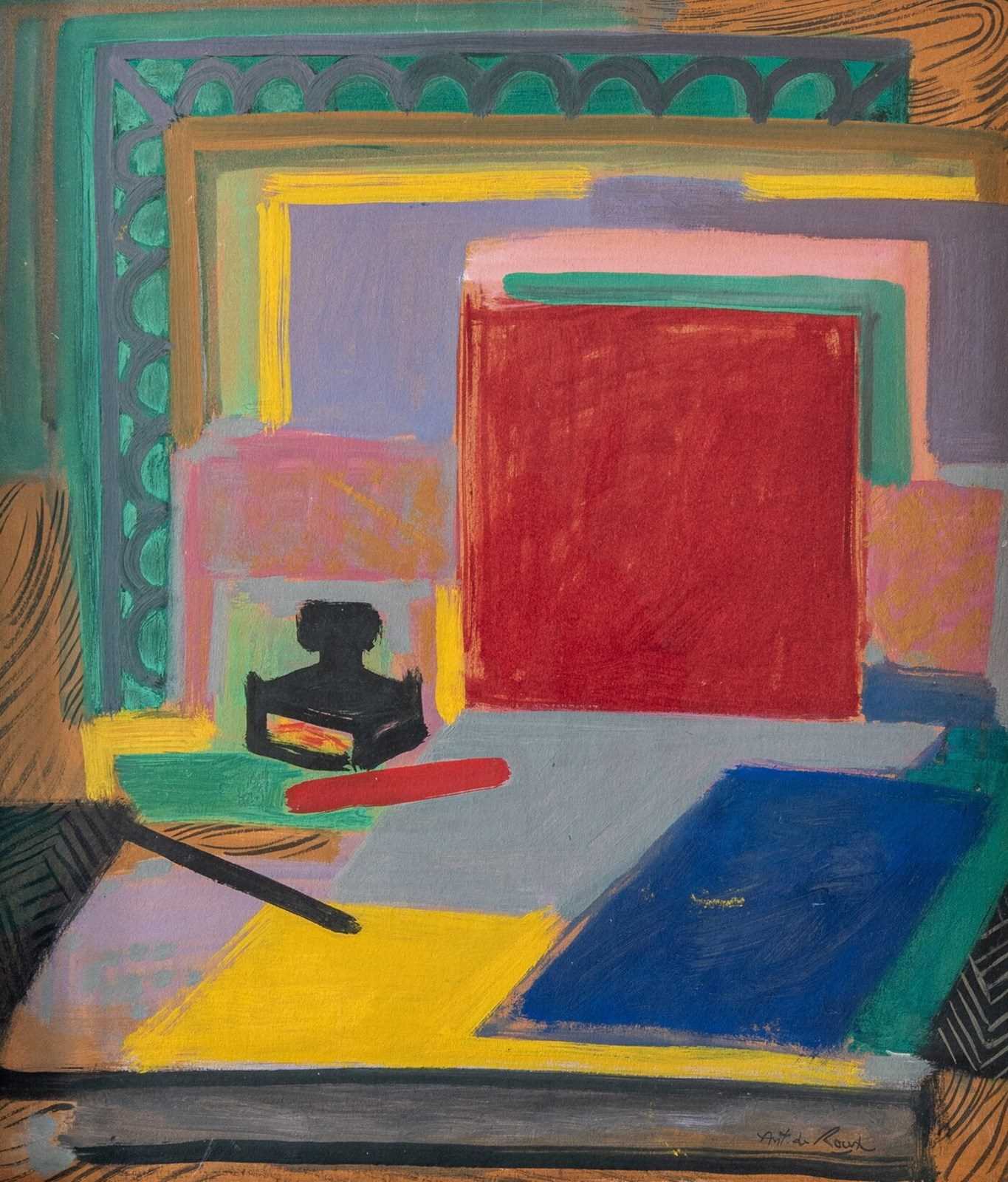 Signed lower right and presented glazed under museum glass in a dark brown modernist frame. Antoine de Roux worked from the 1930s to the 1960s, focusing primarily on interior scenes and still lifes. While his earlier works retain a naturalistic, almost naïve approach to objects, his later paintings, such as this one, favour abstraction, while maintaining a consistent interest in interior space, colour structure and decorative presence.