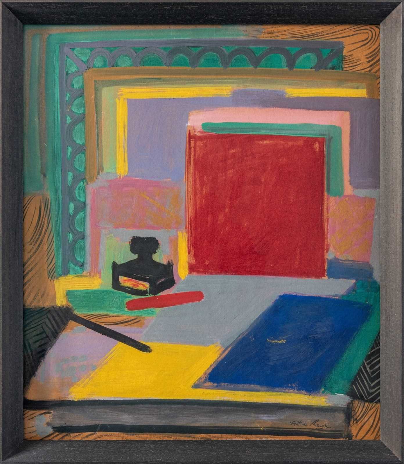 A mid-century oil painting on board, c. 1950–1960, by French painter Antoine de Roux (1901-1986), depicting an interior still life centred on an inkwell and pencils, arranged alongside paper cards on a tabletop. The background is animated by an abstract composition of rectangular forms, bordered by a frieze of scalloped motifs, while the overall scene is framed by wood-grain patterns.