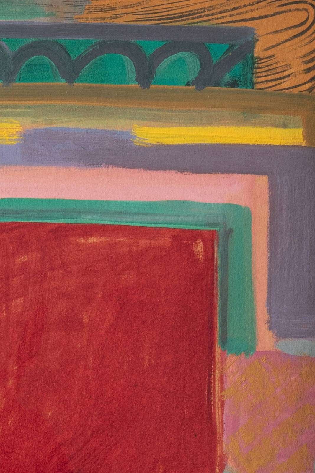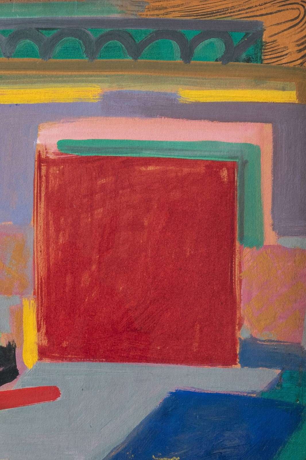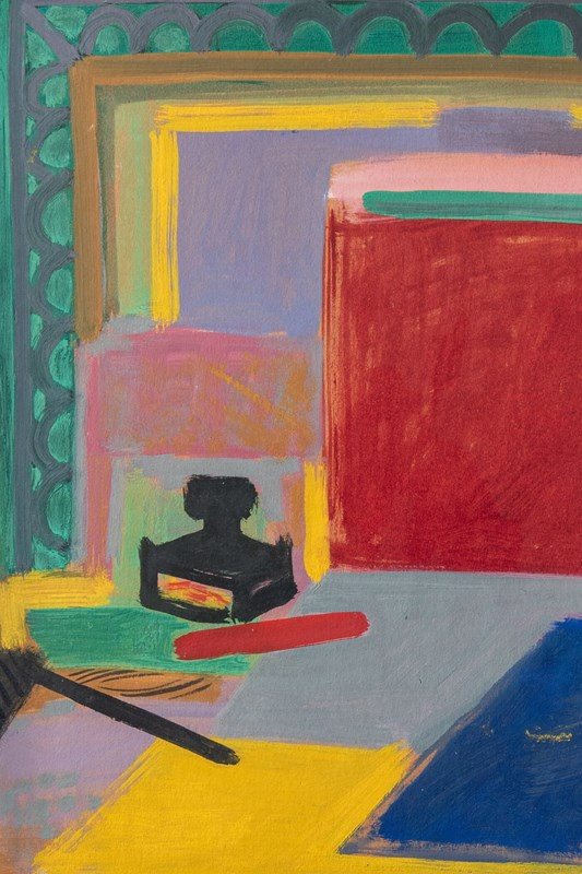 A bright and assured palette of red, blue, yellow and green, structured by black accents, gives the composition rhythm through geometric planes of colour and decorative pattern, balancing a sense of perspective with abstraction and colour experimentation.