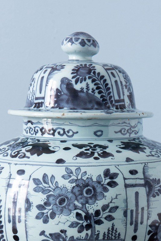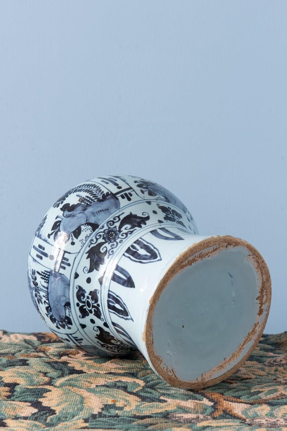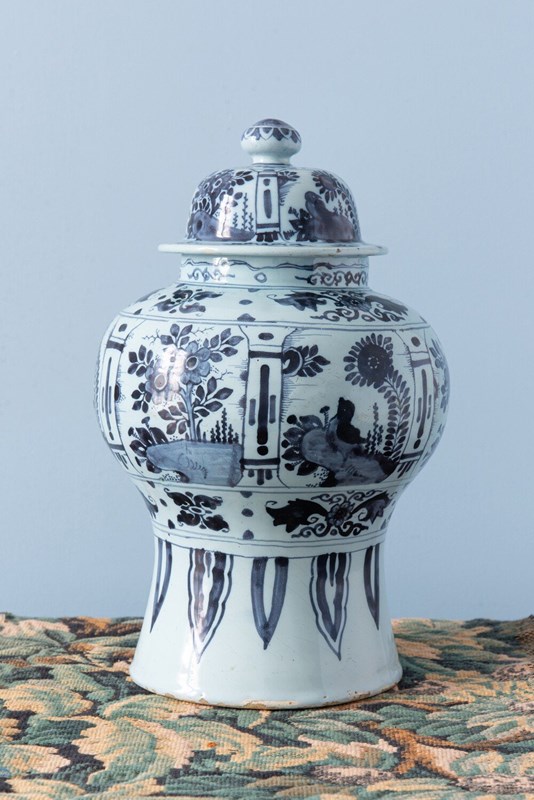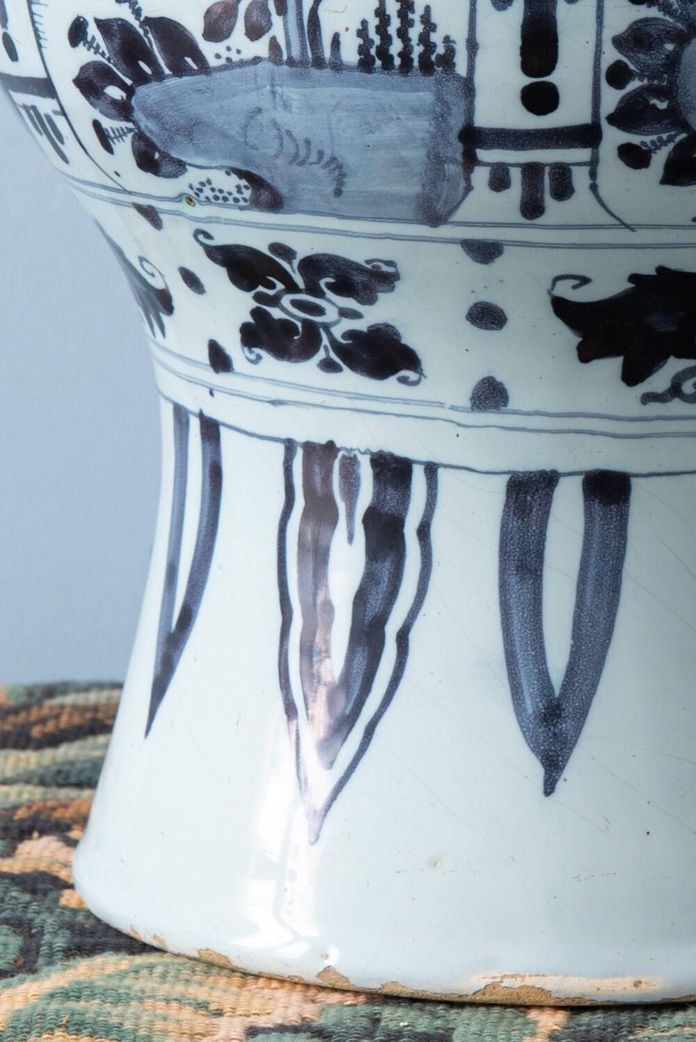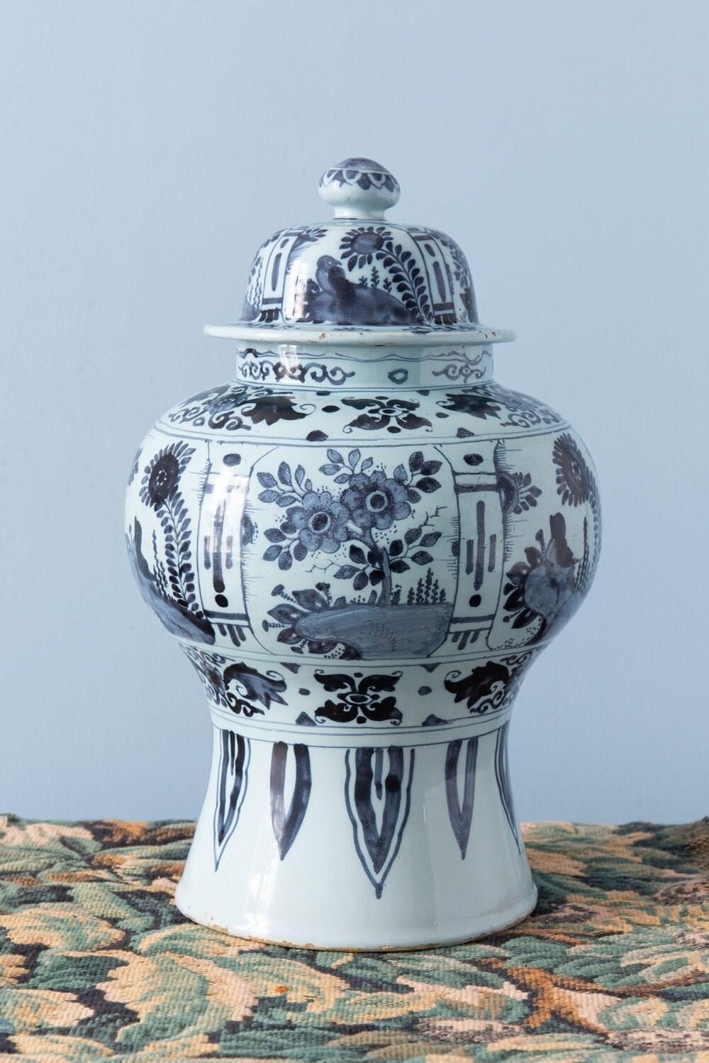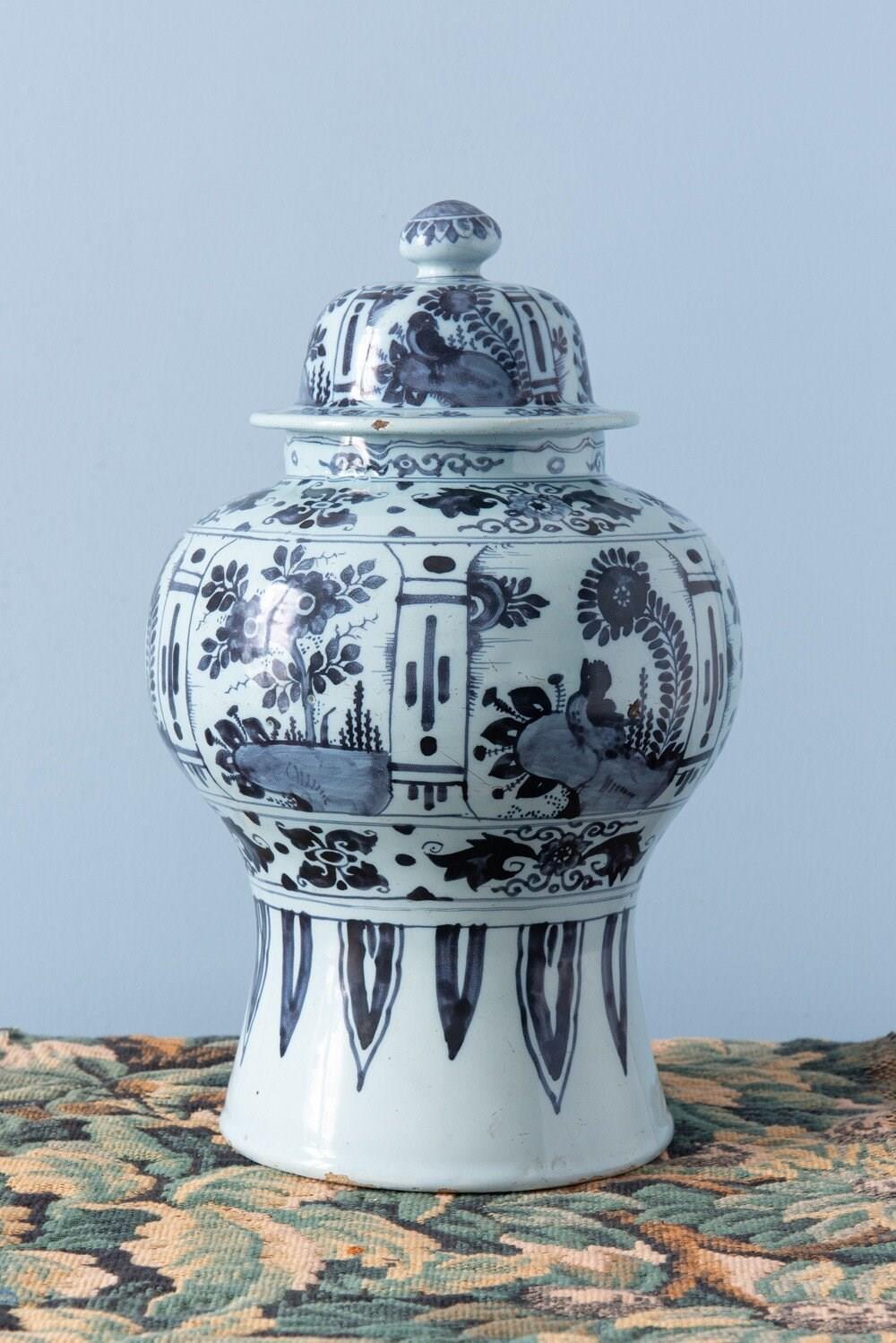 Decorated in blue on a pale blue ground, this early 19th-century Delft jar features Chinoiserie-inspired scenes of oversized flowers and shrubs beside lakes, framed in reserves and surrounded by floral patterns. Flowing vertical brushstrokes accent the base, while the neck is adorned with graceful scrolls. Of elegant baluster form, the jar is completed by a domed lid decorated with similar intricate floral motifs and scrolls. A timeless piece, distinguished by its harmonious shape and refined decoration.