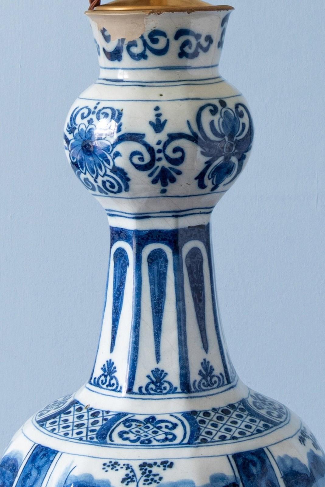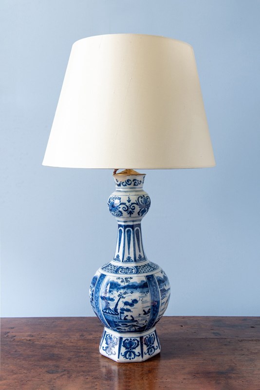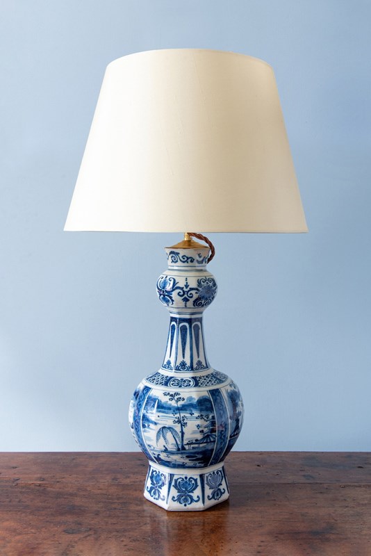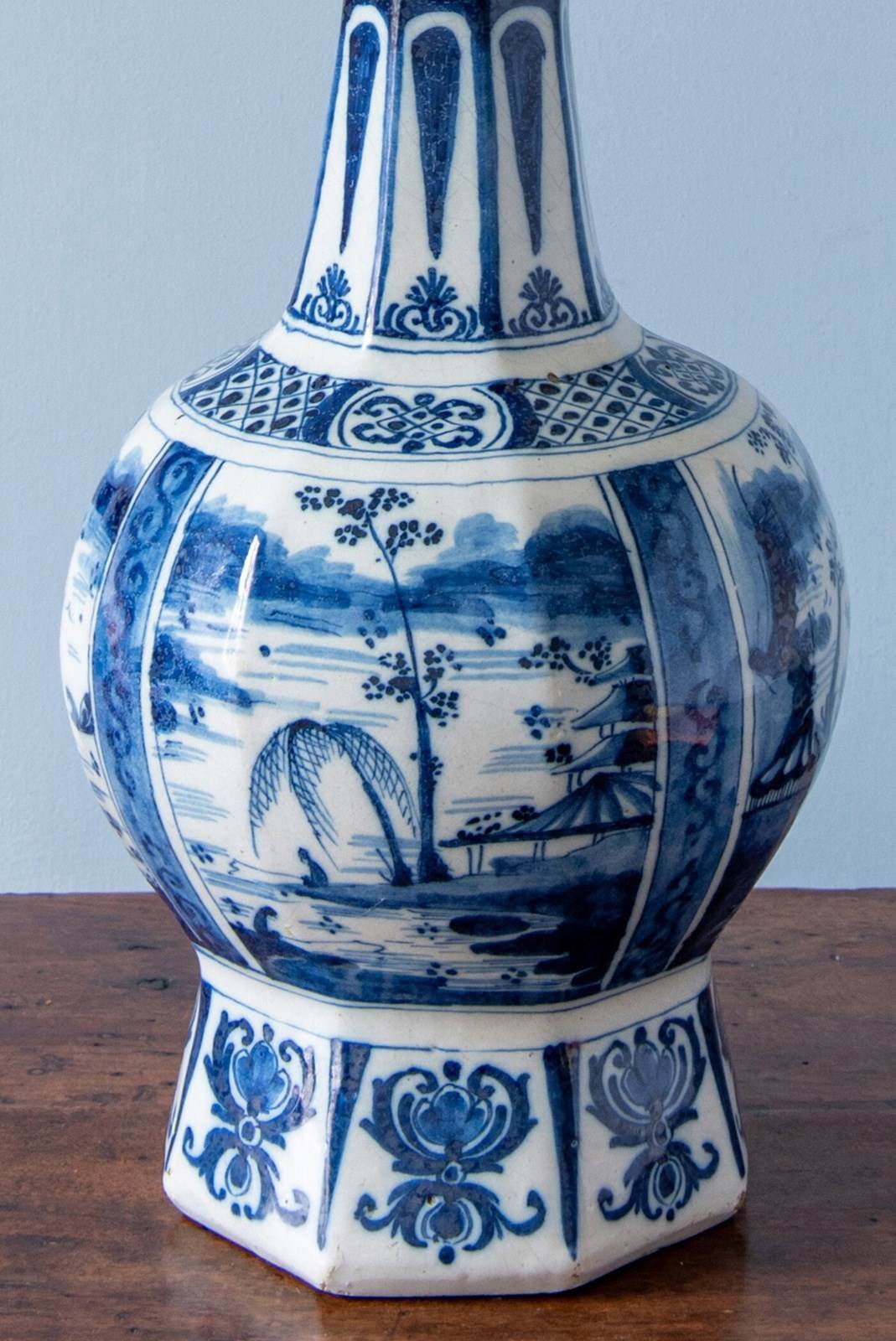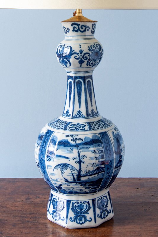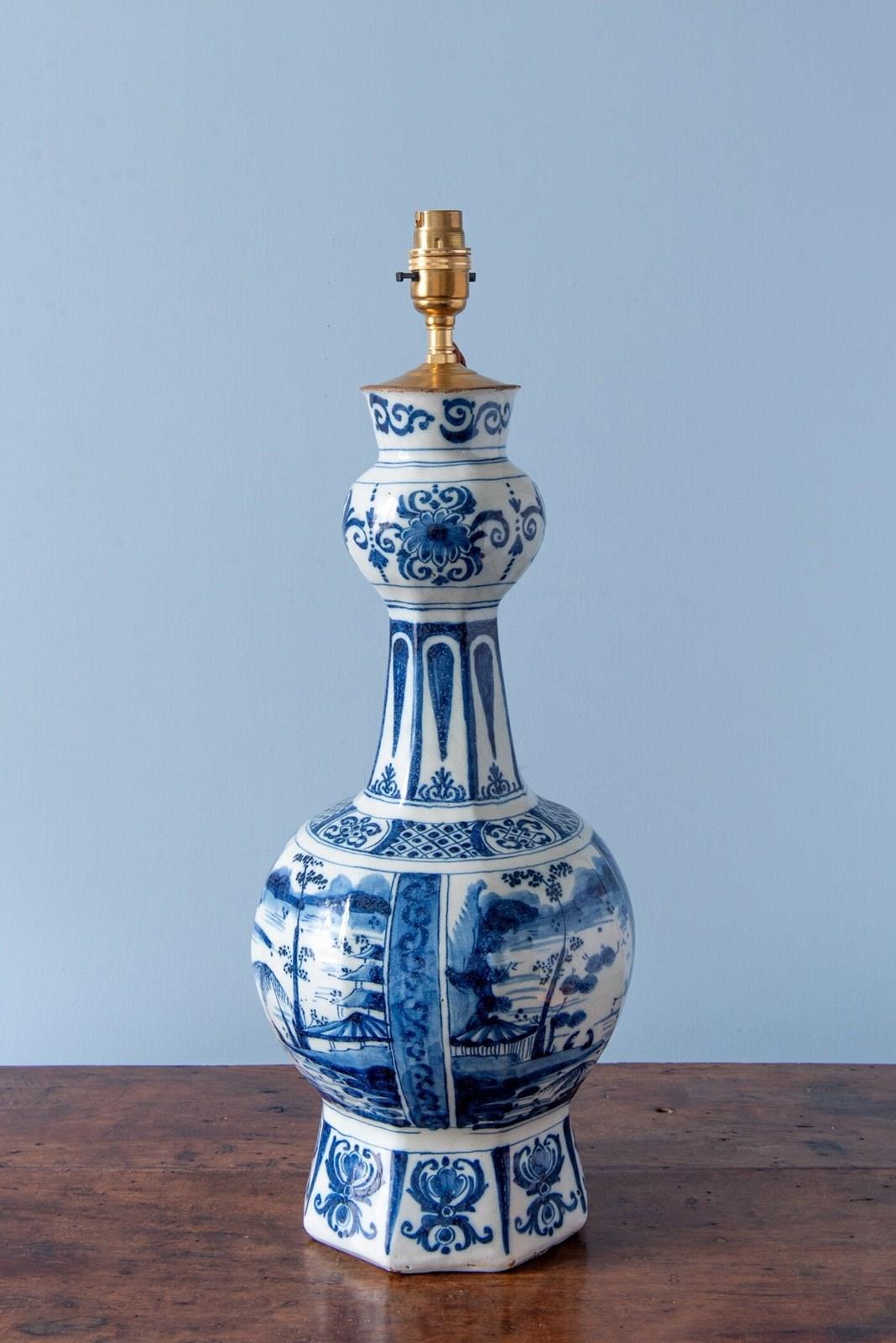 A late 17th to early 18th-century Dutch Delft garlic neck vase, c. 1680-1720, converted to a table lamp, of classic garlic neck form raised on an octagonal base. Decorated in blue and white with four atmospheric Chinoiserie landscapes, depicting figures seated beside a lake, surrounded by trees and buildings with mountains in the distance. The scenes are rendered with a compelling level of detail, the brushwork alternating between fine linework and painterly washes of blue to create movement and depth.