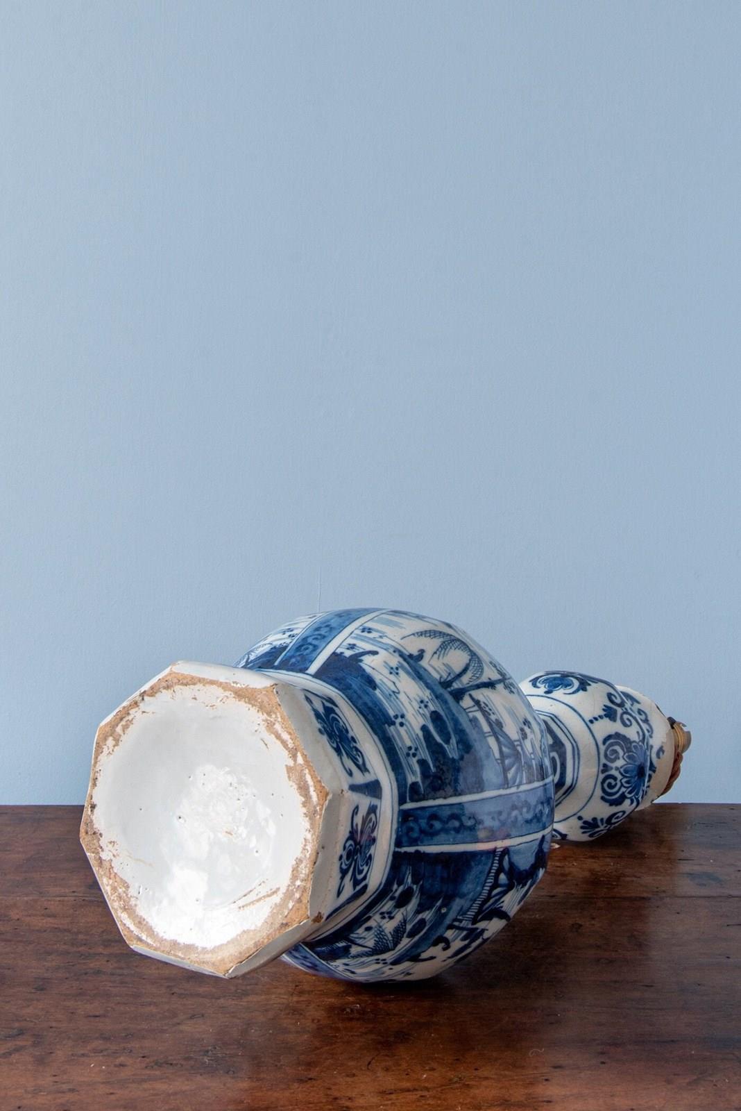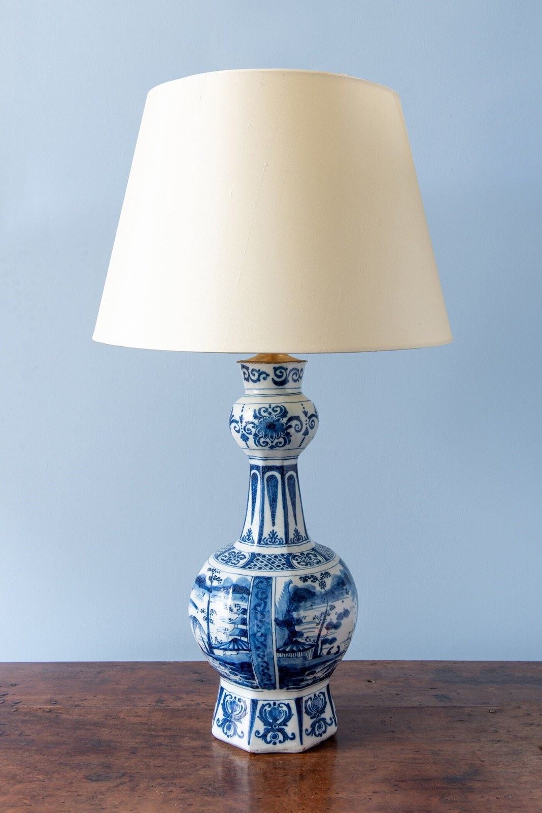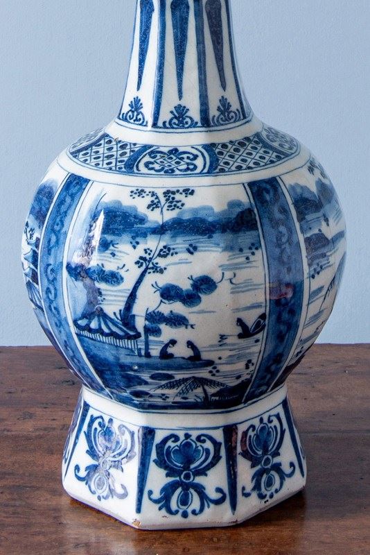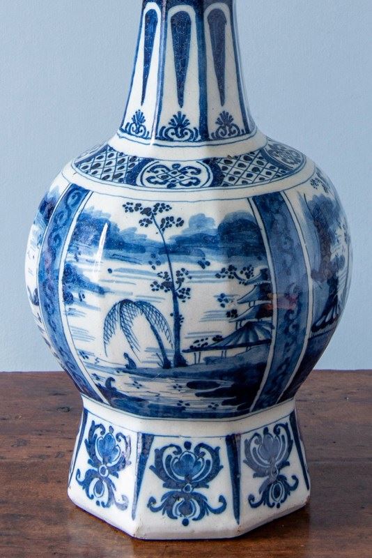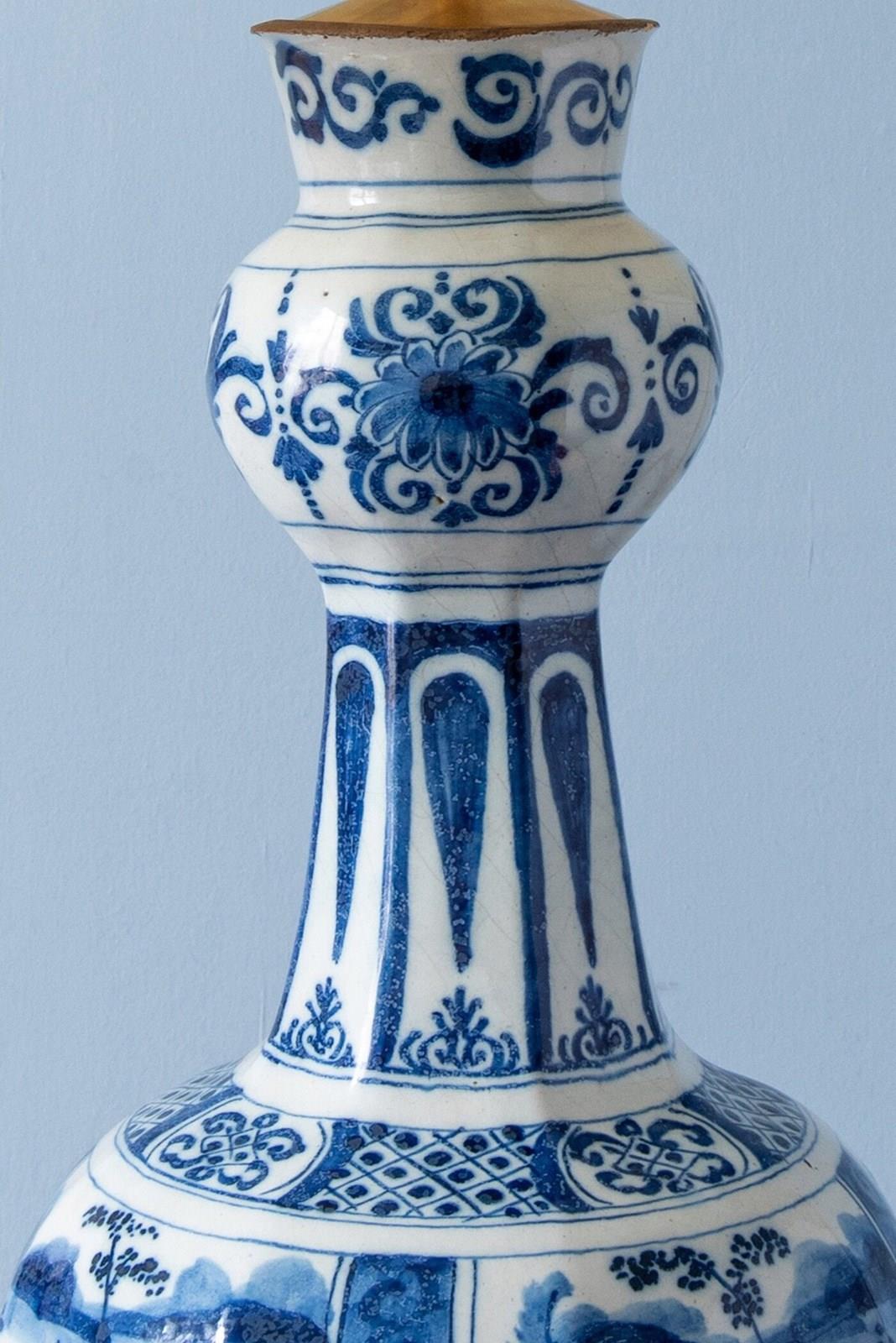 A late 17th to early 18th-century Dutch Delft garlic neck vase, c. 1680-1720, converted to a table lamp, of classic garlic neck form raised on an octagonal base. Decorated in blue and white with four atmospheric Chinoiserie landscapes, depicting figures seated beside a lake, surrounded by trees and buildings with mountains in the distance. The scenes are rendered with a compelling level of detail, the brushwork alternating between fine linework and painterly washes of blue to create movement and depth.
