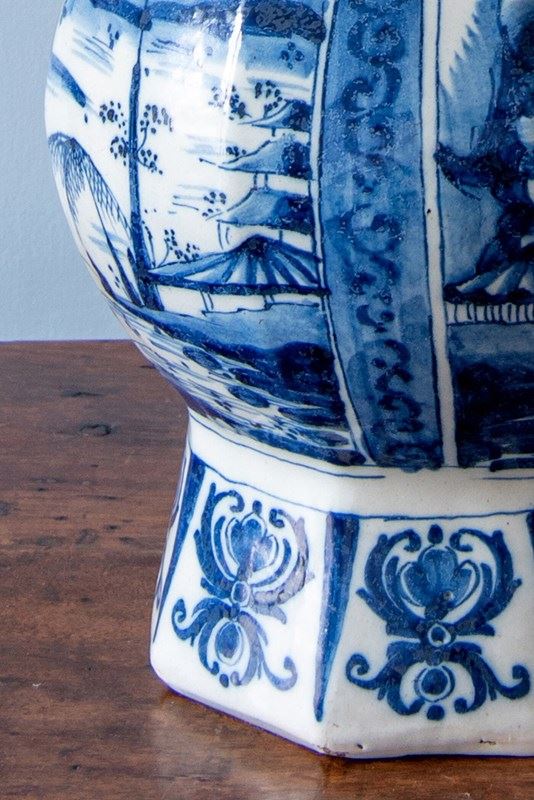 The base and neck are decorated with an array of scrolls, florals, lambrequins, dots and criss-cross patterns. An impressive piece in scale and execution, with the enduring decorative quality of Delft.