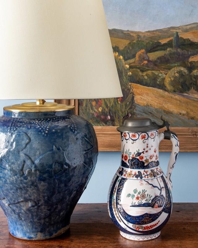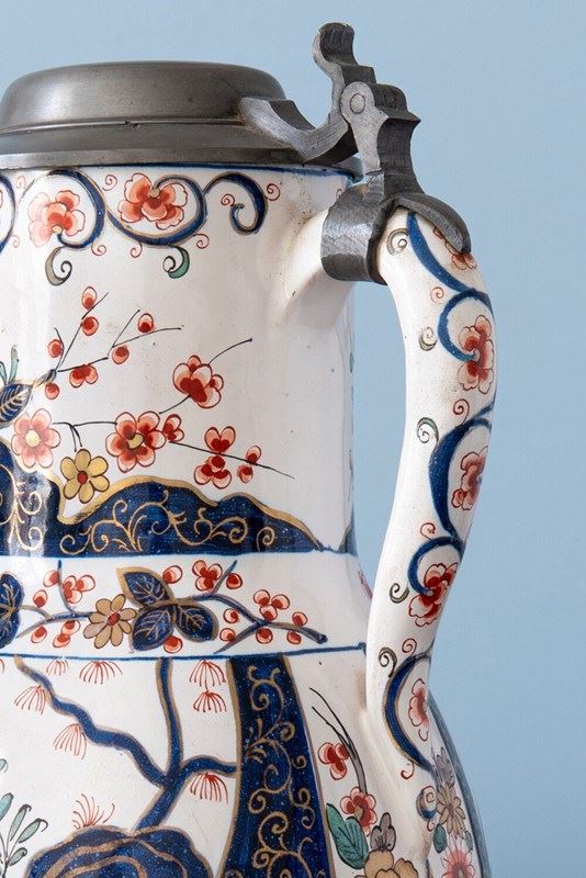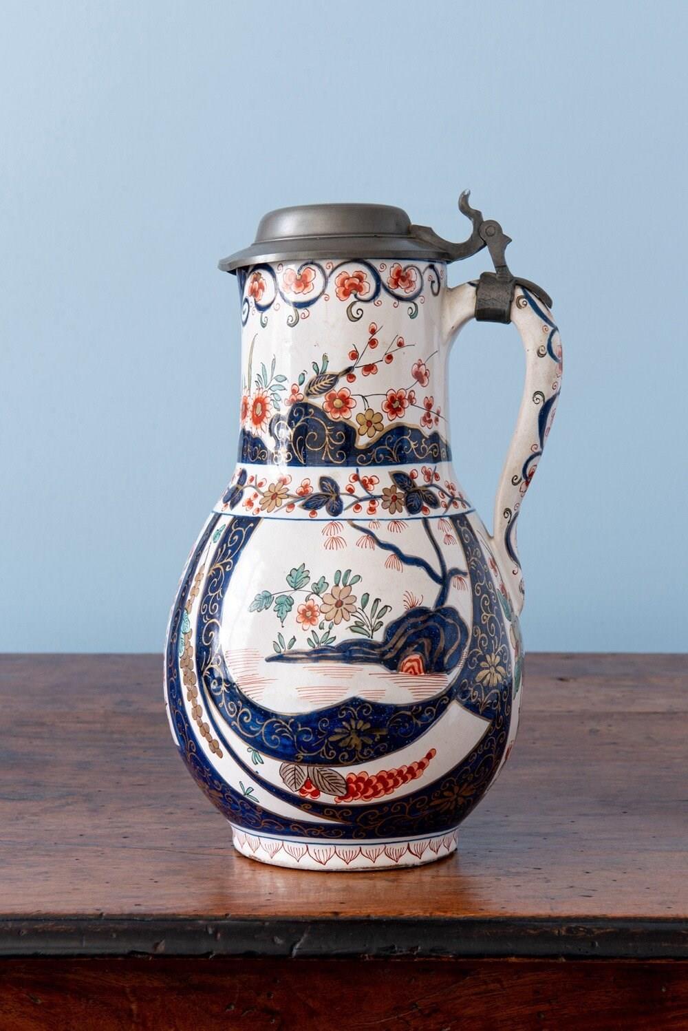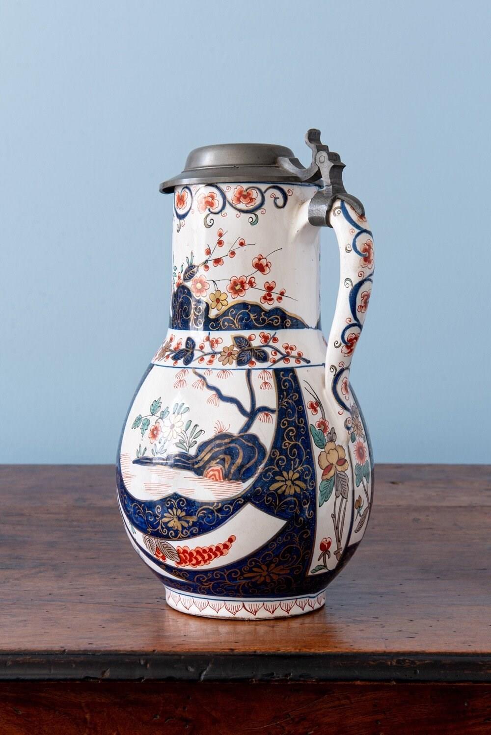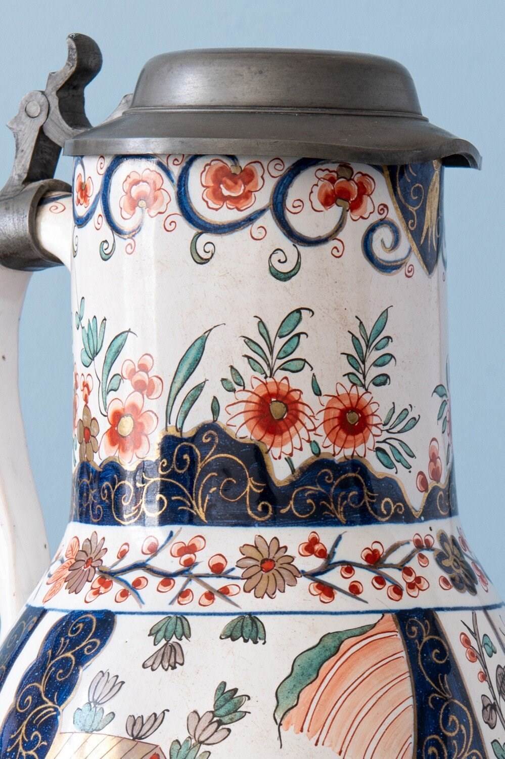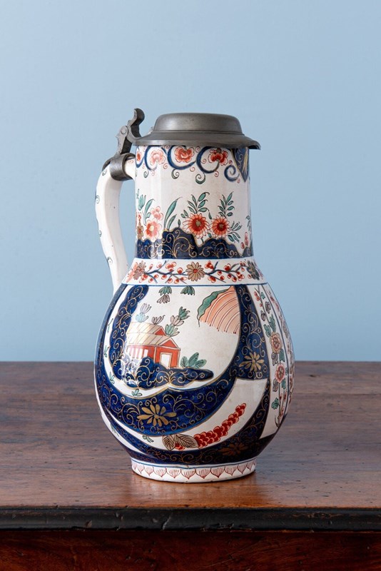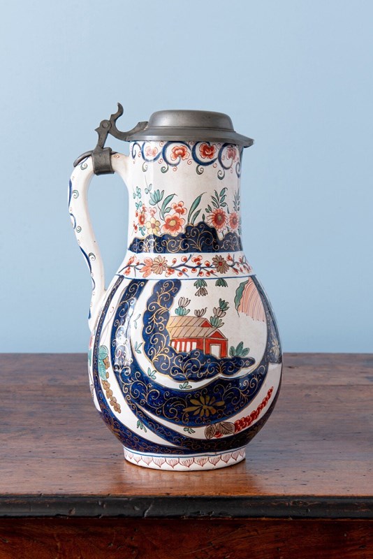 A large early 19th-century Dutch Delft jug with a pewter lid, decorated in a vibrant palette of blue, red, and green, with attractive gold highlights. It depicts houses and a lakeside landscape on either side, set within a dynamic composition of large blue waves, gold scrollwork, and abundant floral motifs. The decoration alternates striking geometric forms with delicate florals, creating a lively and harmonious effect. In excellent condition, a vibrant Delft jug with a striking decor.
