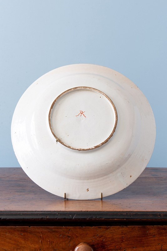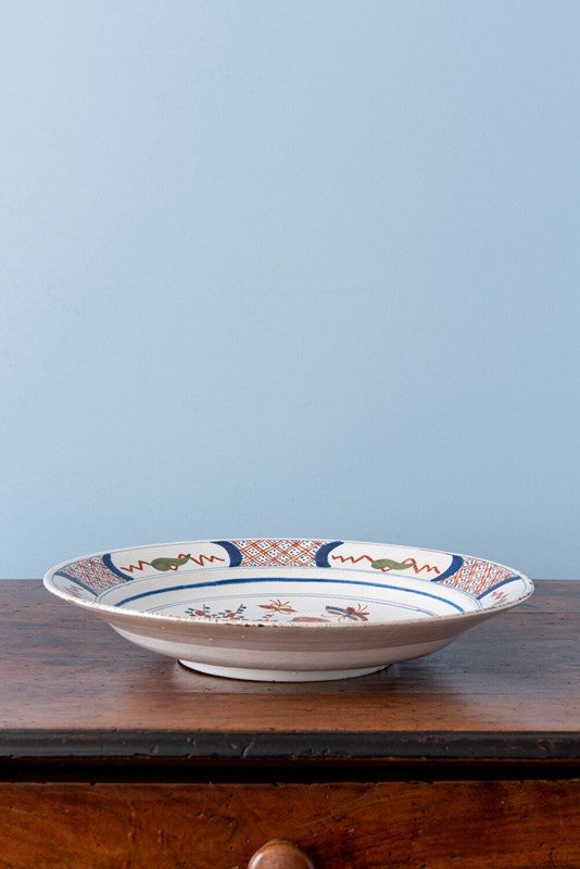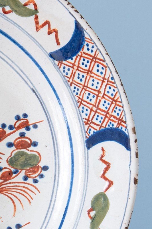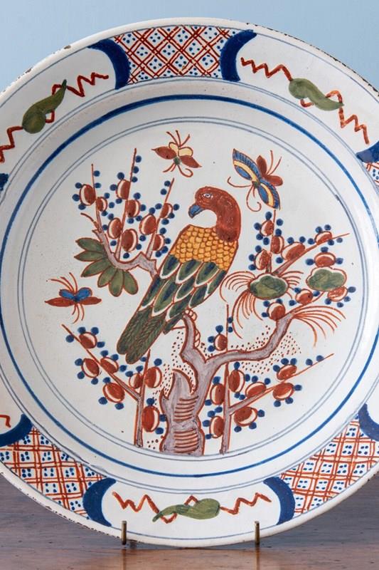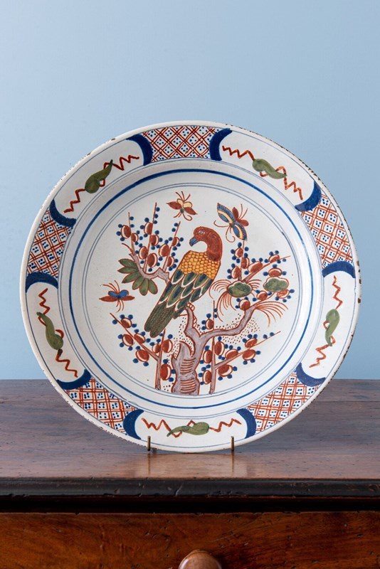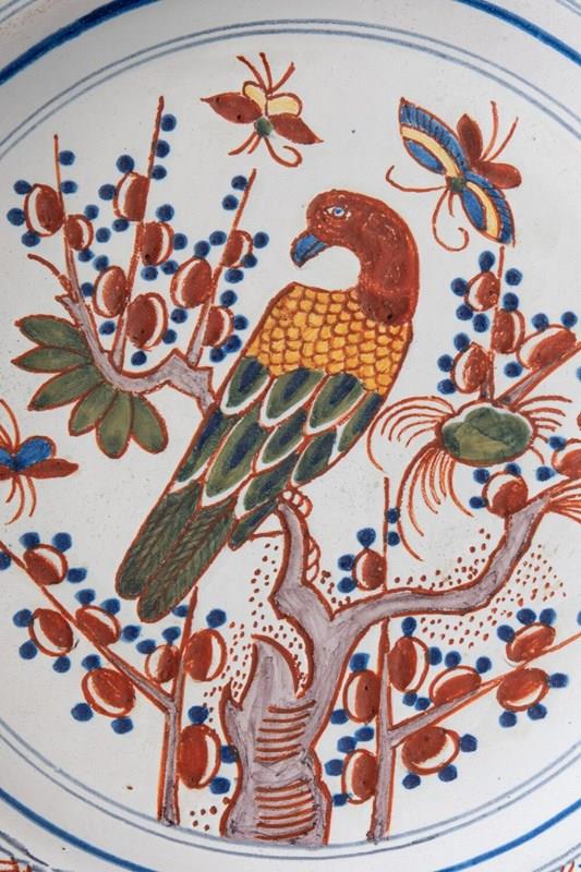 An elegant early 19th-century Dutch Delft dish, decorated in a vibrant palette of red, blue, green, and manganese. The central design depicts a parrot perched on a tree, surrounded by abundant fruits, foliage, and delicate butterflies. The lip is adorned with a frieze of criss-cross dots, alternating foliage, and zig-zag lines. In excellent condition, this charming dish displays lively colour and enduring decorative appeal.