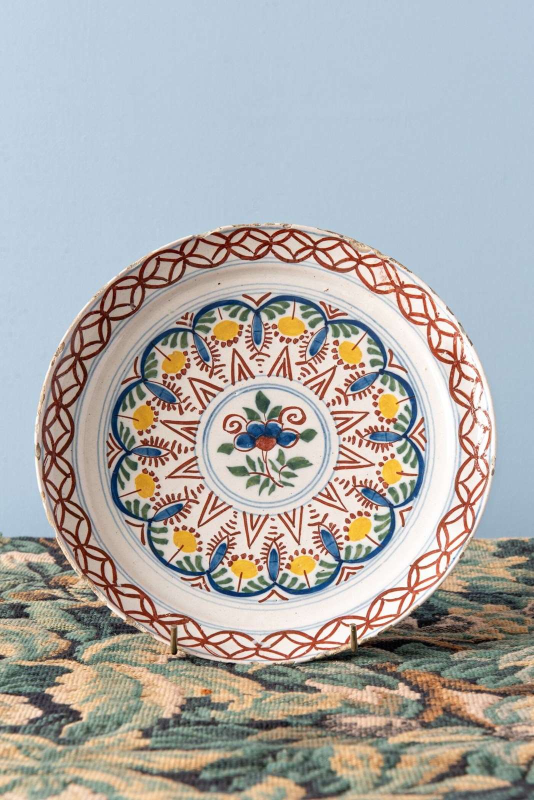 An 18th-century Dutch Delft plate, decorated in a bold polychrome palette of red, yellow, blue and green. The central field features a spray of flowers enclosed in a sunburst, surrounded by vibrant foliate and floral patterns. The lip is finished with a frieze of circles and diaper ornament in red.