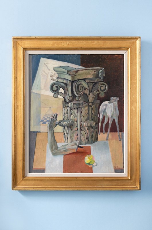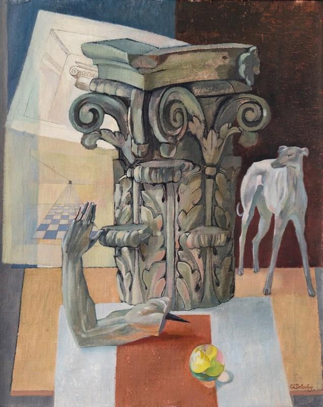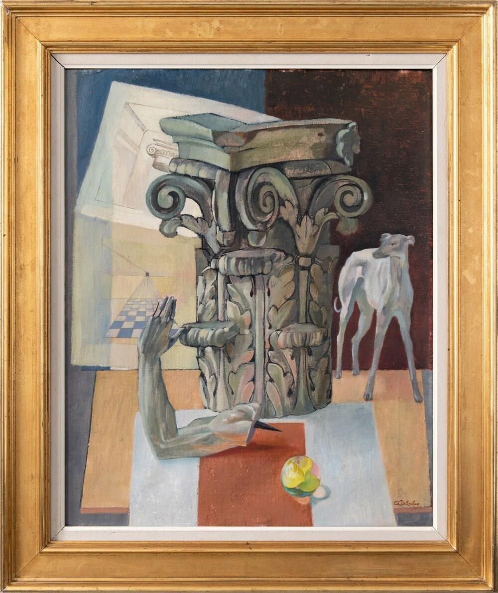 An oil painting on canvas by Belgian artist Edmond Delescluze (1905–1993), presenting a striking still life centred on a column with a richly modelled Corinthian capital. Around it are arranged enigmatic objects—a sculpted arm, a pale greyhound and a piece of fruit on a flat plane of contrasting colour—set against a backdrop of geometric drawings, creating a subtly theatrical and surreal atmosphere.