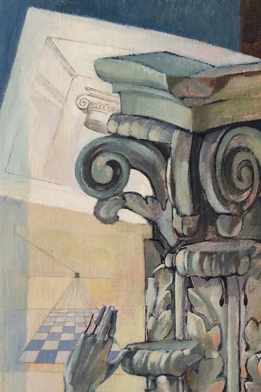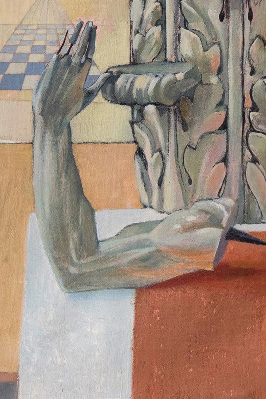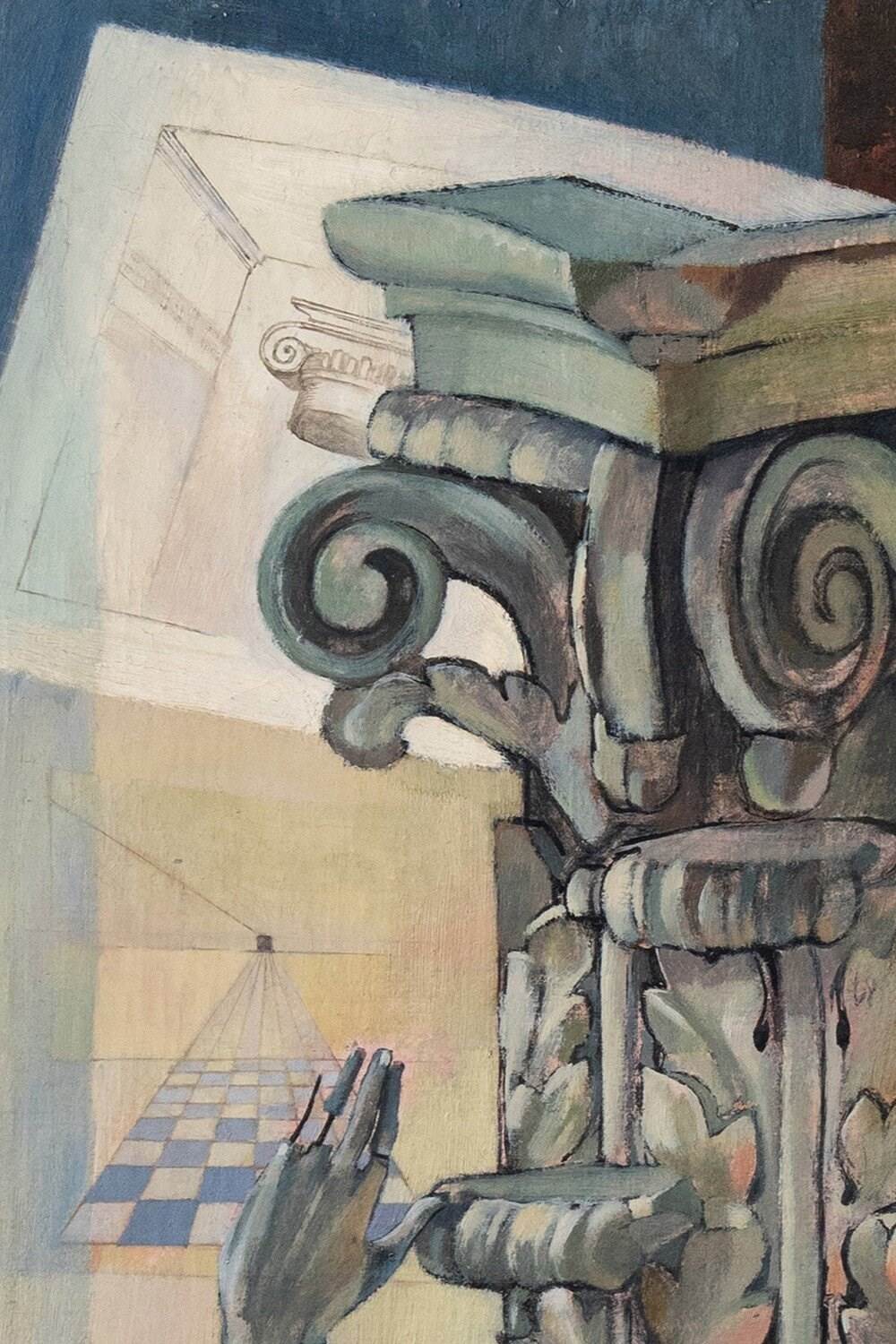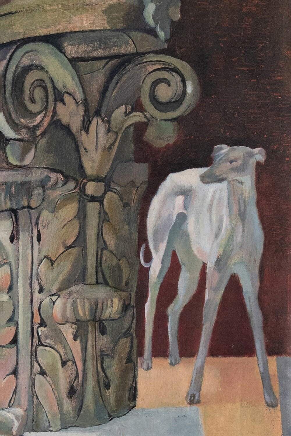 The composition creates a captivating surrealist scene through the unexpected juxtaposition of the monumental capital, the sculptural arm and the poised greyhound. Classical inspiration is evident in the architectural fragment, the precise draughtsmanship and the attention to form, shadow and line that accentuate both the scrolls and foliage of the capital and the geometry of the figures. Rendered in a cool, restrained palette, the architectural element anchors the scene while the surrounding objects contribute to its dreamlike atmosphere.