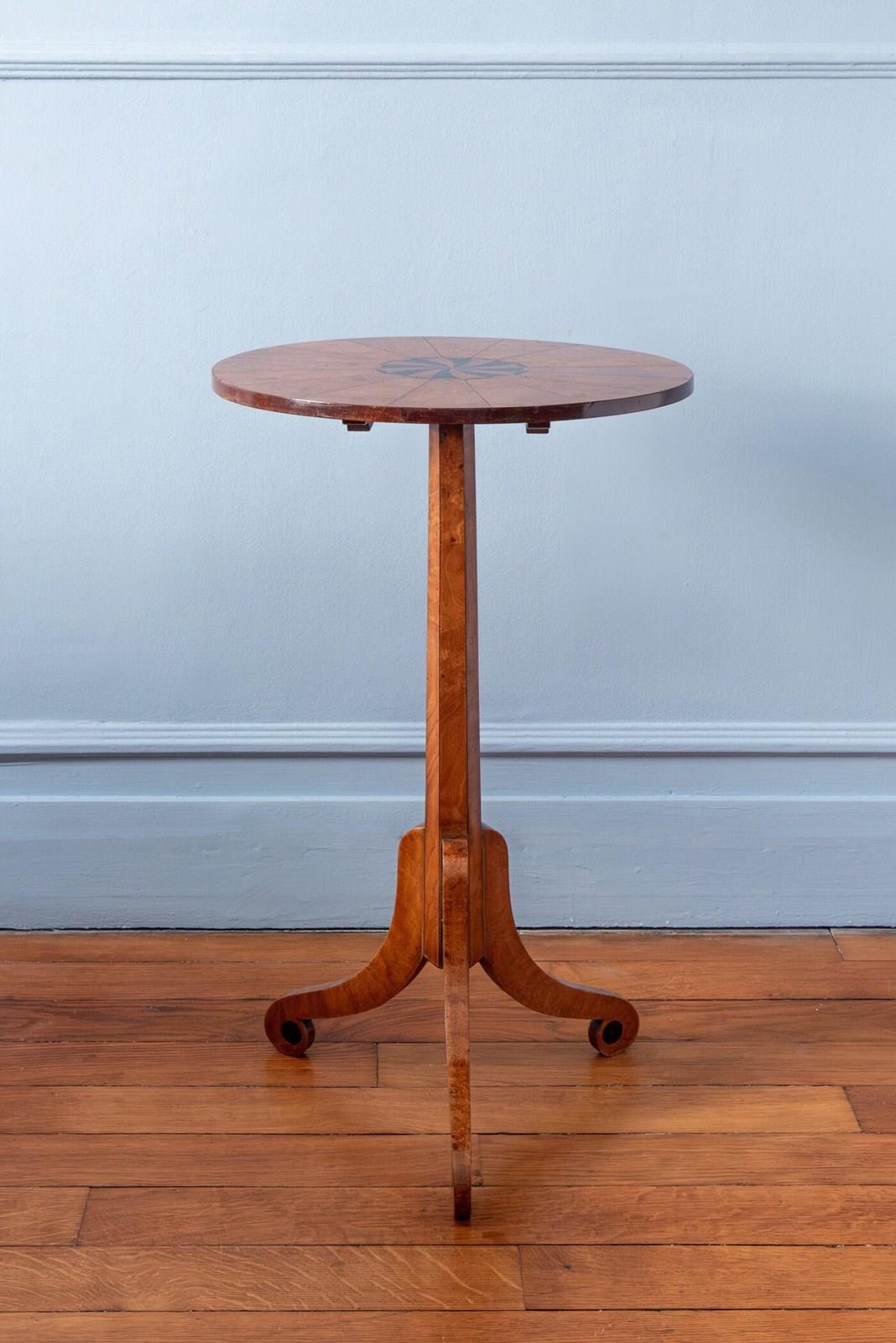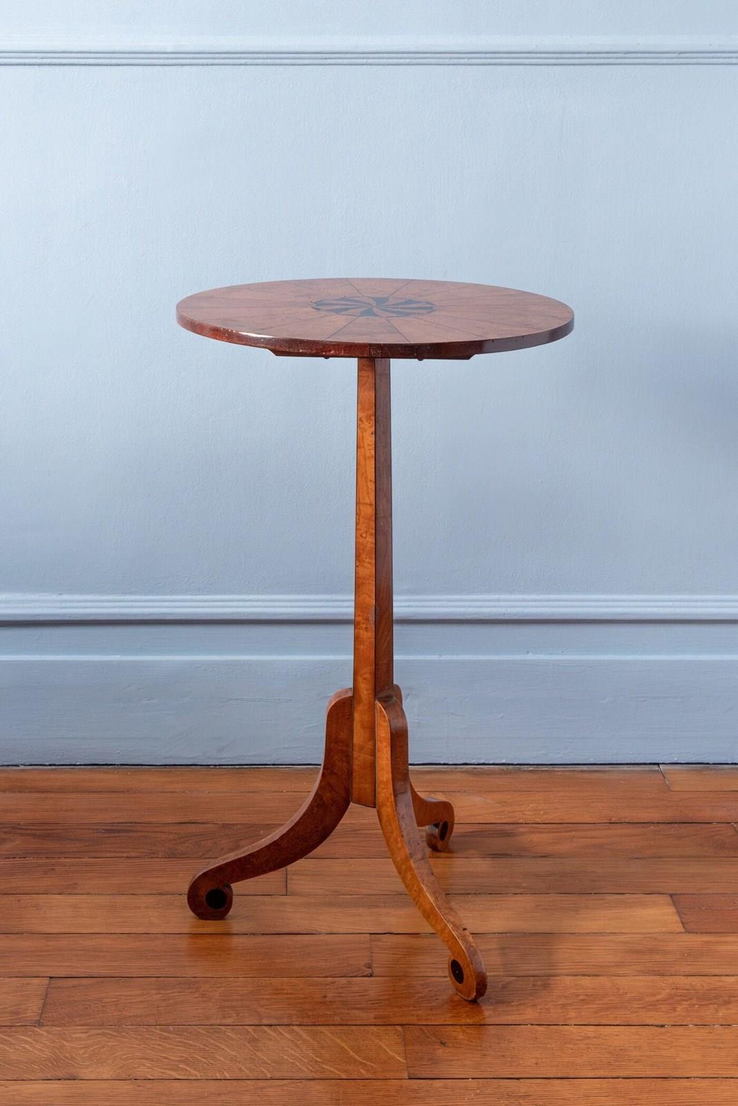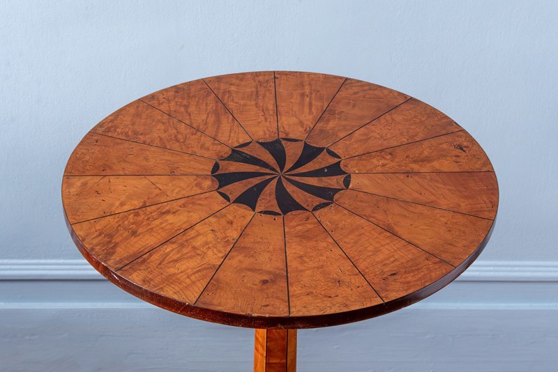 A 20th-century side table in the Biedermeier style. The circular top displays geometric marquetry with radial fruitwood veneer and an ebonised sunburst inlay at the centre, creating subtle movement through carefully selected figured wood. The edge is finished with a darker stained veneer border.