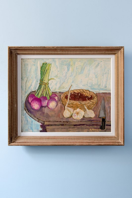 A 1963 oil painting on canvas by Australian painter Frederick Arthur Jessup (1920-2007), depicting a still life with chestnuts in a woven basket, alongside a bunch of red onions, garlic heads and a sharp knife on a wooden table.