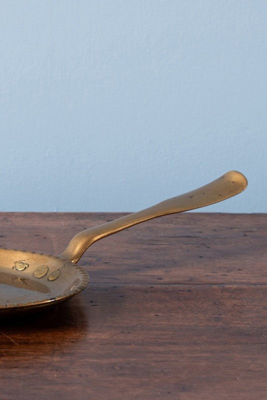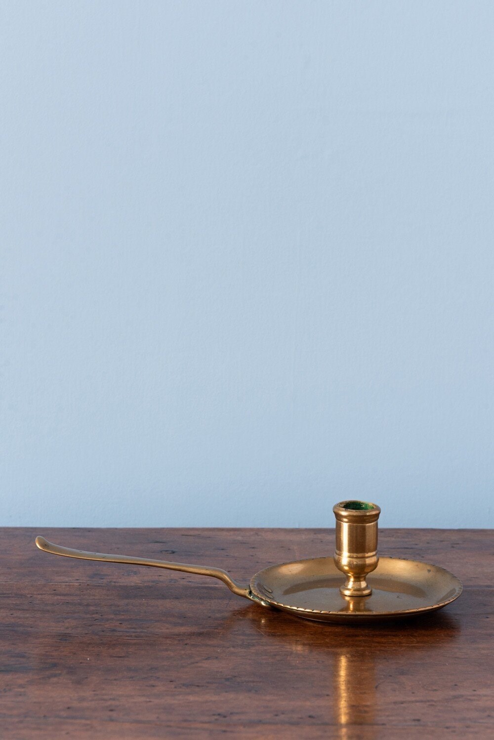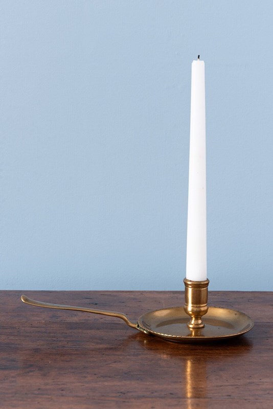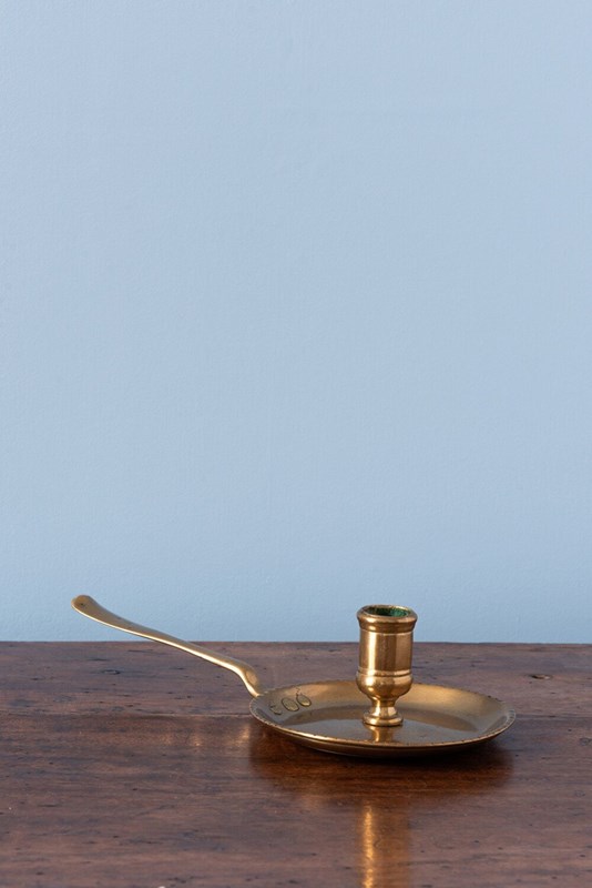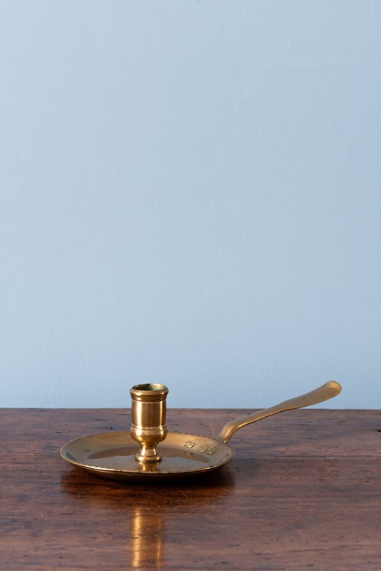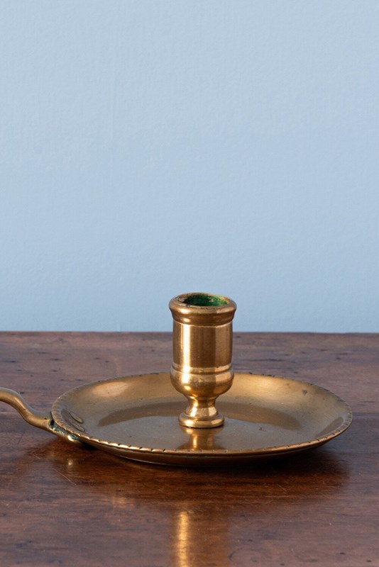 An 18th-century brass chamberstick, its candle holder resting on a wide, flat plate edged with a delicate beaded frieze. A long handle extends from the plate, providing function and elegance. The warm brass patina highlights the engaging details and textures, combining visual appeal with understated, utilitarian charm.
