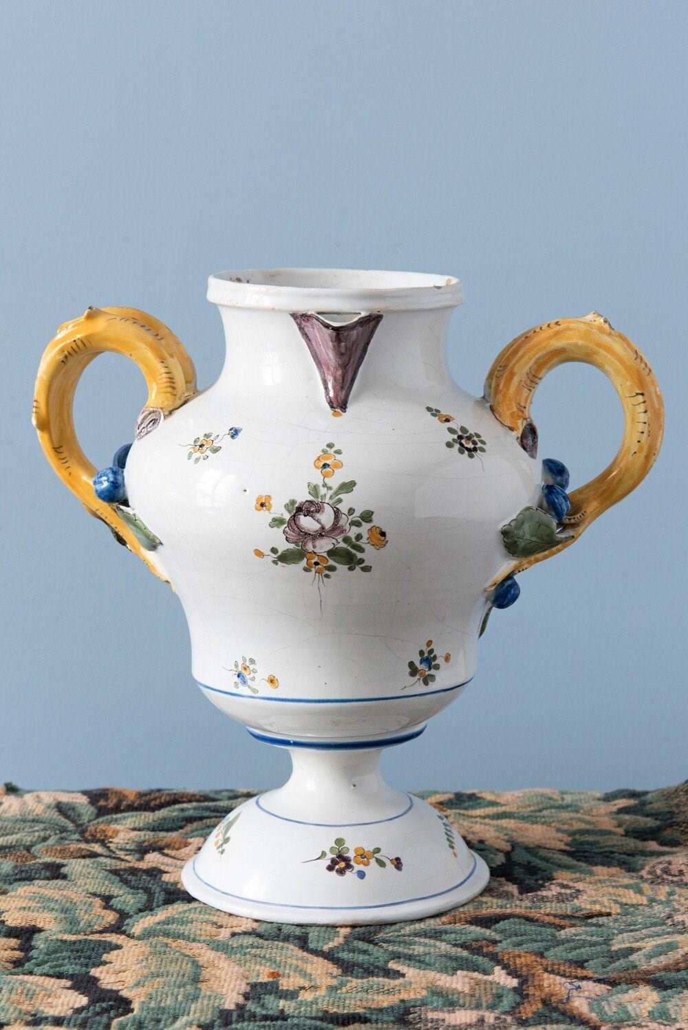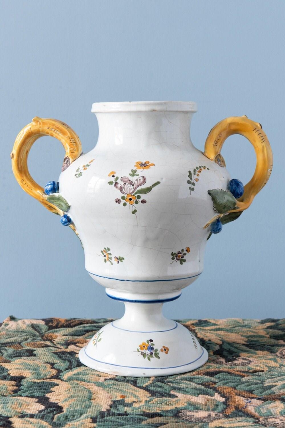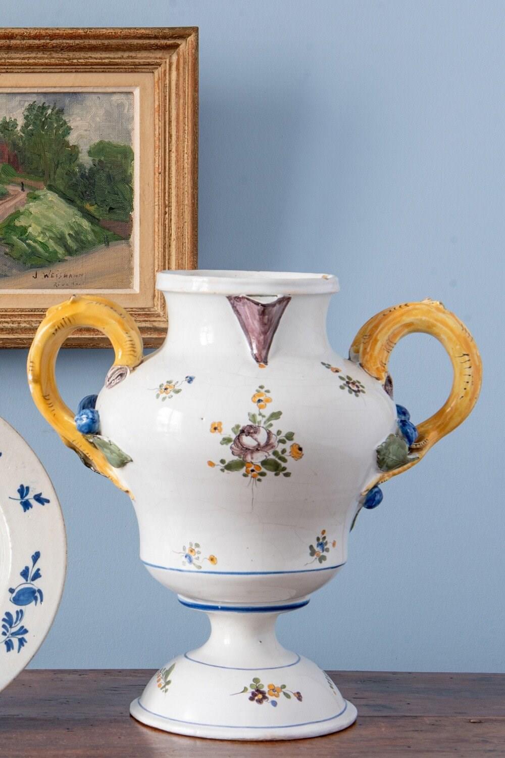 An 18th-century French faience polychrome vase. Its elegant baluster form with a piedouche is adorned with delicate sprays of flowers and foliage, enclosed within fine blue line borders. Two striking handles, modelled as yellow branches with green leaves and blue fruits, frame the vase, their naturalistic detailing particularly captivating. With a generous size, this statement piece combines sculptural presence with elegant floral motifs. Height: 27 cm Length: 27 cm Width: 17 cm Minor wear on the handles Free UK delivery on orders over £200. Shipped from Paris via DHL Express (2 working days), with duties and taxes included. Worldwide shipping available.