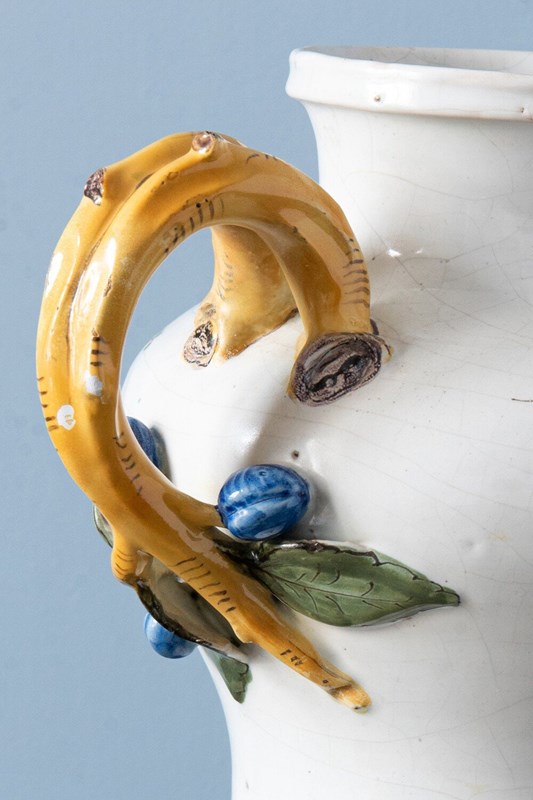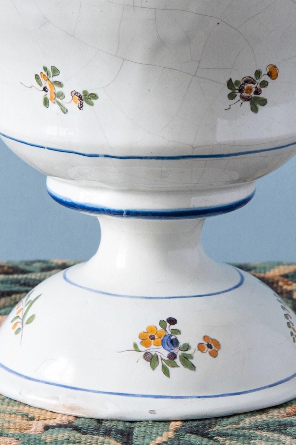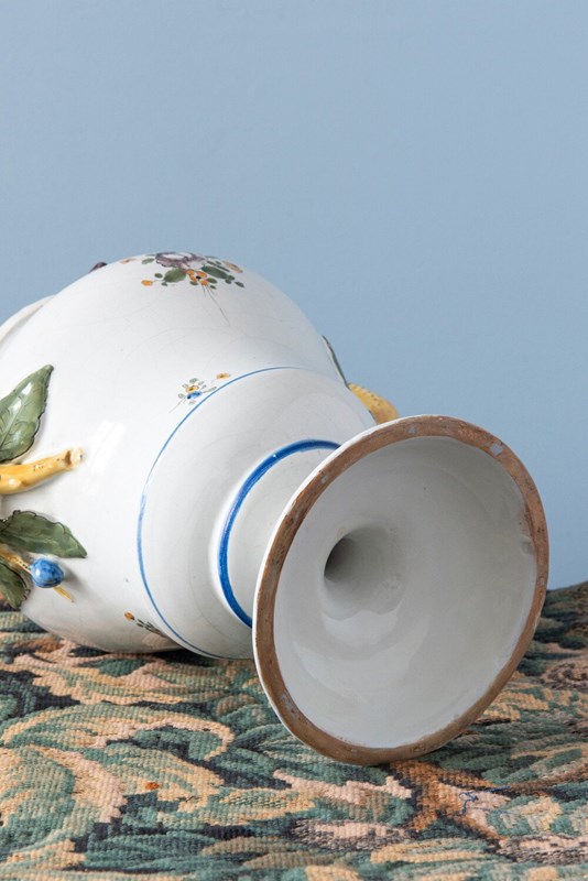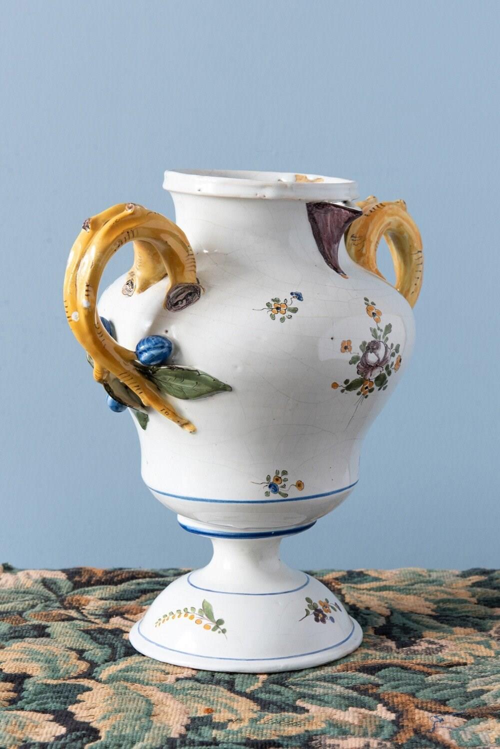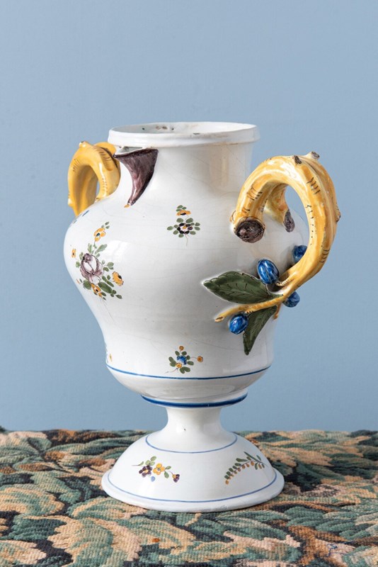 An 18th-century French faience polychrome vase. Its elegant baluster form with a piedouche is adorned with delicate sprays of flowers and foliage, enclosed within fine blue line borders. Two striking handles, modelled as yellow branches with green leaves and blue fruits, frame the vase, their naturalistic detailing particularly captivating. With a generous size, this statement piece combines sculptural presence with elegant floral motifs. Height: 27 cm Length: 27 cm Width: 17 cm Minor wear on the handles Free UK delivery on orders over £200. Shipped from Paris via DHL Express (2 working days), with duties and taxes included. Worldwide shipping available.