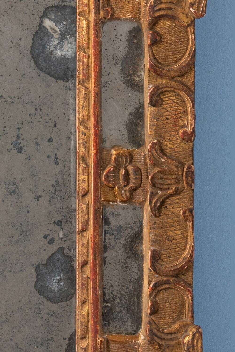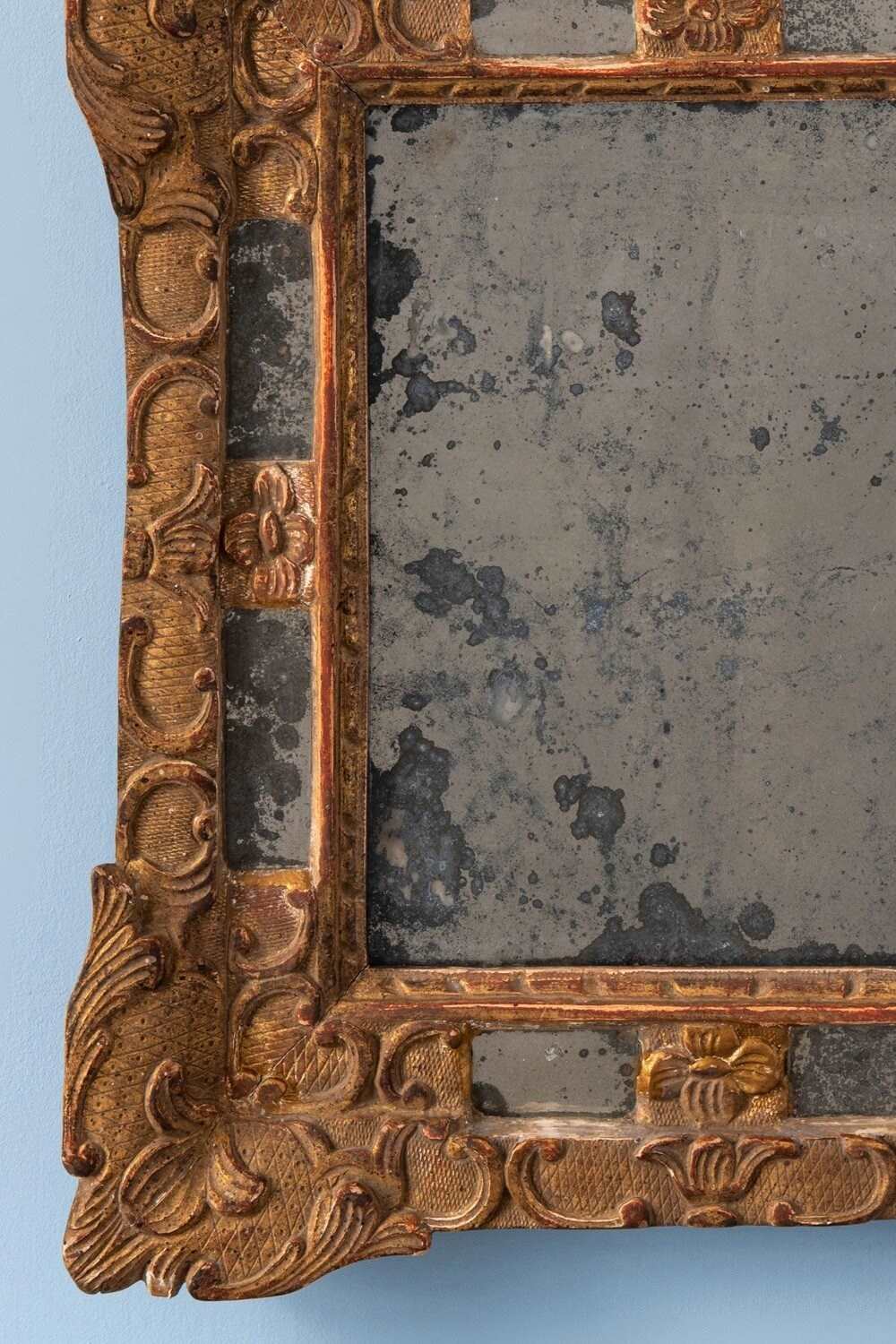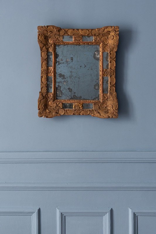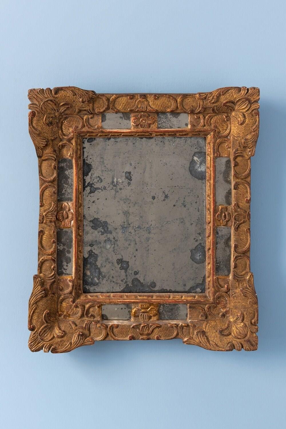 A compact 19th-century French gilt gesso margin mirror. The frame is elegantly decorated in the Régence style, with flowers, scrolls, and foliage over a delicate criss-cross pattern. The original mercury mirror plate shows attractive foxing and is set within four intricate margins, while the gilt surface retains a soft, elegant patina. Well-proportioned and refined, this mirror combines original condition with graceful decorative patterns. Dimensions: 41 x 36 cm Very slight wear to gilt, commensurate with age Original mirror plate and original backing Free UK delivery on orders over £200. Shipped from Paris via DHL Express (2 working days), with duties and taxes included. Worldwide shipping available.