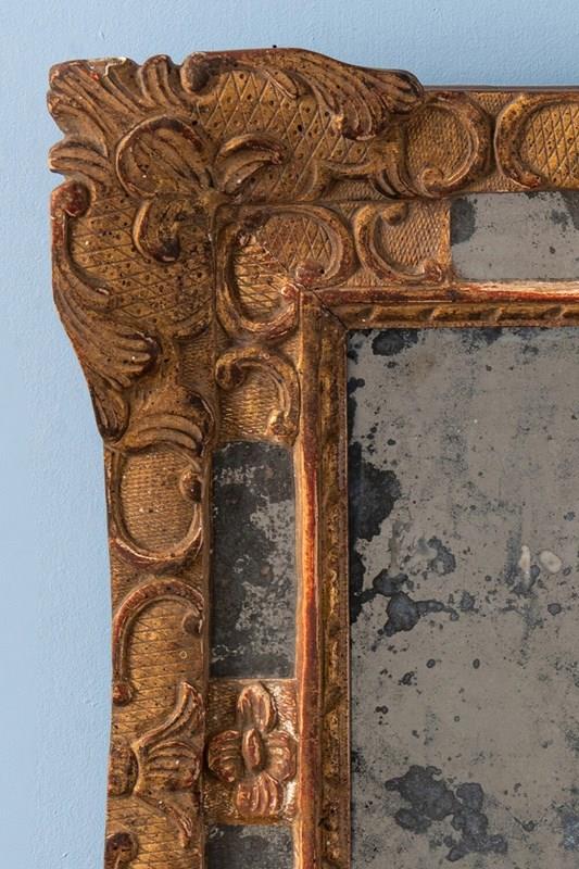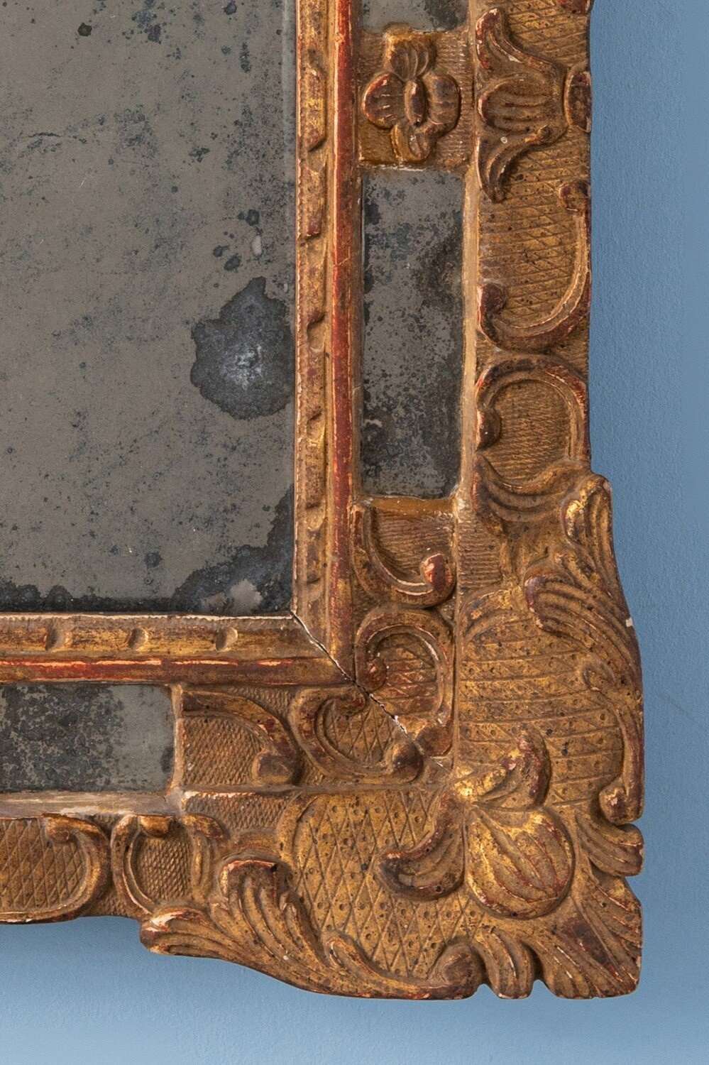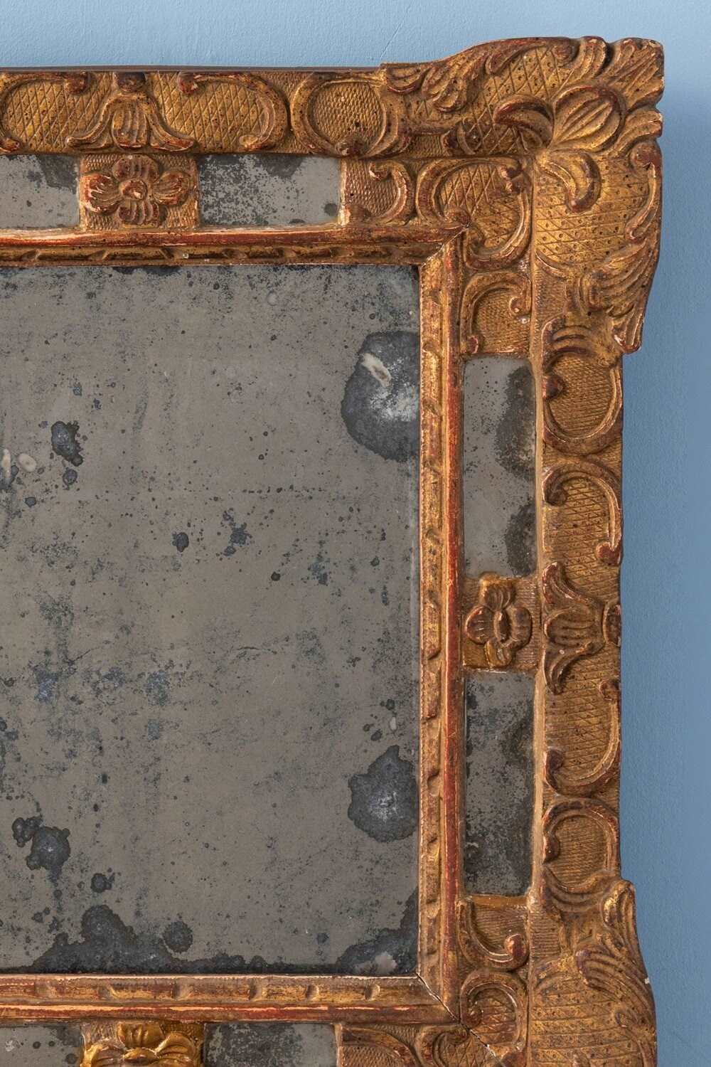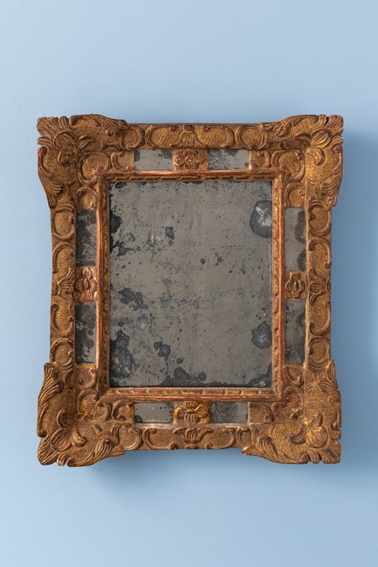 A compact 19th-century French gilt gesso margin mirror. The frame is elegantly decorated in the Régence style, with flowers, scrolls, and foliage over a delicate criss-cross pattern. The original mercury mirror plate shows attractive foxing and is set within four intricate margins, while the gilt surface retains a soft, elegant patina. Well-proportioned and refined, this mirror combines original condition with graceful decorative patterns. Dimensions: 41 x 36 cm Very slight wear to gilt, commensurate with age Original mirror plate and original backing Free UK delivery on orders over £200. Shipped from Paris via DHL Express (2 working days), with duties and taxes included. Worldwide shipping available.
