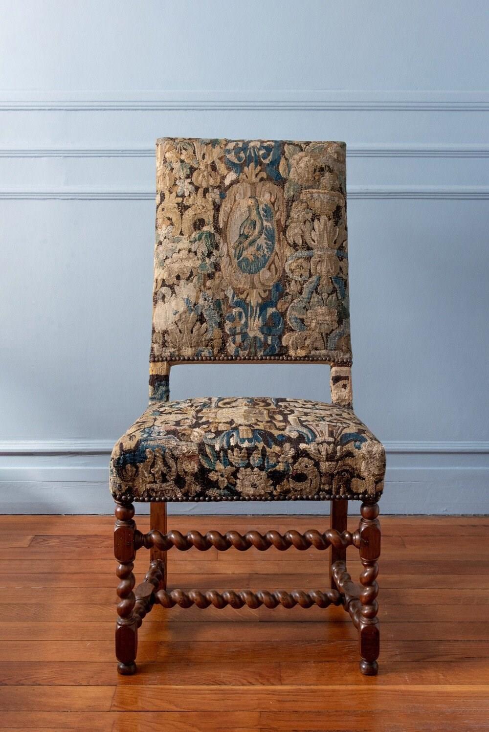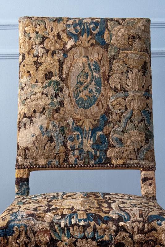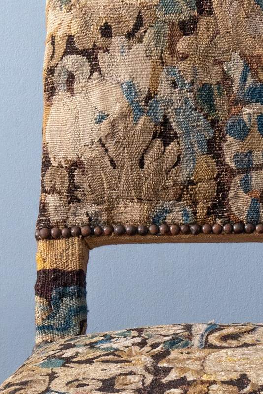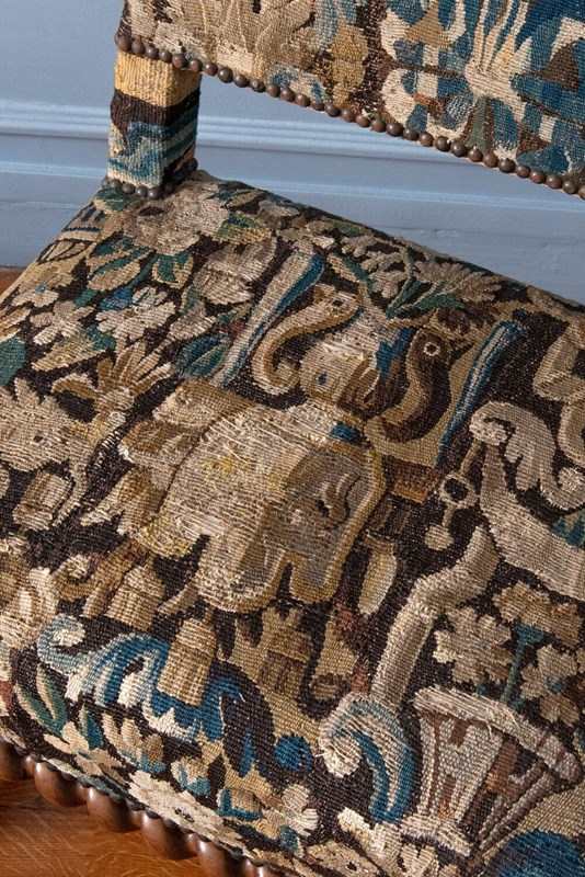 - Upholstered with 17th-century Aubusson tapestry fragments