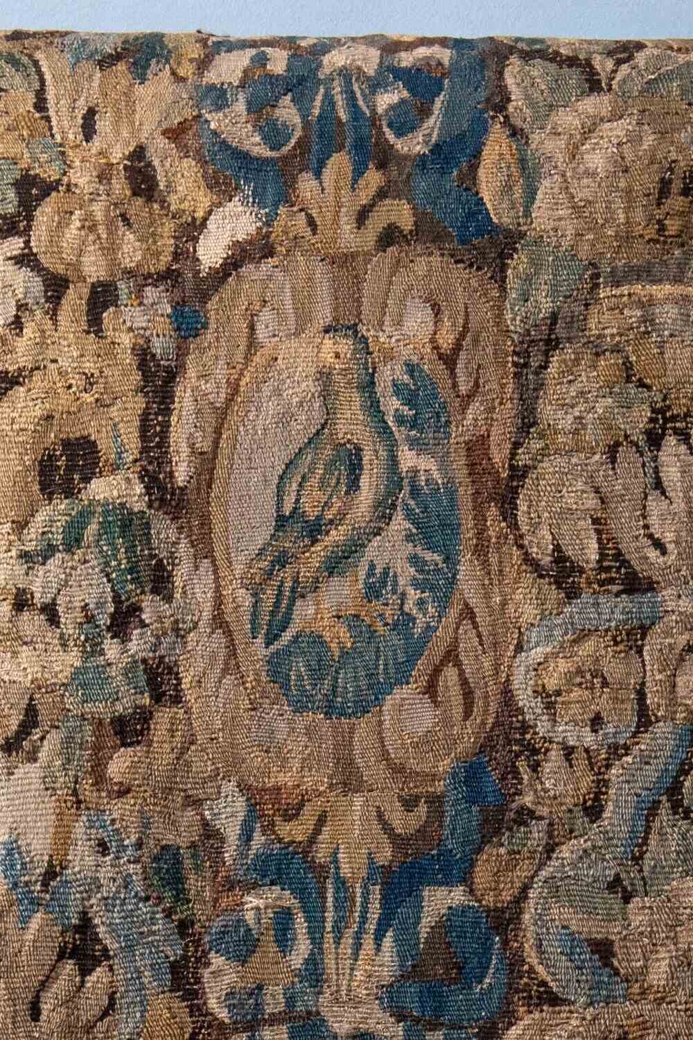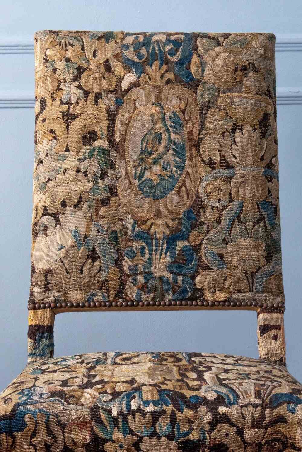 The seat and back are upholstered in a late 17th-century tapestry, likely Aubusson, richly woven with birds amid scrolling foliage, ribbons, and vases. An exquisite faded palette of blues, greens, ochres, and beige lends softness and authenticity. A highly decorative side chair, with distinctive scale and quiet elegance.