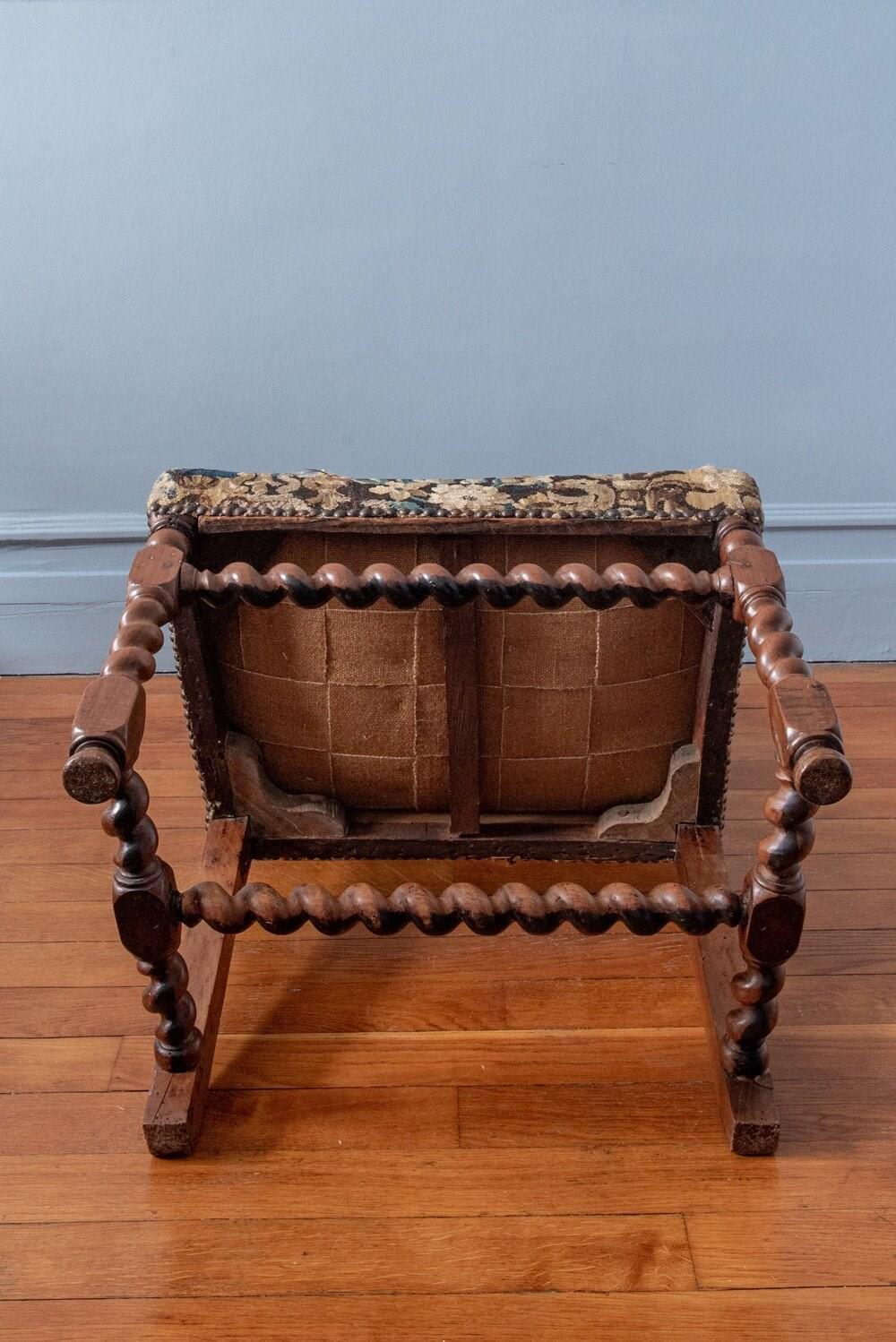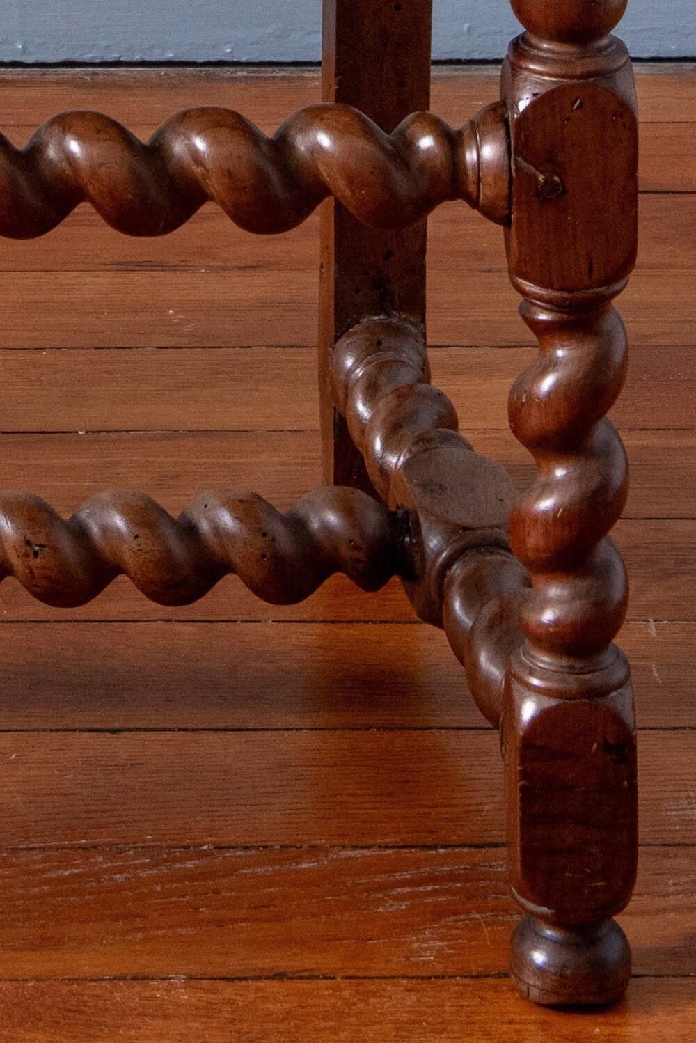 This 17th-century French Louis XIII walnut side chair features a finely turned frame with elaborate barley-twist legs and stretchers forming an H-shaped base. Of generous proportions, it has a high upright back and a wide, deep seat—typical of early 17th-century French seating that furnished formal interiors of the Louis XIII period.