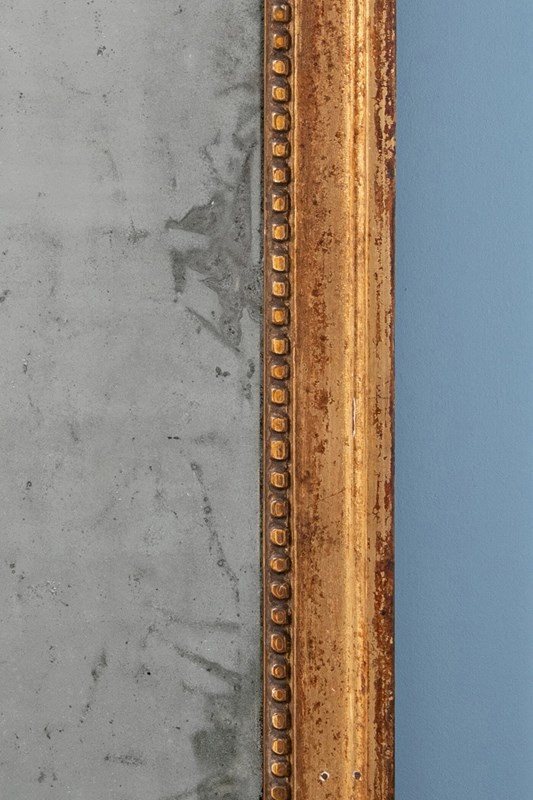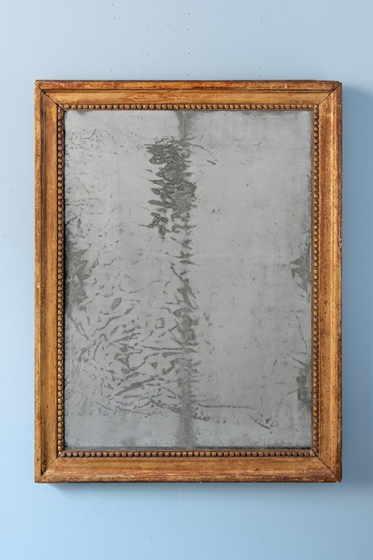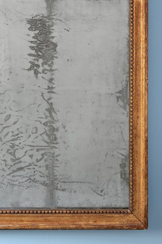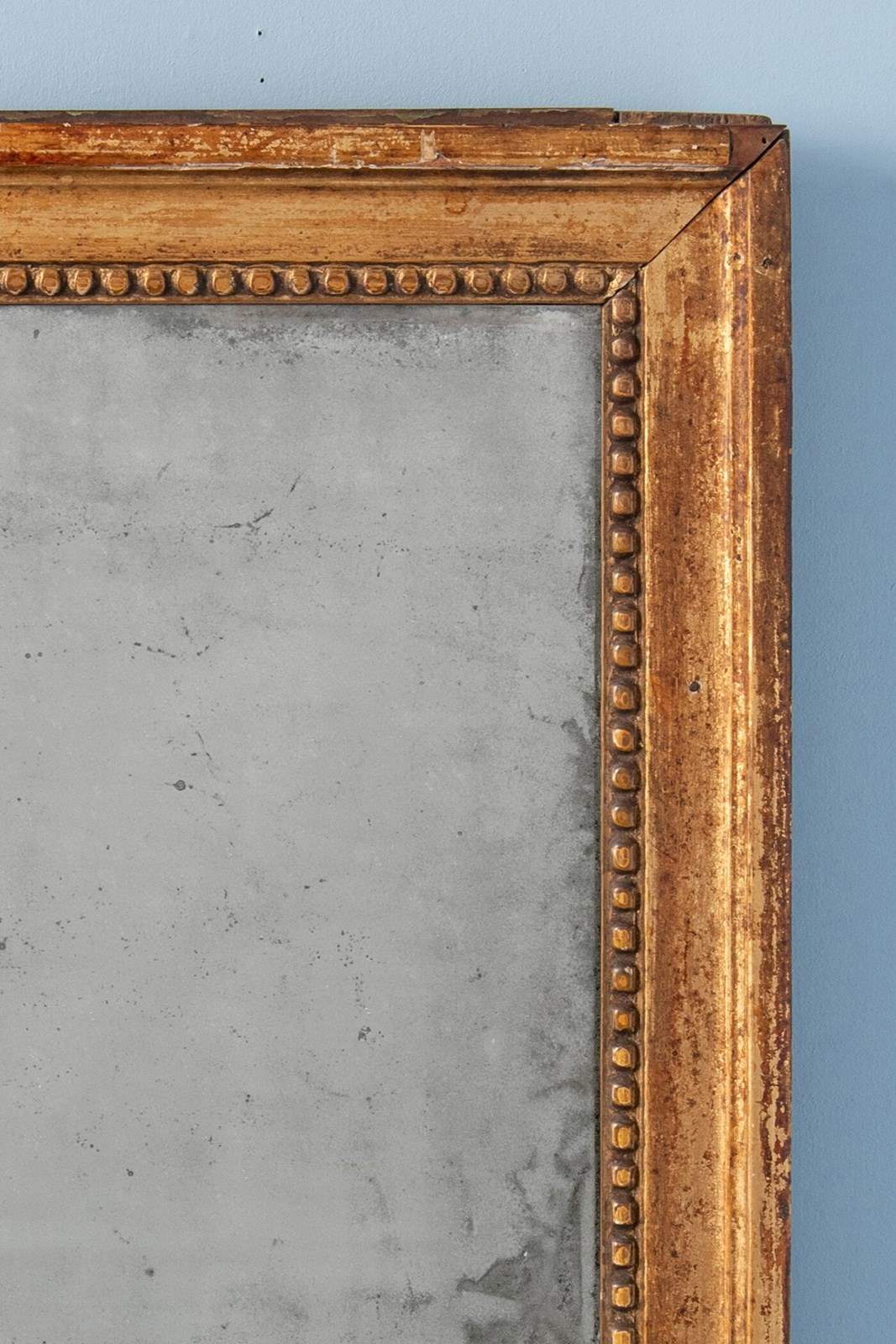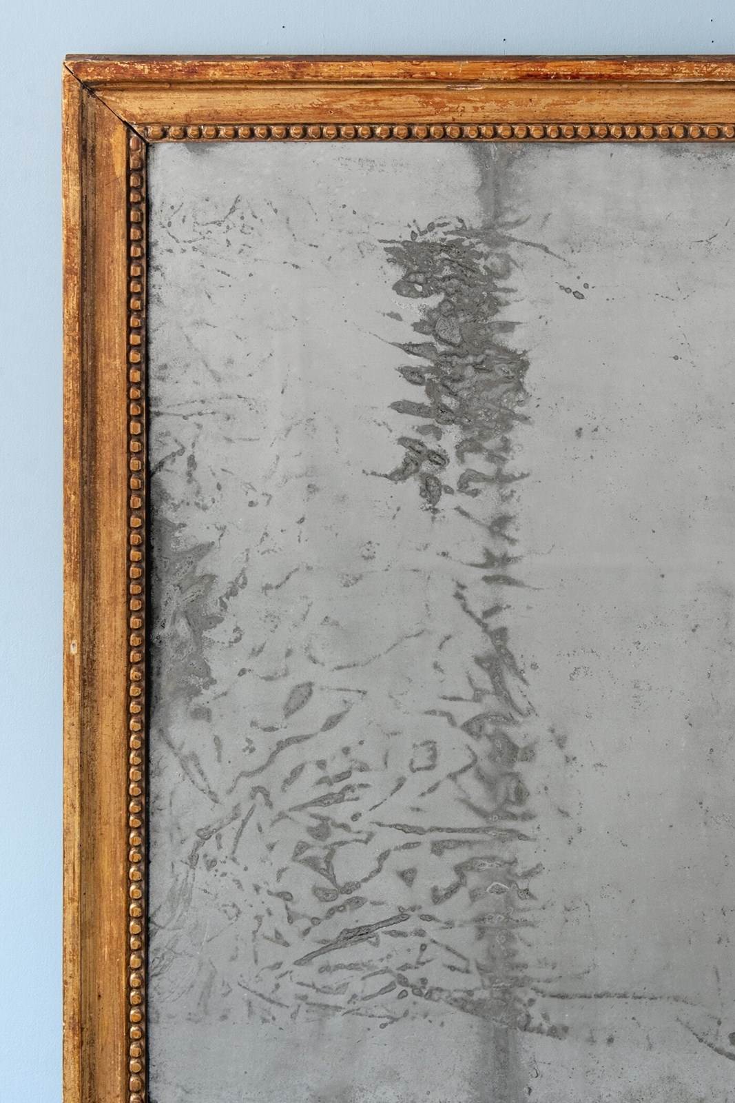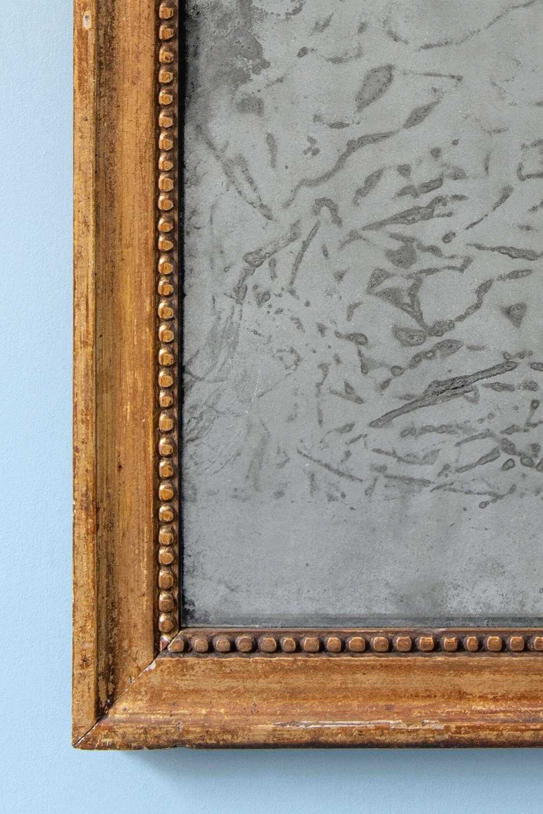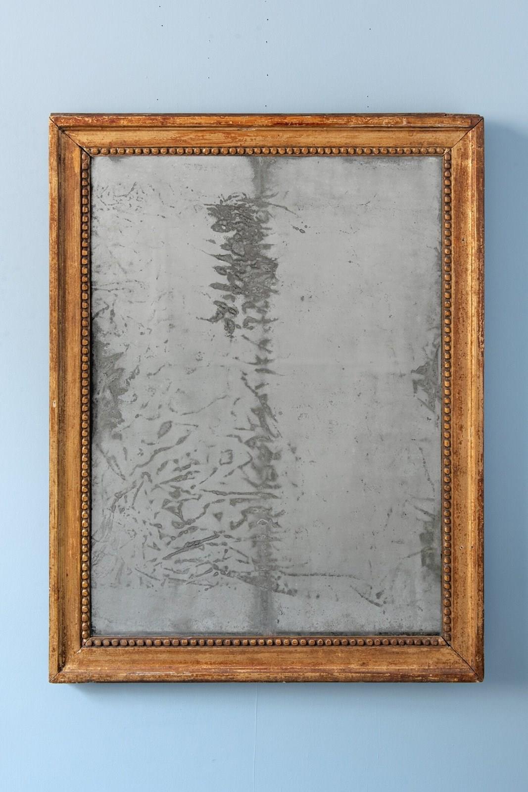 A late 18th-century French gilt gesso mirror, c. 1780, in the Louis XVI style. Of understated rectangular form, the mirror plate is framed by an elegant beaded frieze, lending the piece a clear architectural quality. The original mercury mirror plate displays authentic foxing, adding depth and character.