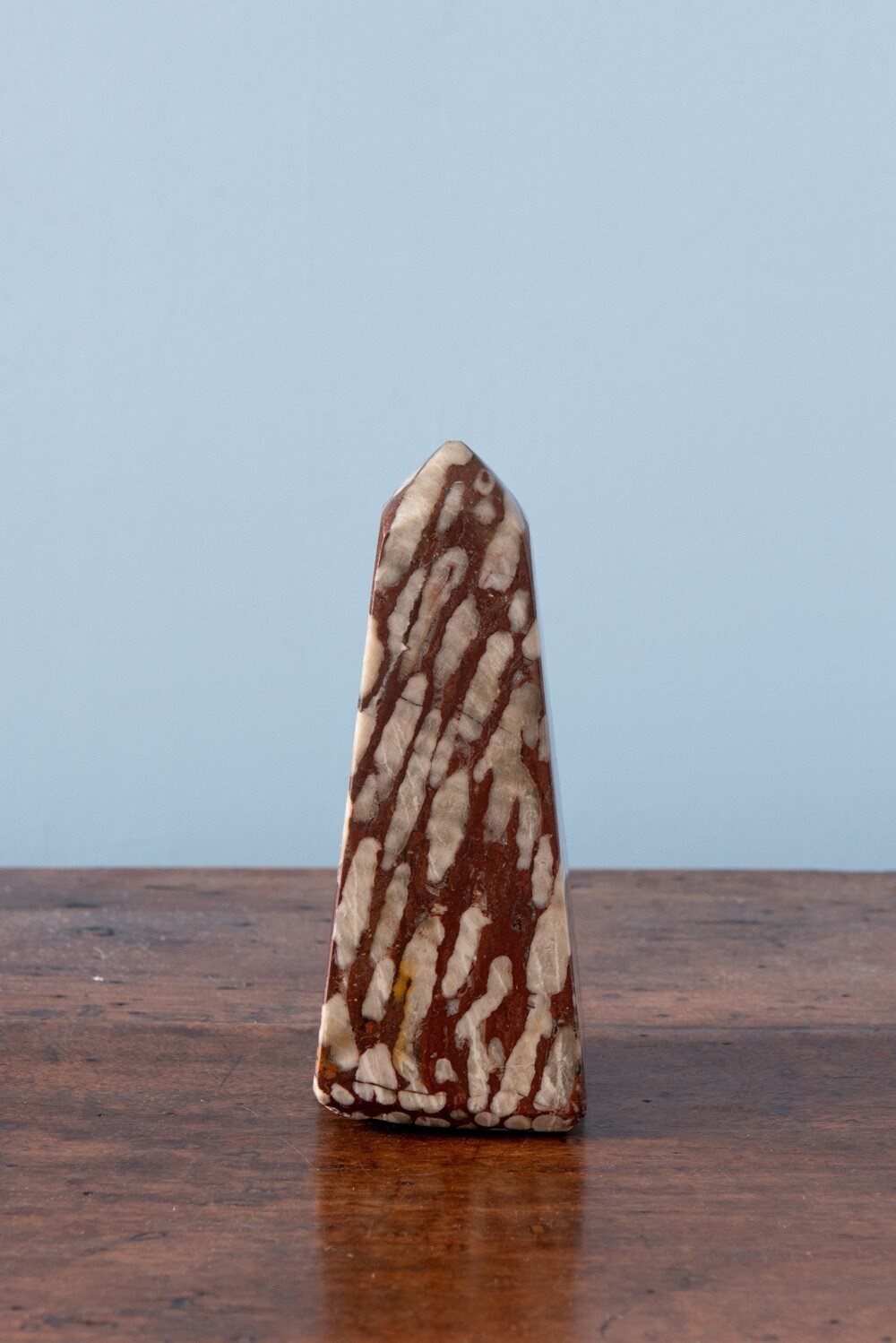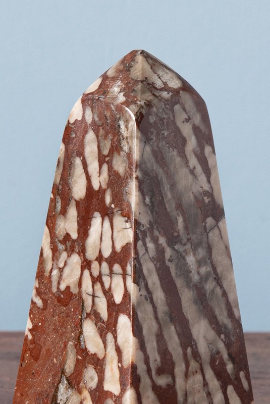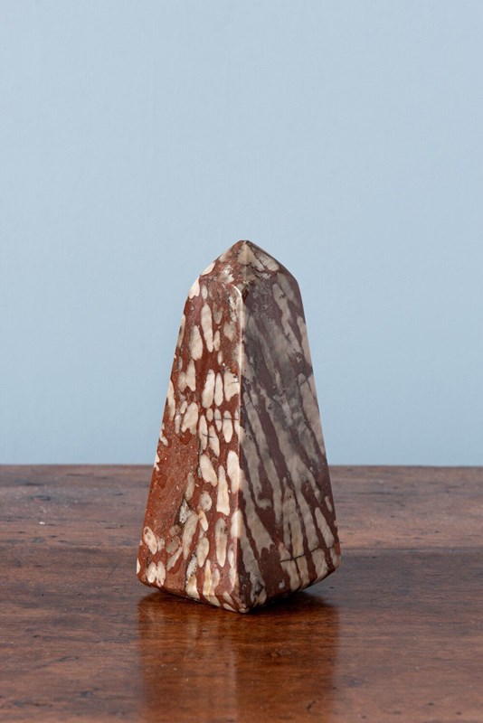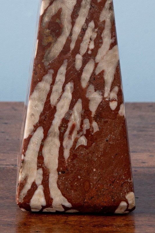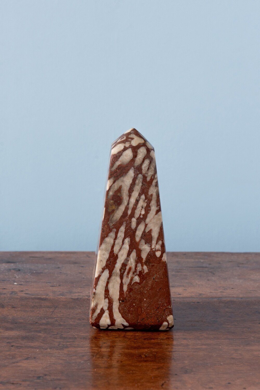 A rare midcentury obelisk in rouge griotte marble, with a distinctive short, wide form, sharply defined edges, and a beautifully polished surface. The classic deep red of the rouge griotte is enriched by sumptuous grey veining, highlighting the marble’s natural beauty. A timeless and elegant piece that makes a striking desk ornament.