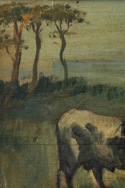 A French 19th-century oil painting on board depicting a Camargue bull set within a typical regional landscape of marshes, dotted with clusters of tall trees and with distant hills on the horizon. The scene is rendered in sweeping green hues, creating a striking contrast with the black and white of the bull and the orange of its horns. Painterly brushstrokes animate the surface, with the almost abstract expanses of marshland highlights the presence of the bull and its naturalistic stance, while giving the trees a sculptural quality. Folk in style, this is a rare and characterful piece with a distinctive Camargue subject, mounted in an antique gilded frame.