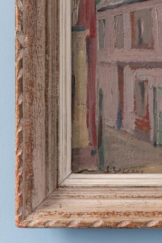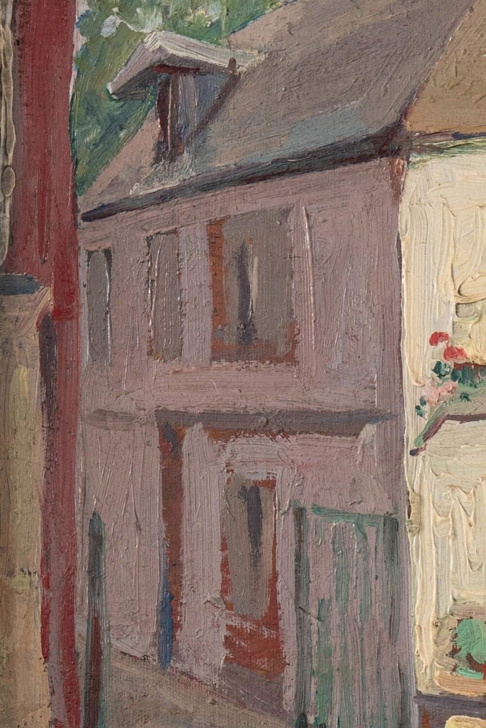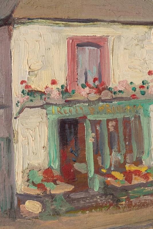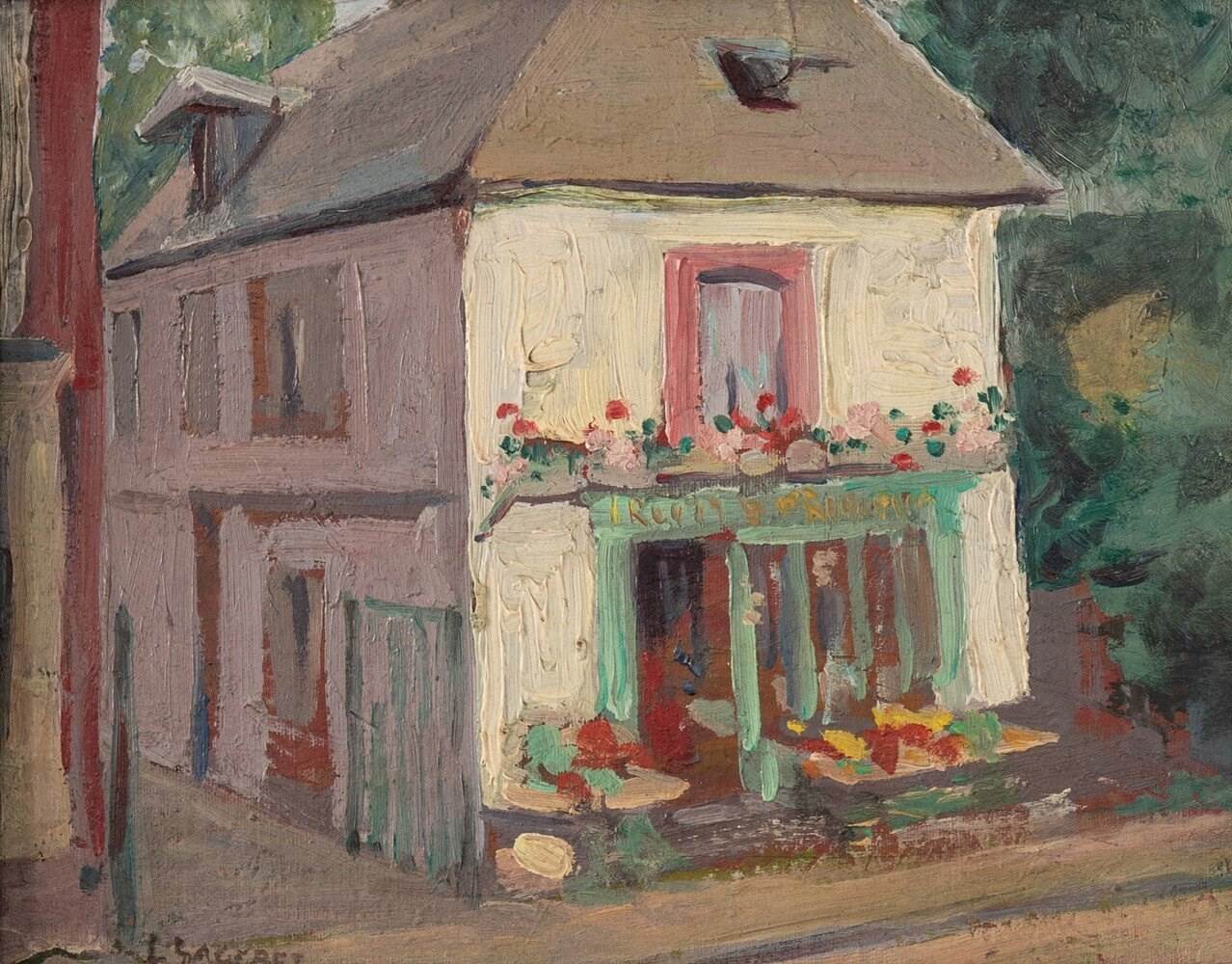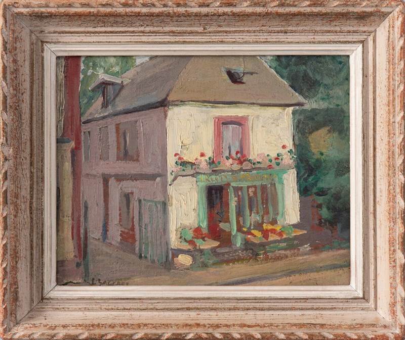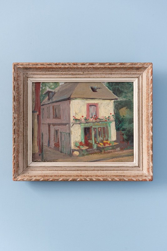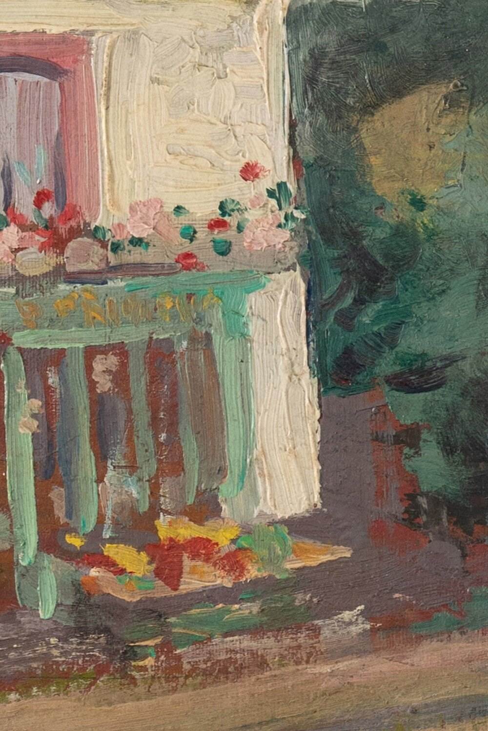 An early 20th-century oil on board depicting a charming village grocer’s shopfront, with fruits arranged on outdoor tables, rendered in a delicate palette of greens, pinks and earthy tones. Characterful details—from the green shopfront to the floral decoration and the lush trees—create a sense of place and intimacy. Loose brushstrokes add charm, with patches of colour providing contrast to the vibrant dots of fruits and flowers. Signed on the front and mounted in an antique Montparnasse frame, this vivid rural scene is full of life and personality.