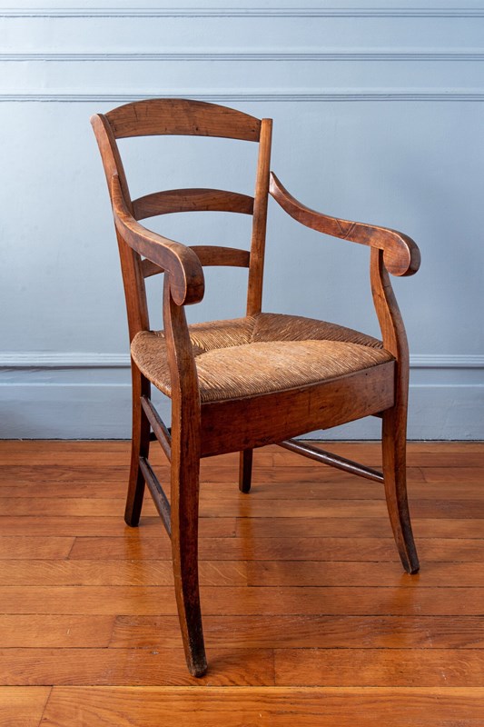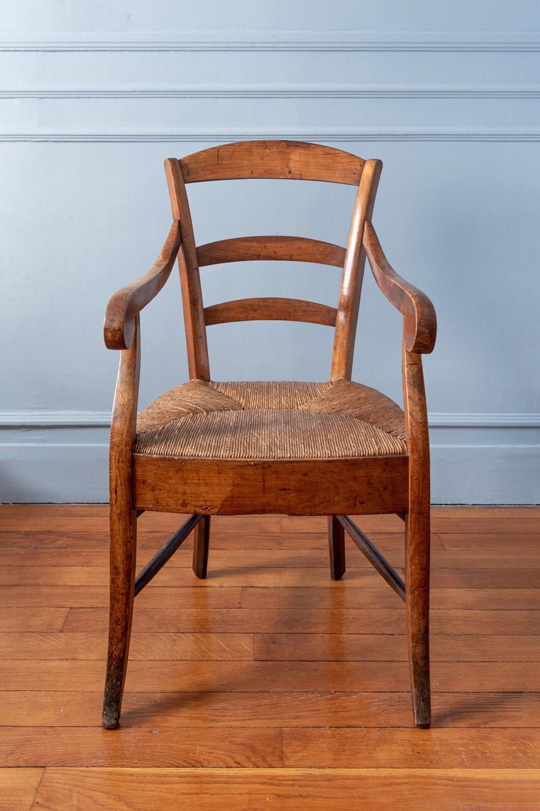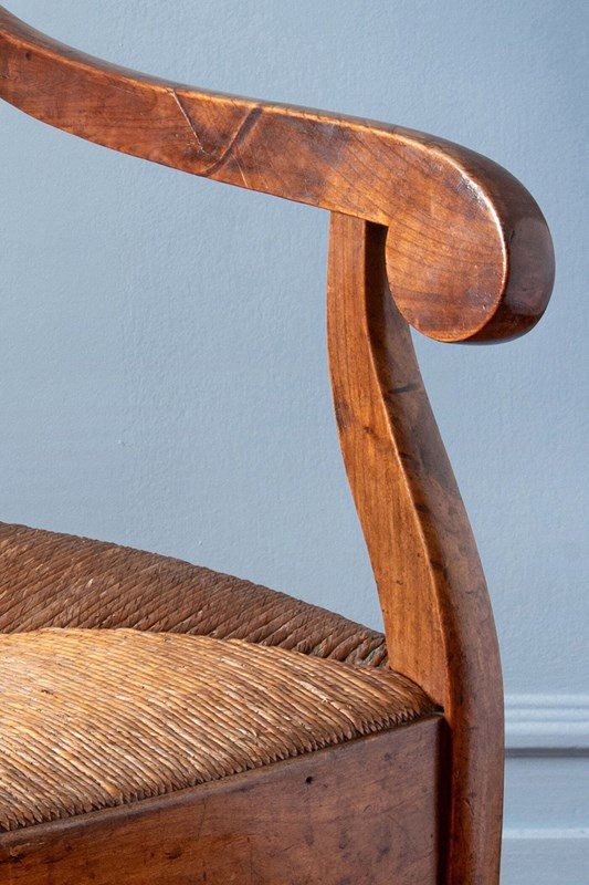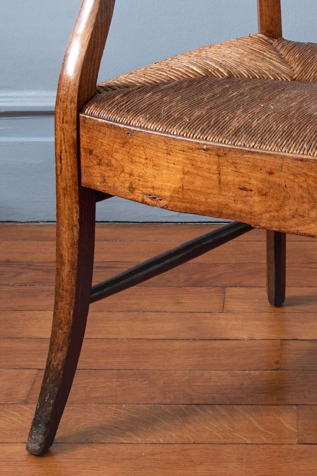 This early 19th-century French country fruitwood armchair features a rush seat, a gently curved open back with three wide horizontal rails, and a wide apron below. Armrests are finished with bold scrolls, and the curved sabre legs are joined by stretchers.