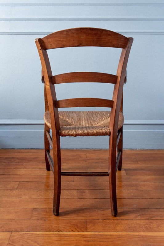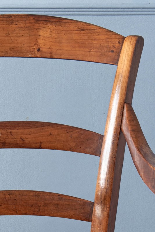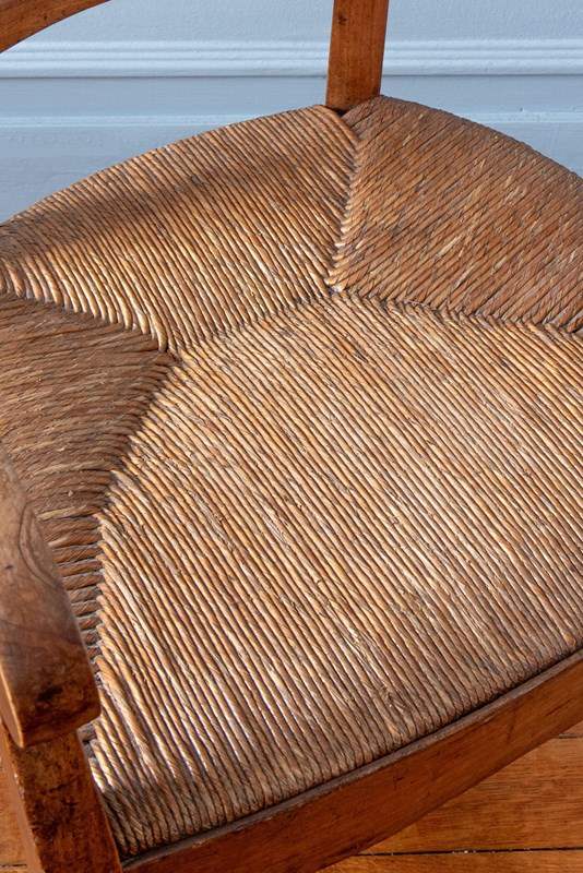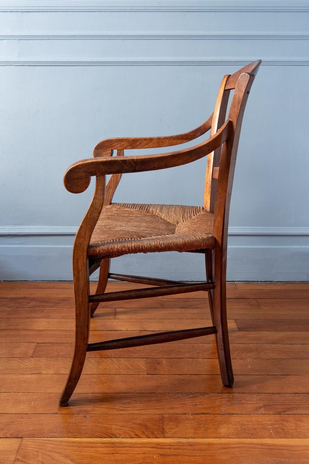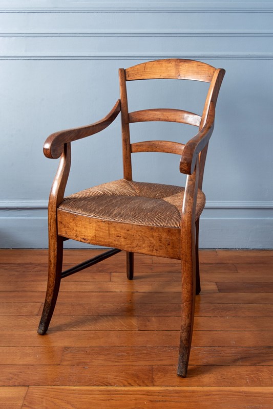 This early 19th-century French country fruitwood armchair features a rush seat, a gently curved open back with three wide horizontal rails, and a wide apron below. Armrests are finished with bold scrolls, and the curved sabre legs are joined by stretchers.