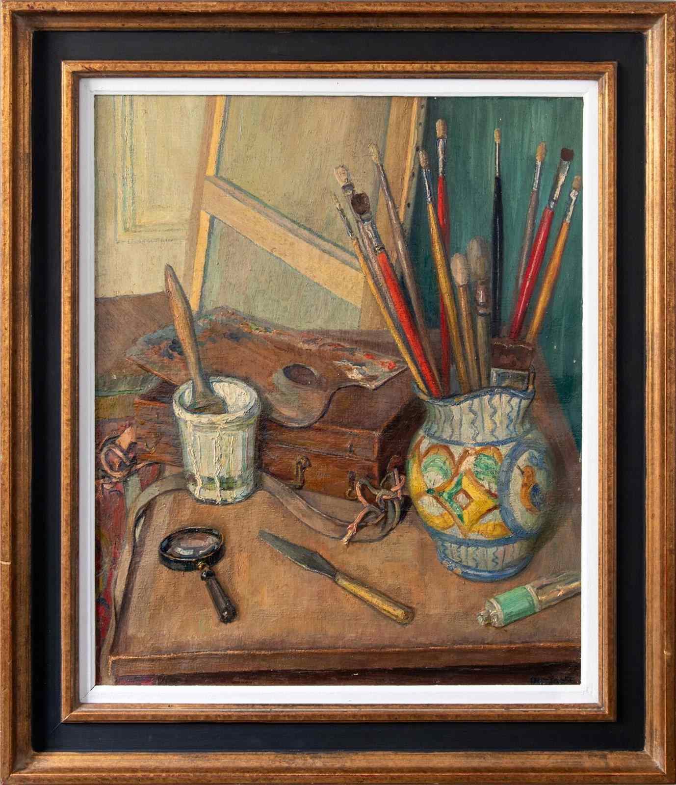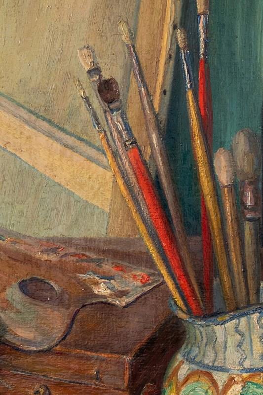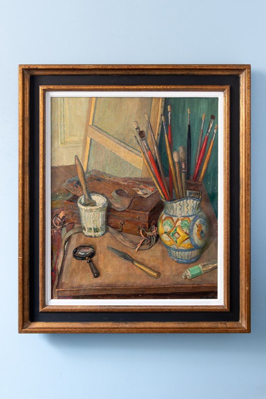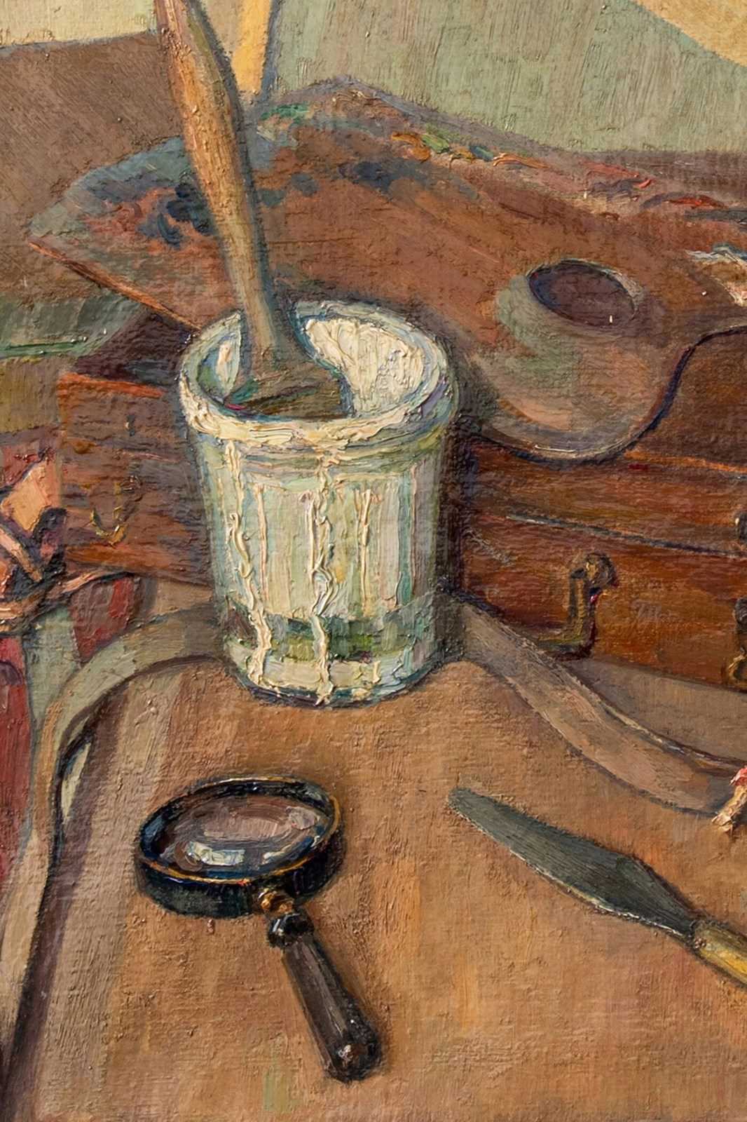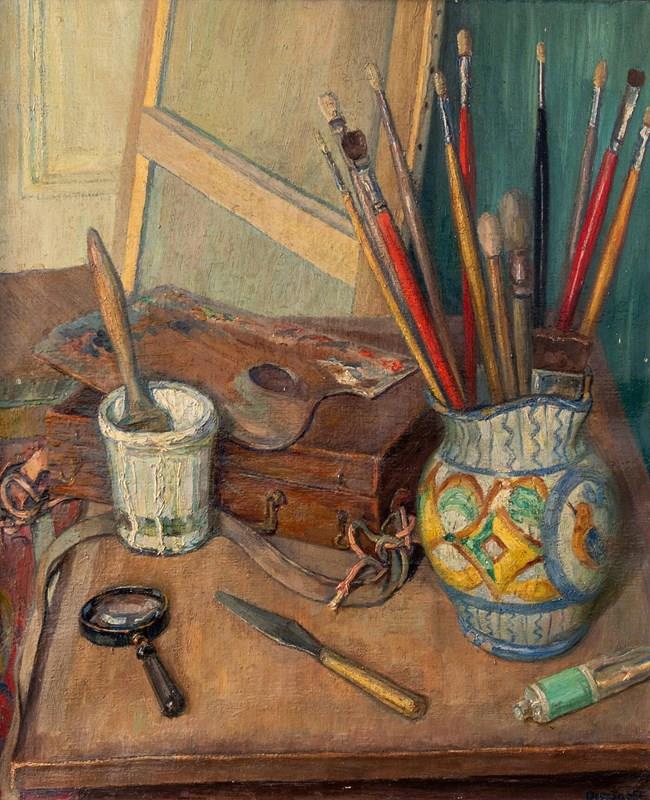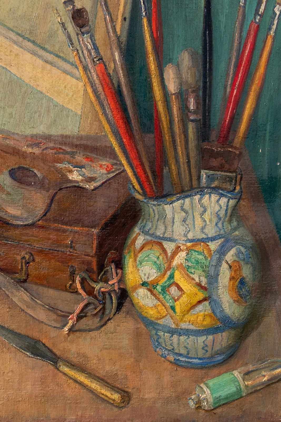 A midcentury oil painting on canvas by French-Ukrainian artist Michel Portnoff (1885-1978), depicting a still life with artist's brushes contained in a jug, along with a palette knife, magnifier, a brush in pot, a painter's palette and a wooden studio case, all laid on a wooden table. The scene is set in an interior with an antique carpet to the left, stretchers and a door in the background.