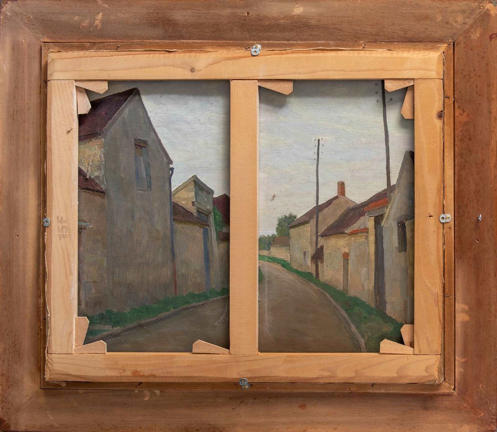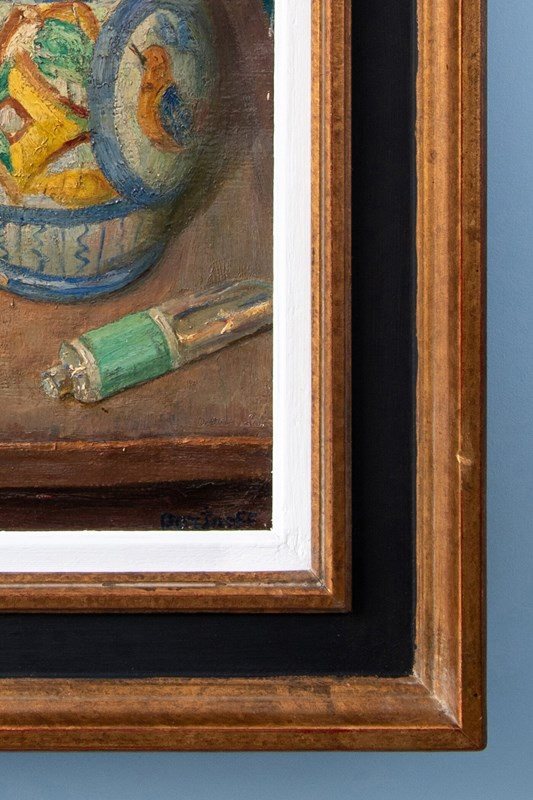 Signed lower right and presented in a period black and gilded frame. An impressive work with substantial presence, offering a refined study of the painter’s environment and introspective glimpse into his creative space.