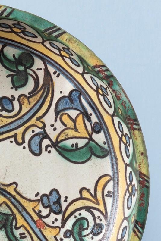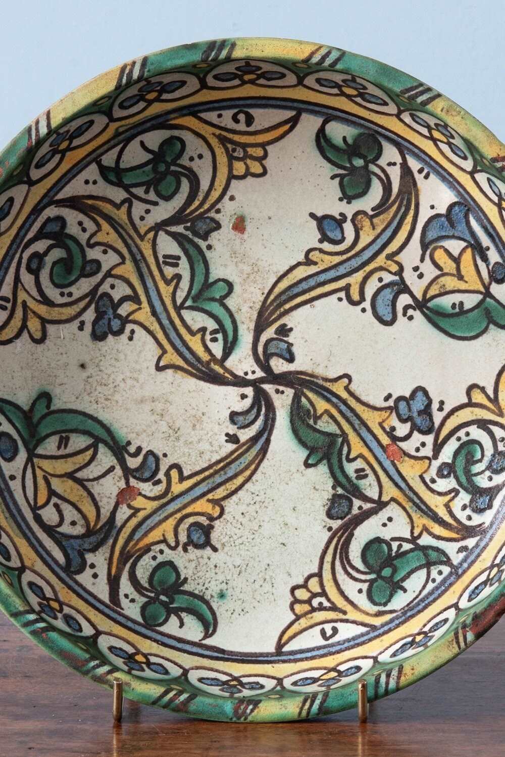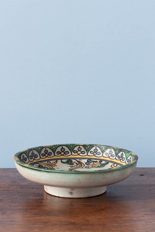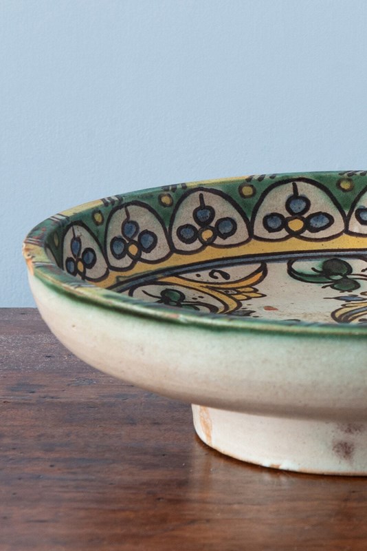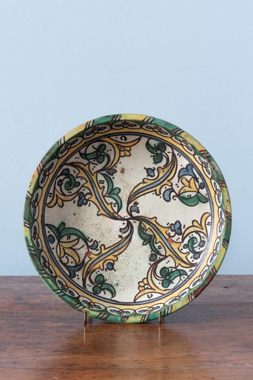 A 19th-century Moroccan pottery pastilla dish from Fez, c. 1830, decorated with swirling leaves and flowers in the Saz style, in a vibrant palette of green, blue and yellow on a cream engobe. The lip carries a frieze of florals and stripes. Its elegant shallow form is raised on a piedouche, and a discreet hole at the back allows for easy wall hanging. Marked underneath from the Loviconi collection. A rare and textured piece, with vibrant patterns and an elegant shape, ideal for display on a wall.