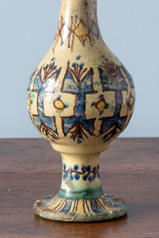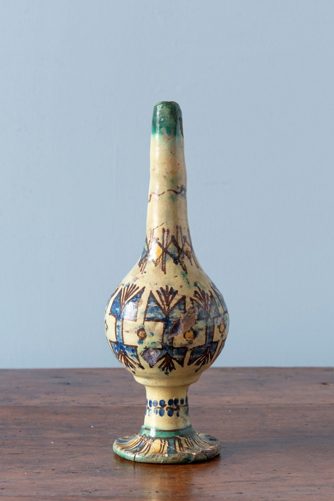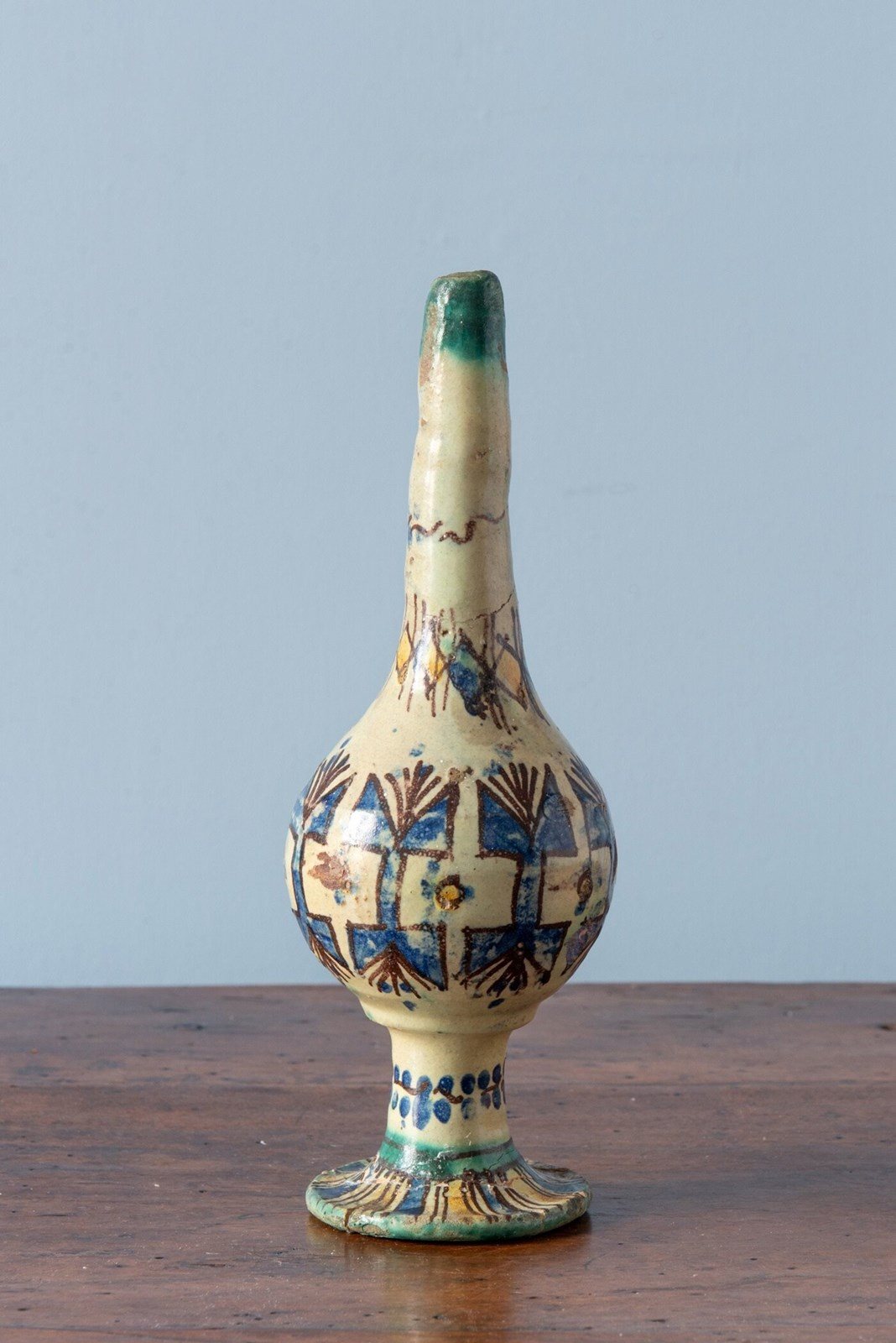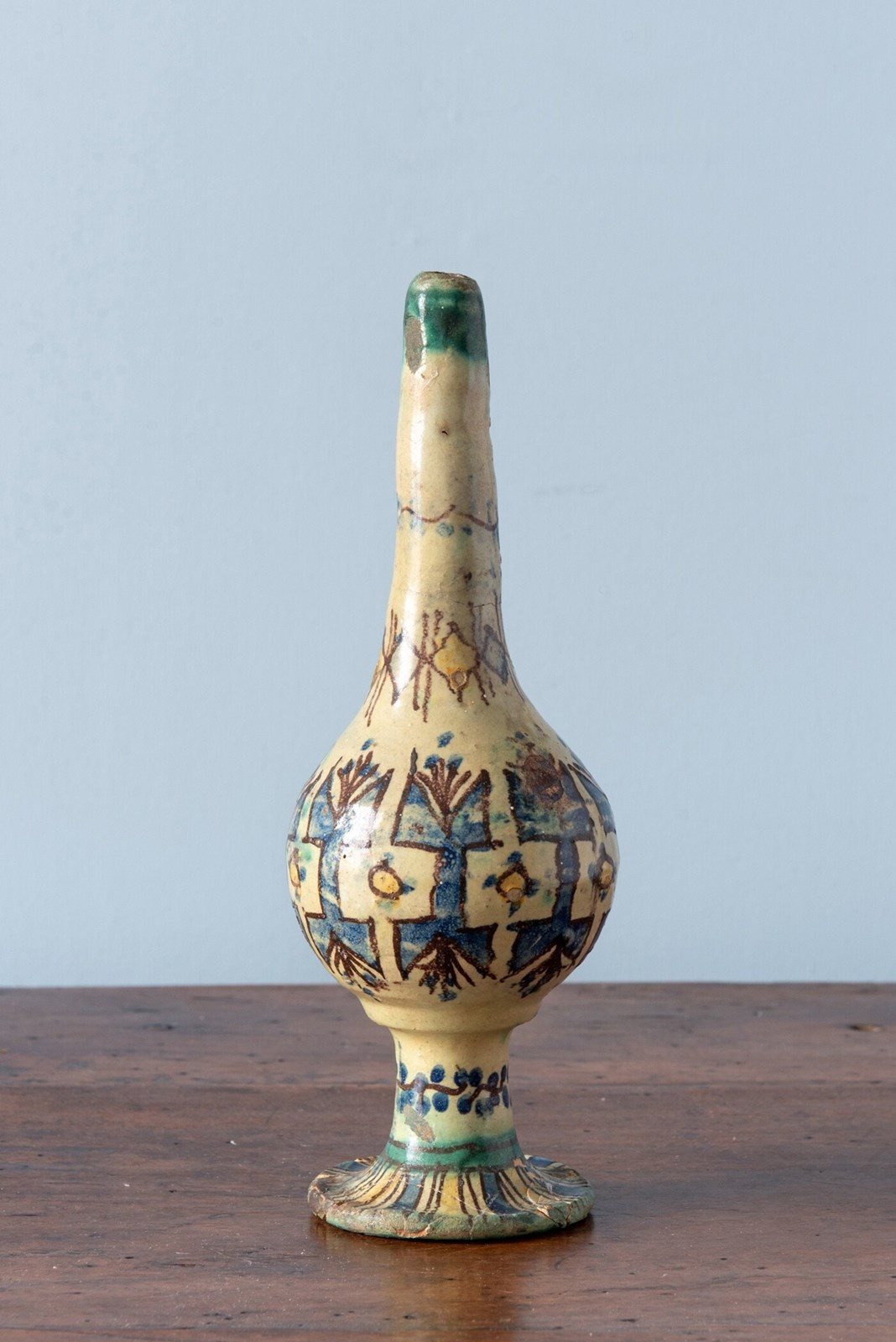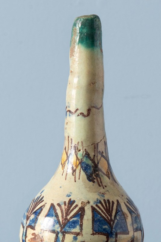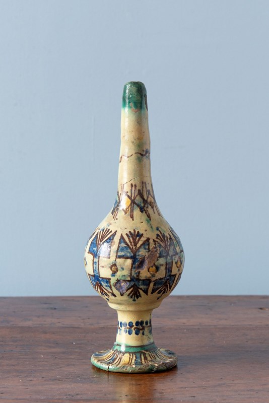 A late 19th-century Moroccan ceramic rosewater sprinkler from Fez, of distinctive form with a round body and slender elongated neck, raised on a flared piedouche. Decorated with vibrant geometric patterns in blue and yellow, outlined in black on an off-white ground. The base features a frieze of florals. A rare and sculptural piece from Fez, with a strong decorative presence.