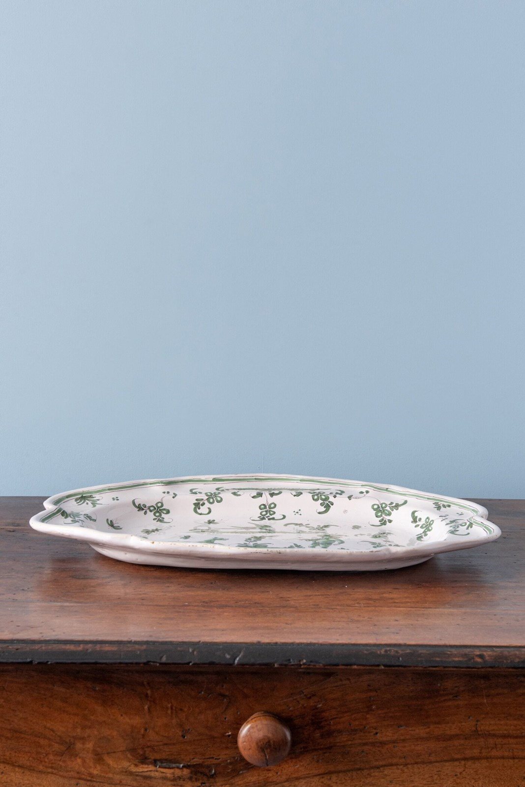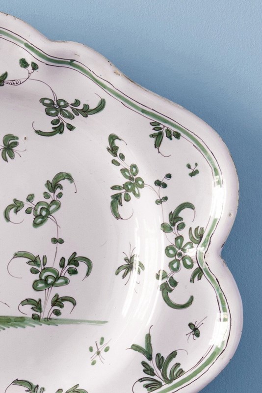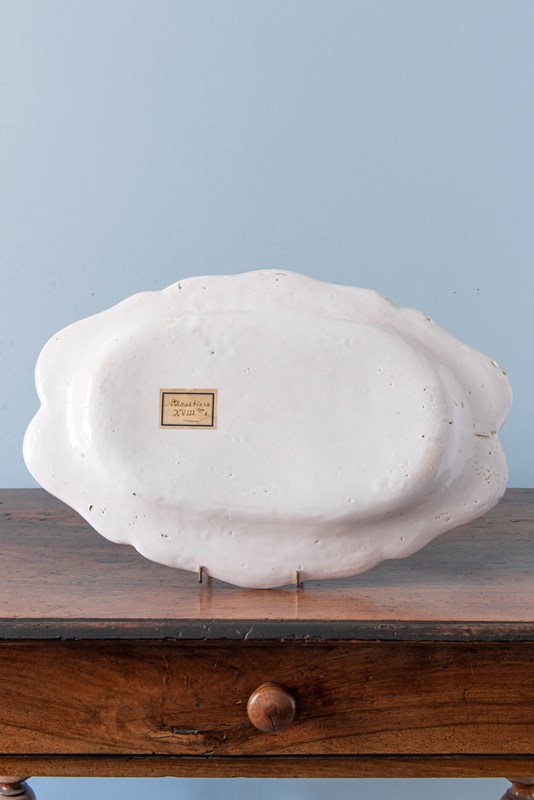 Of elegant oval form, the dish is finished with a delicately shaped edge. The lip is adorned with a continuous frieze of graceful flowers and foliage, contained by a fine trailing line. In excellent condition and with no restoration, a distinctive Moustiers dish with imaginative decor and refined colour.