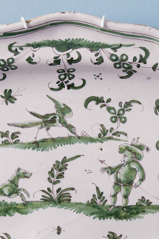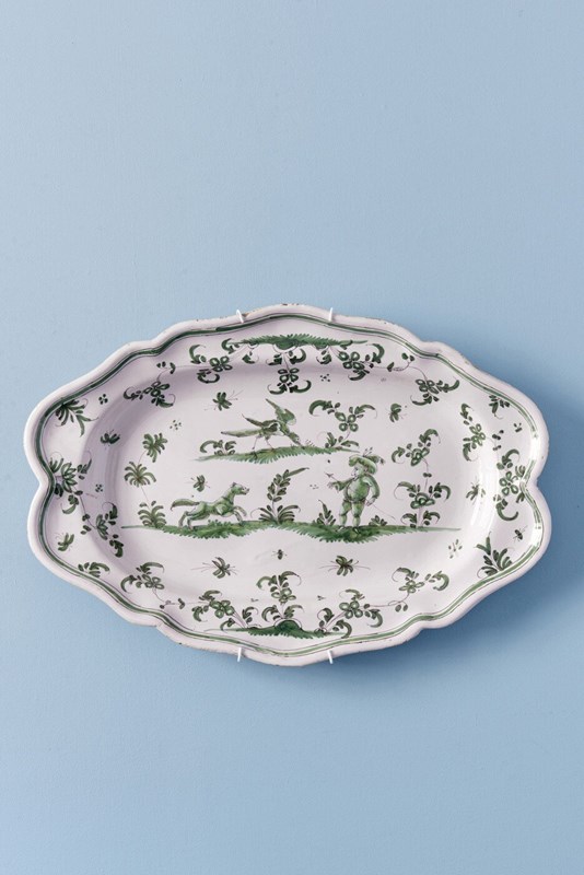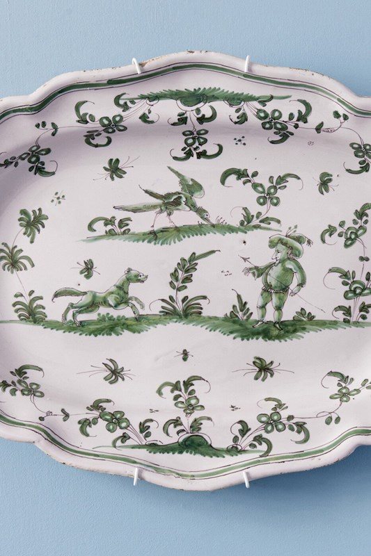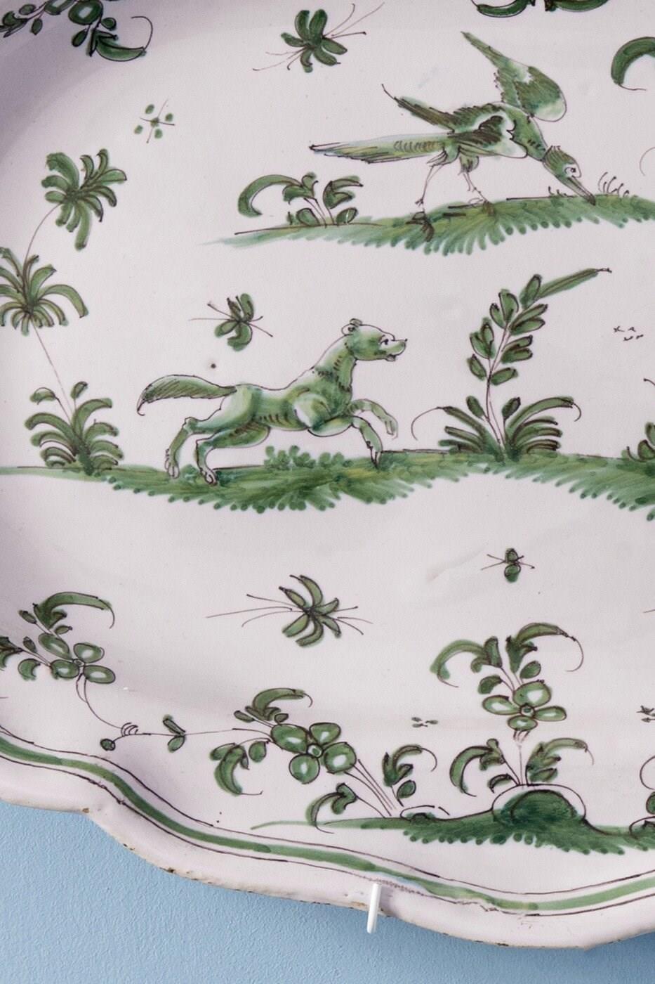 This mid-18th-century French faience dish from Moustiers, c. 1740–1760, is decorated in a harmonious camaïeu of greens with three grotesque figures. A man armed with a spear confronts a running hound within a lively landscape of bushes and flowers, surmounted by a large fantastical bird.