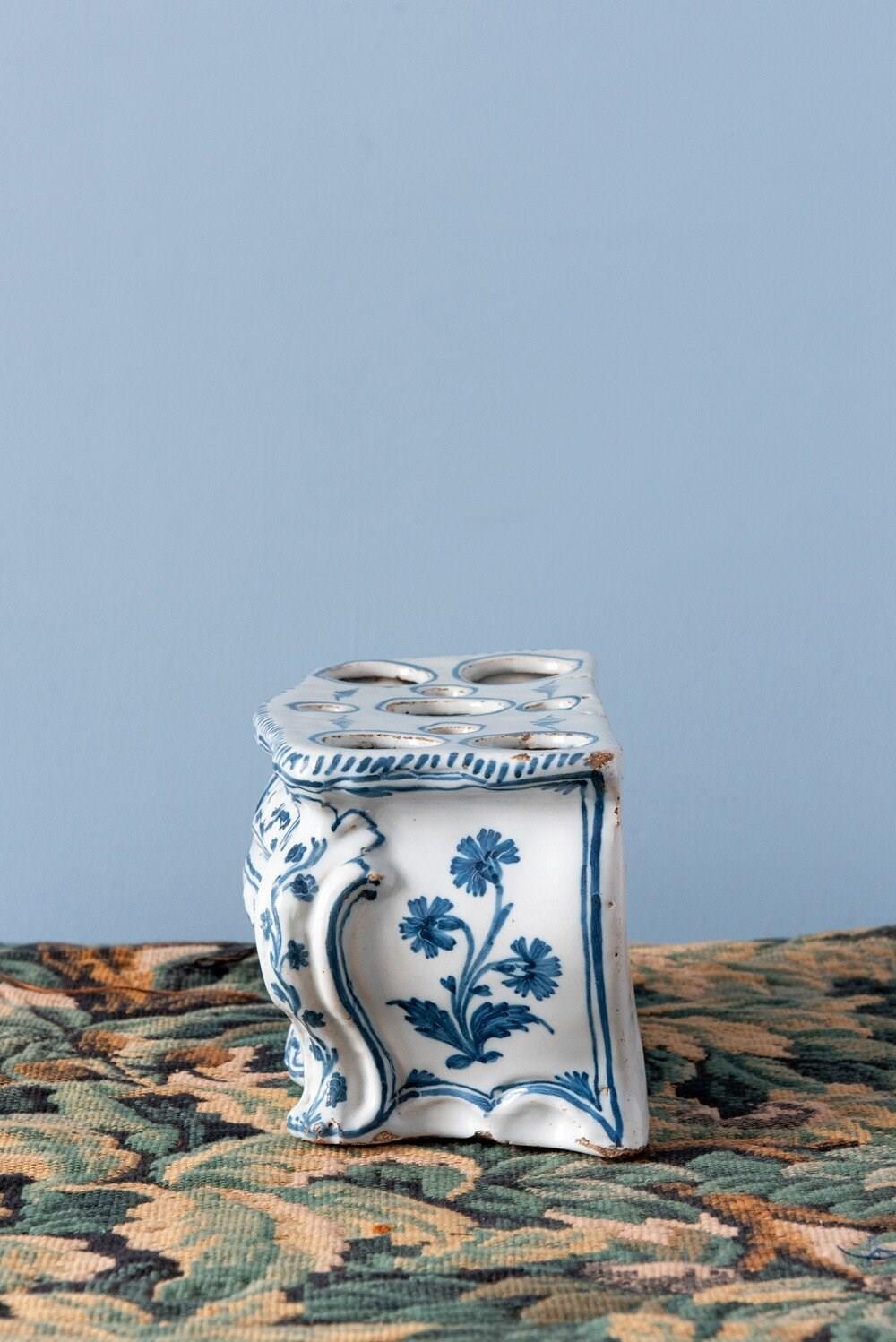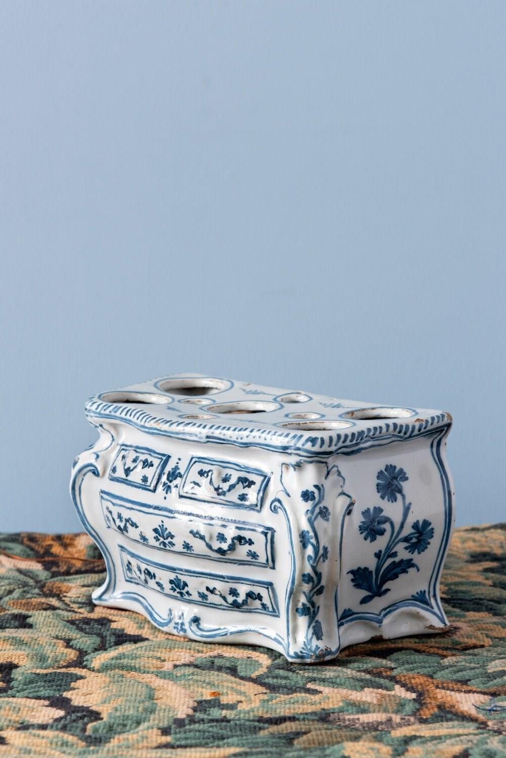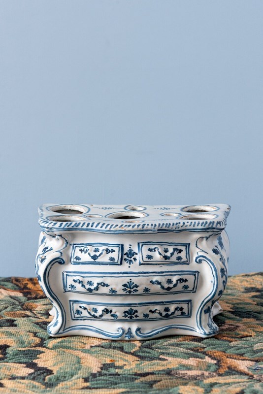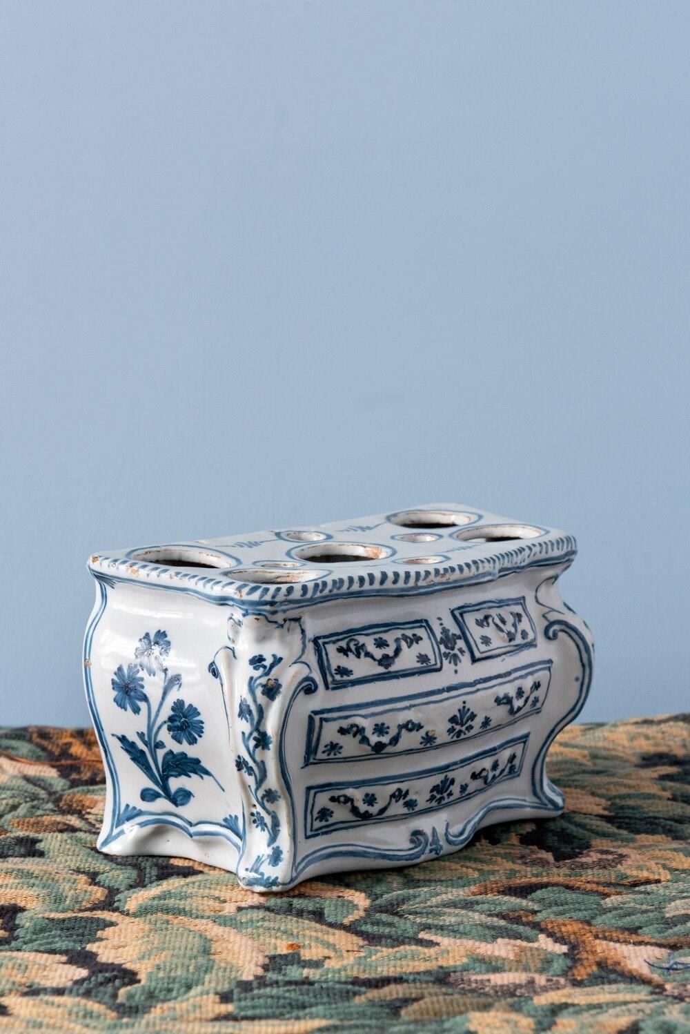 A rare 18th-century French faience bough pot from Nevers, modelled in the playful form of a commode. Complete with finely detailed drawers, handles and gilt-bronze accents, its rounded body is elegantly painted in timeless blue and white. The front features elaborate star patterns framed by scrolls and stripes, while each side is adorned with delicate sprays of flowers. Designed with five large openings and four smaller ones, this exquisite piece is perfect for elaborate floral displays and equally striking as a decorative object year-round.