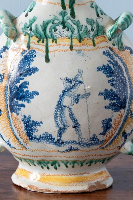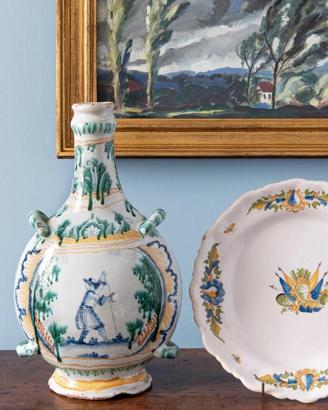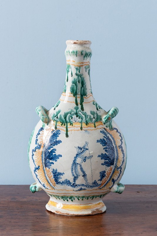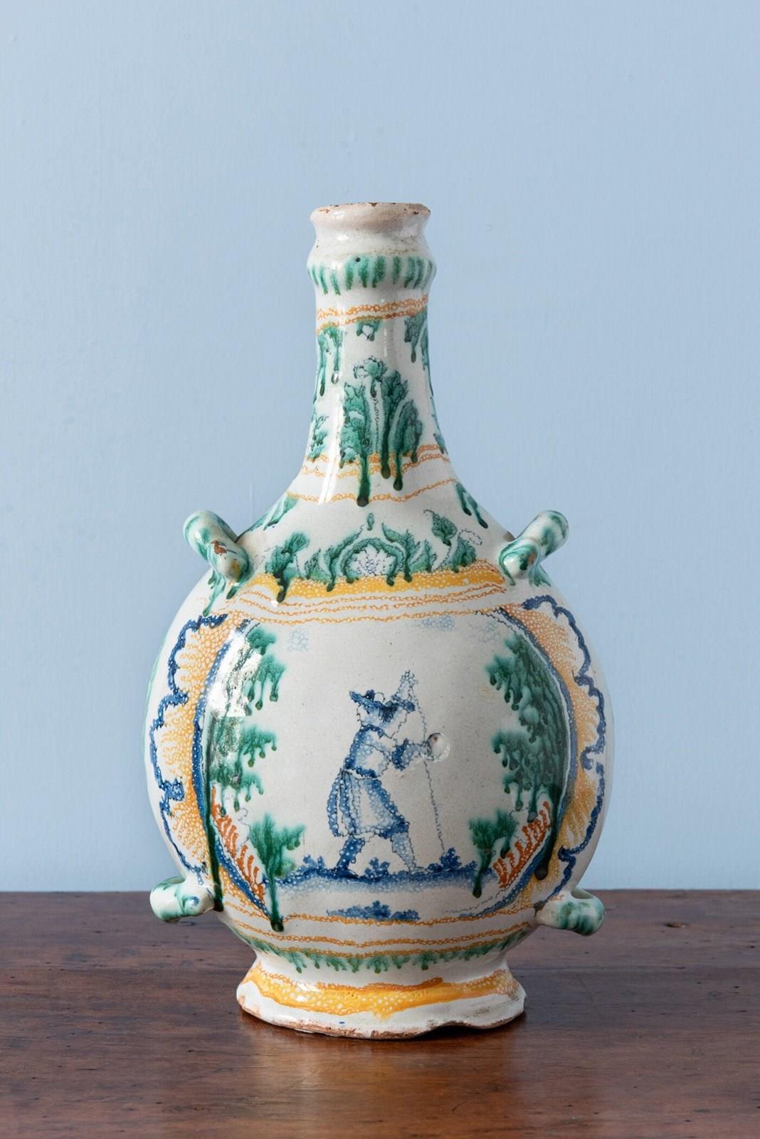 A mid-18th-century French faience bottle from Nevers, of elegant flattened form with rounded body, narrow neck and four handles. The decoration features blue figures surrounded by trees within a landscape, contained in reserves framed by foliate patterns in orange and blue. Abundant green foliate ornament adorns the sides and neck.