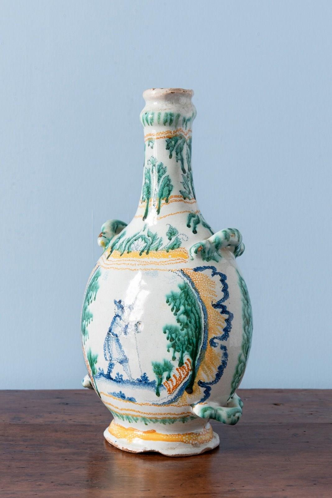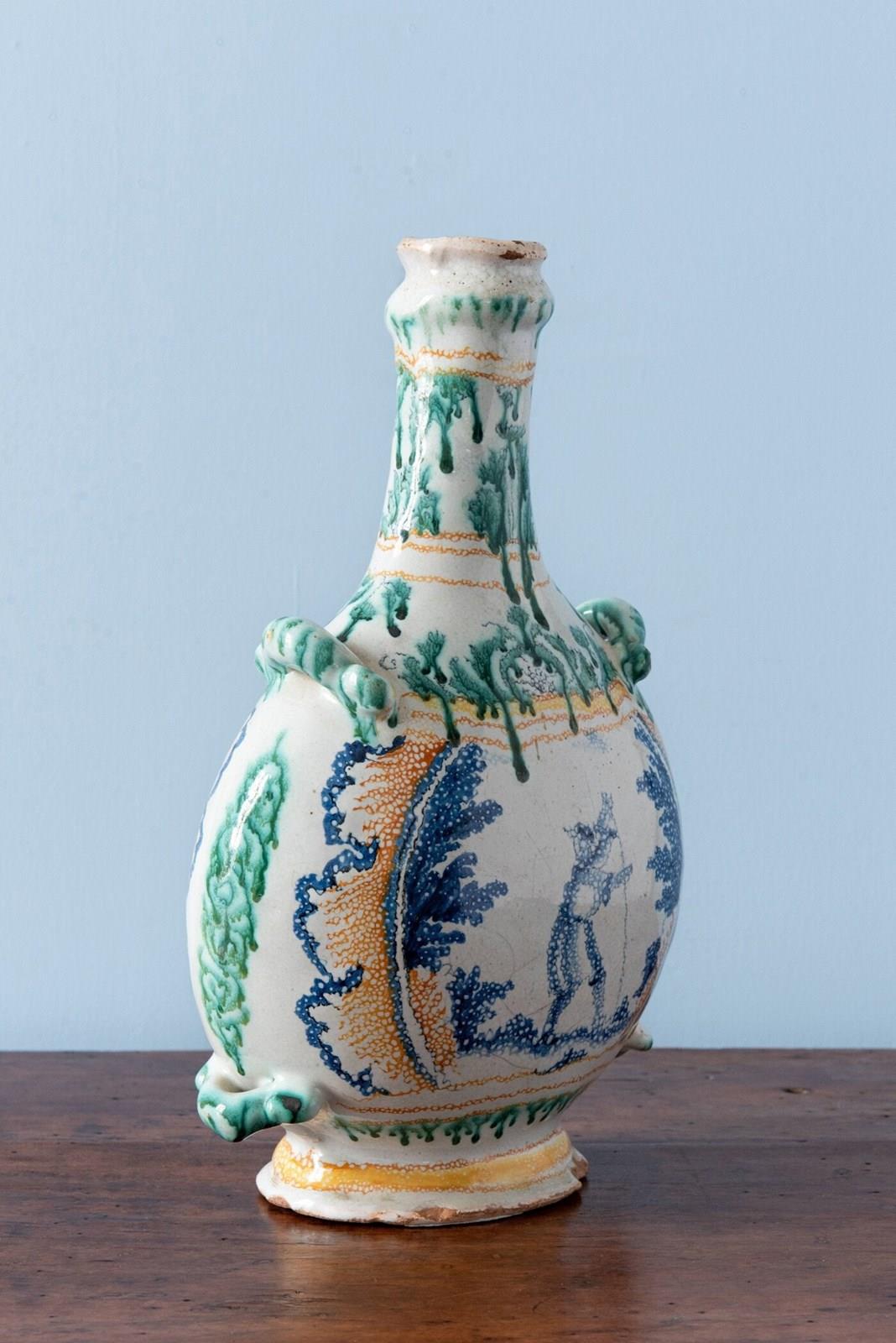 A rare bottle with vibrant colours, characterful decoration and sculptural presence.