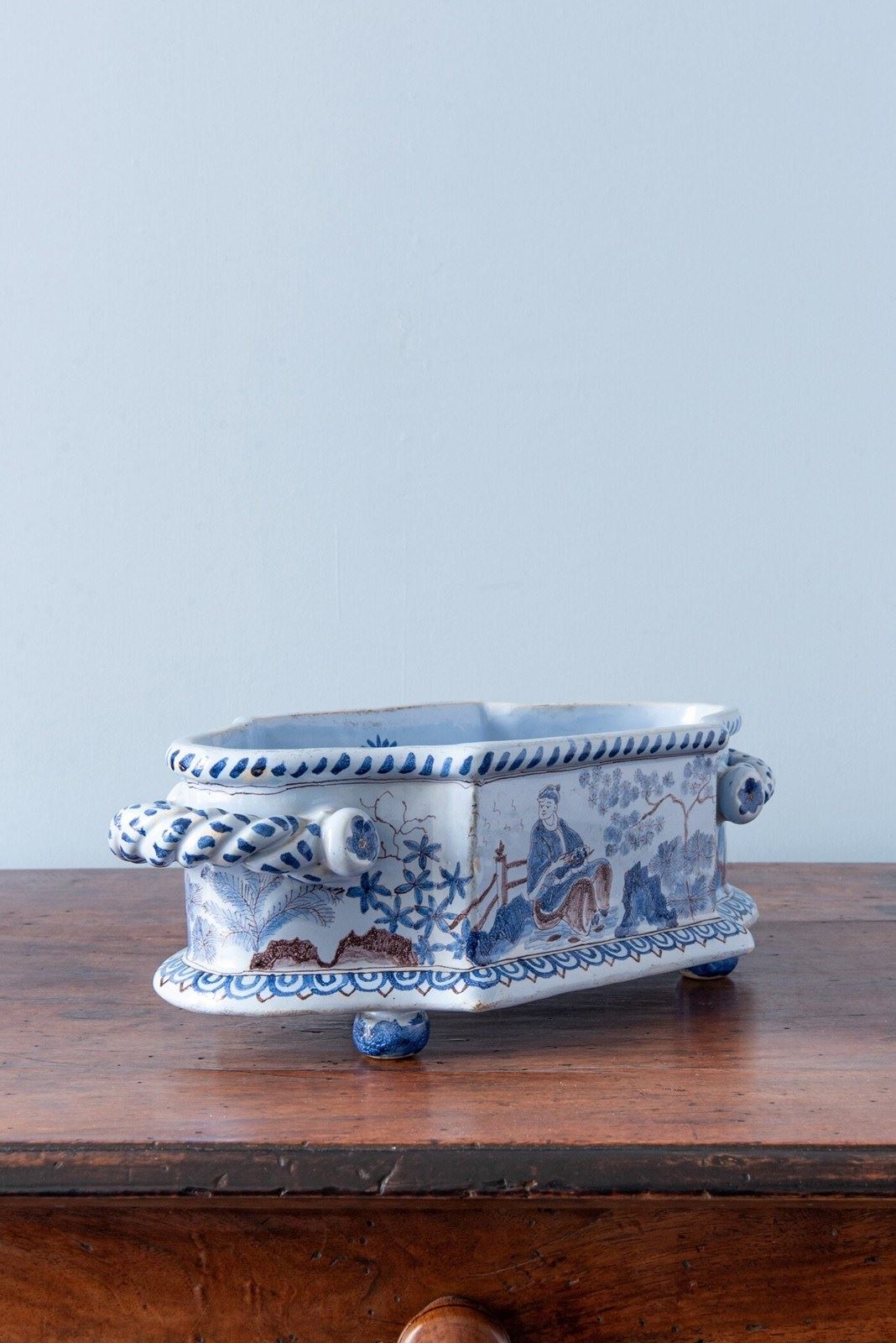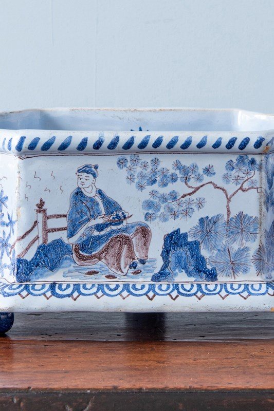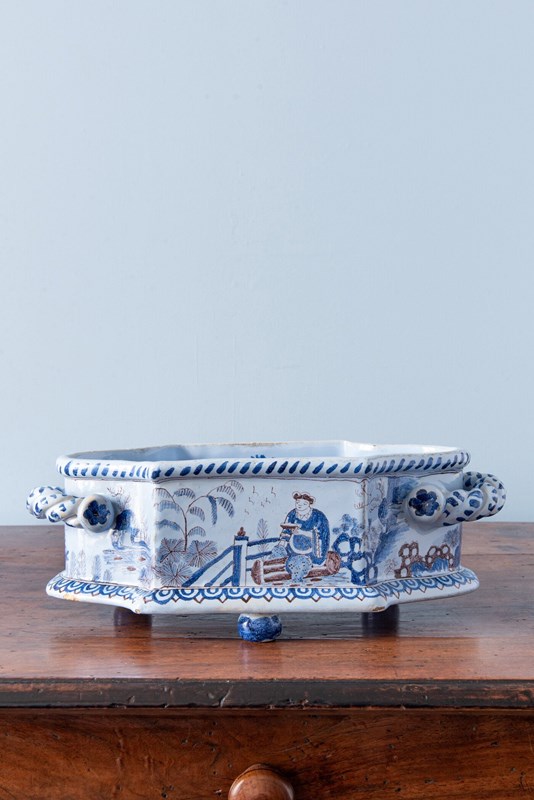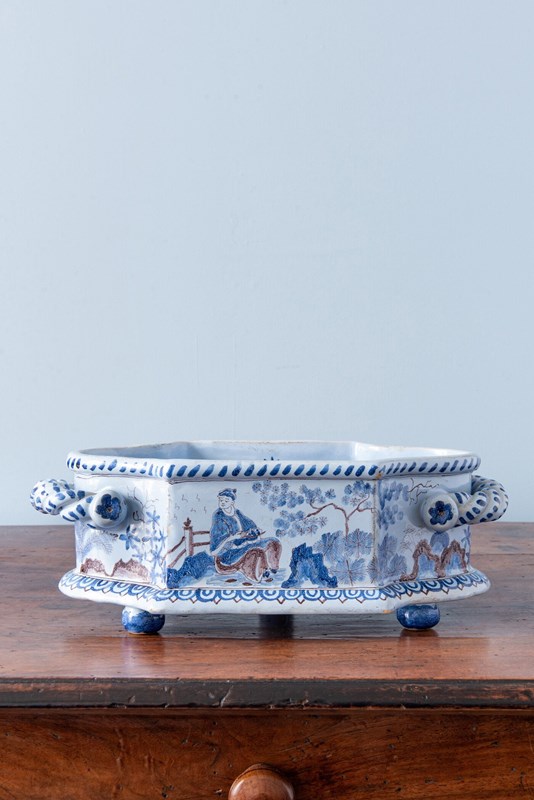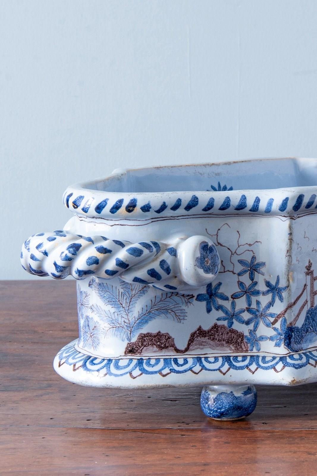 Nevers Faience, Chinoiserie Jardiniere With Twisted Handles, 19Th Century