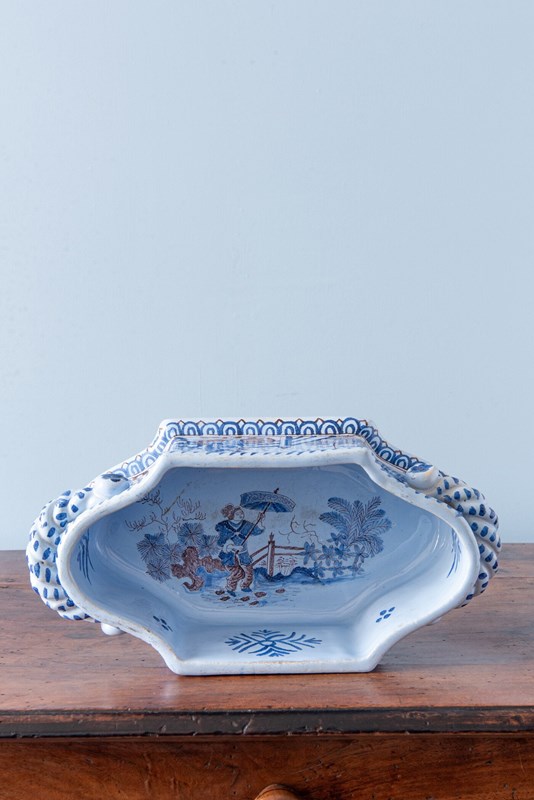 It is decorated in blue and white with manganese outlines, with chinoiserie scenes of figures on a bridge surrounded by trees, rocks and bushes. Blue dashes adorn the handles and upper body, while a frieze of egg-and-dart patterns decorate the lower part. A further chinoiserie scene and stylised floral ornaments are featured inside the vessel.