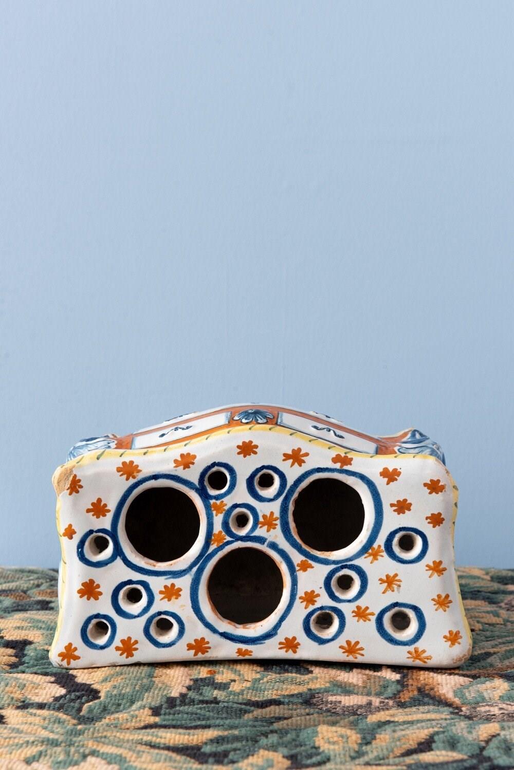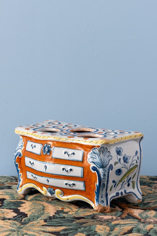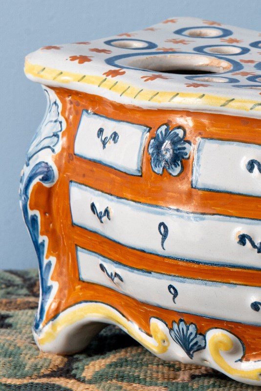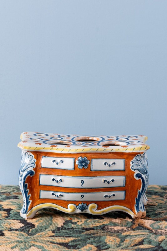 This rare 18th-century French faience bough pot from Nevers takes the playful form of a commode, complete with drawers, handles, and gilt-bronze accents. The rounded body is painted in vibrant orange, animated with blue scrolls and yellow framing lines. An imaginative array of patterns — from florals to stripes and stars — enlivens the surface, with sprays of flowers on each side and a top scattered with orange stars and blue circles. With three large openings and eleven smaller ones, this remarkable piece is ideal for elaborate floral displays and serves as a striking decorative object year-round.