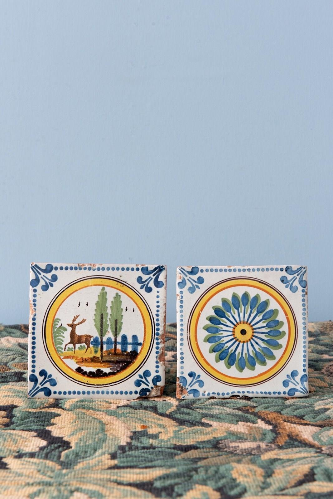 A pair of early 19th-century French faience tiles from the Manufacture de l'Autruche in Nevers. One tile features a stencilled deer surrounded by trees and a fence, the other a stencilled rosette, both contained within reserves surrounded by circular lines.