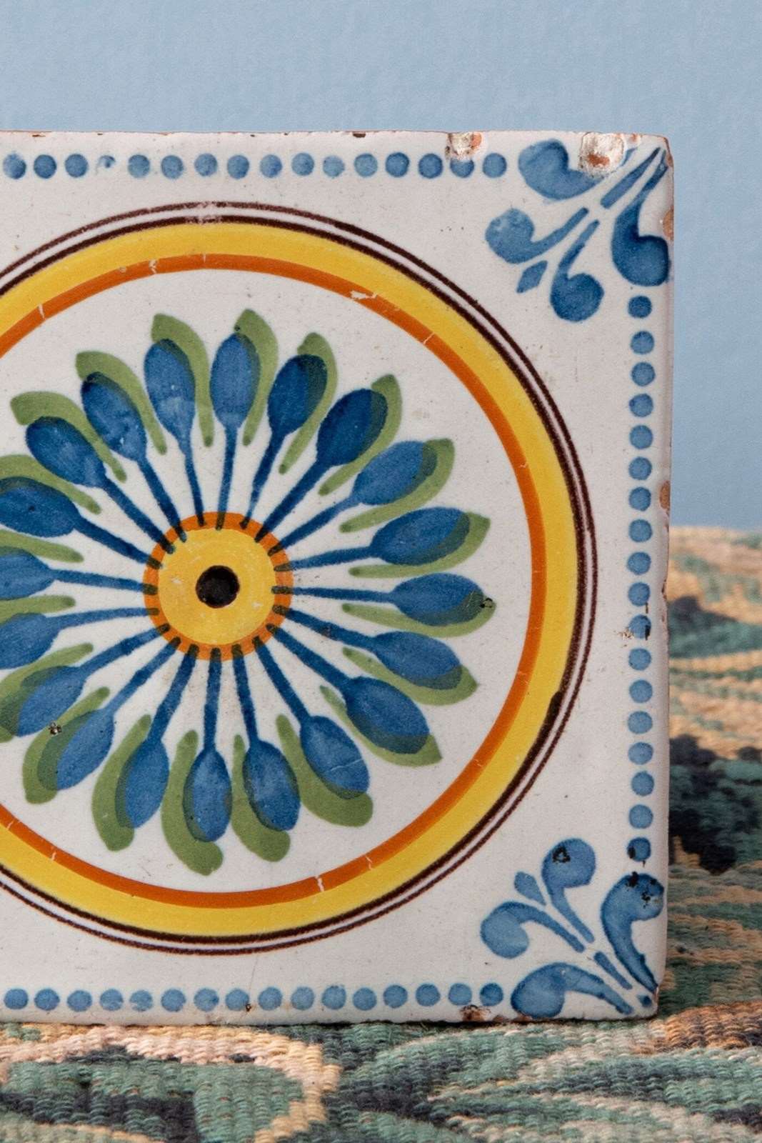 The edges are adorned with a frieze of blue dots and foliate ornament at the corners. The decoration employs a vibrant polychrome palette of blue, green, yellow and manganese. The combination of stencilled motifs with painterly brushwork lends a naive, characterful quality to the designs.
